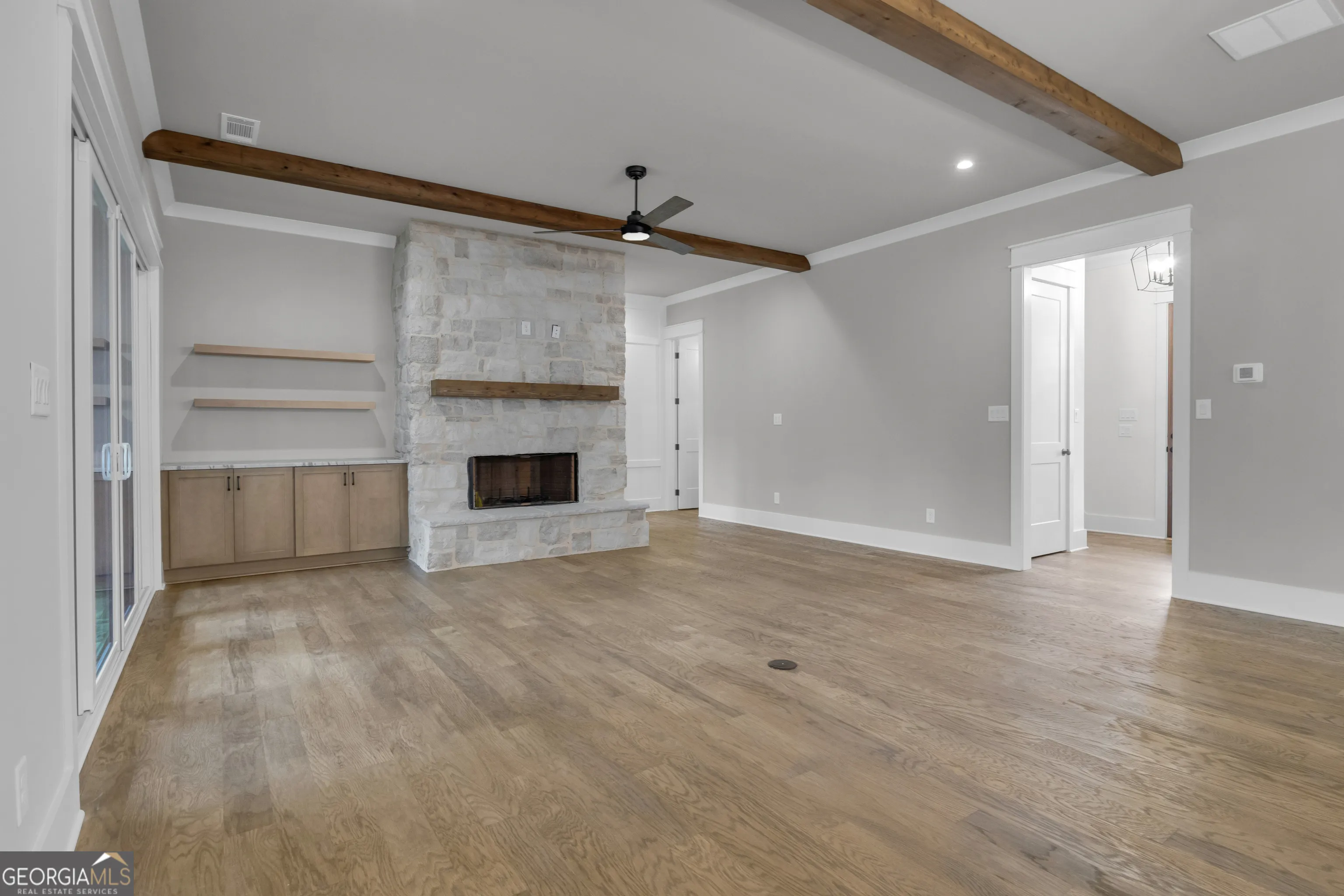 $20,000 Builder Incentive!!! Constructed by Johnston Homes, this classic farmhouse design is nestled into the quiet serenity of Senoia in the Grafton Subdivision. Your new home has been professionally designed with stone accents and a front porch with cedar columns. The grand entrance opens into the spacious living, dining and kitchen areas. The fireplace has a full height stone surround, complimented by rustic beams in the ceiling. Appointed with solid wood cabinetry, lasting for years to come. The kitchen is equipped with a stainless steel gourmet appliance package including electric smooth glass cooktop, wall oven, microwave and a low profile dishwasher. Custom granite and quartz countertops in the kitchen, laundry and baths. Enjoy the warmth of hardwood floors throughout all living areas, bedrooms as well as closets. The primary bedroom boast a cathedral ceiling with rustic beams, ensuite spa bath with both rain head and handheld showers and freestanding soaker tub. The owner suite also offers private access to the covered back porch with an outdoor fireplace, counter top and prep sink for ease when grilling. Plenty of space for family and guest with an additional guest bedroom with ensuite bath and powder room on the main level. The second level features a loft, two bedrooms, two baths and a playroom / bonus area. All baths and laundry are adorned with modern black plumbing fixtures. A three-car garage gives ample room for cars and golf cart that has an entrance into a drop zone area with wainscoting and a built in mud bench. Not only will you love living in Grafton, but you have an option to join The Reserve at Keg Creek HOA ($350) and have access to all their amenities which include a pool, pickle ball courts and nature trails! Quick golf cart ride to downtown Senoia which has several stores to shop in and a variety of places to eat! Come out and take a look today!!