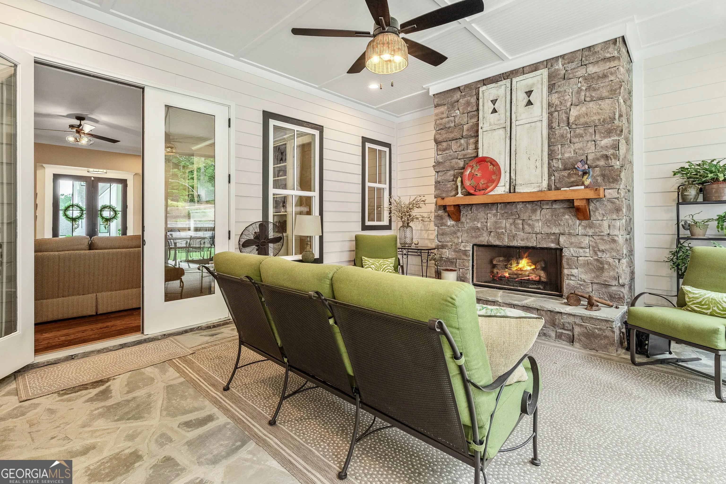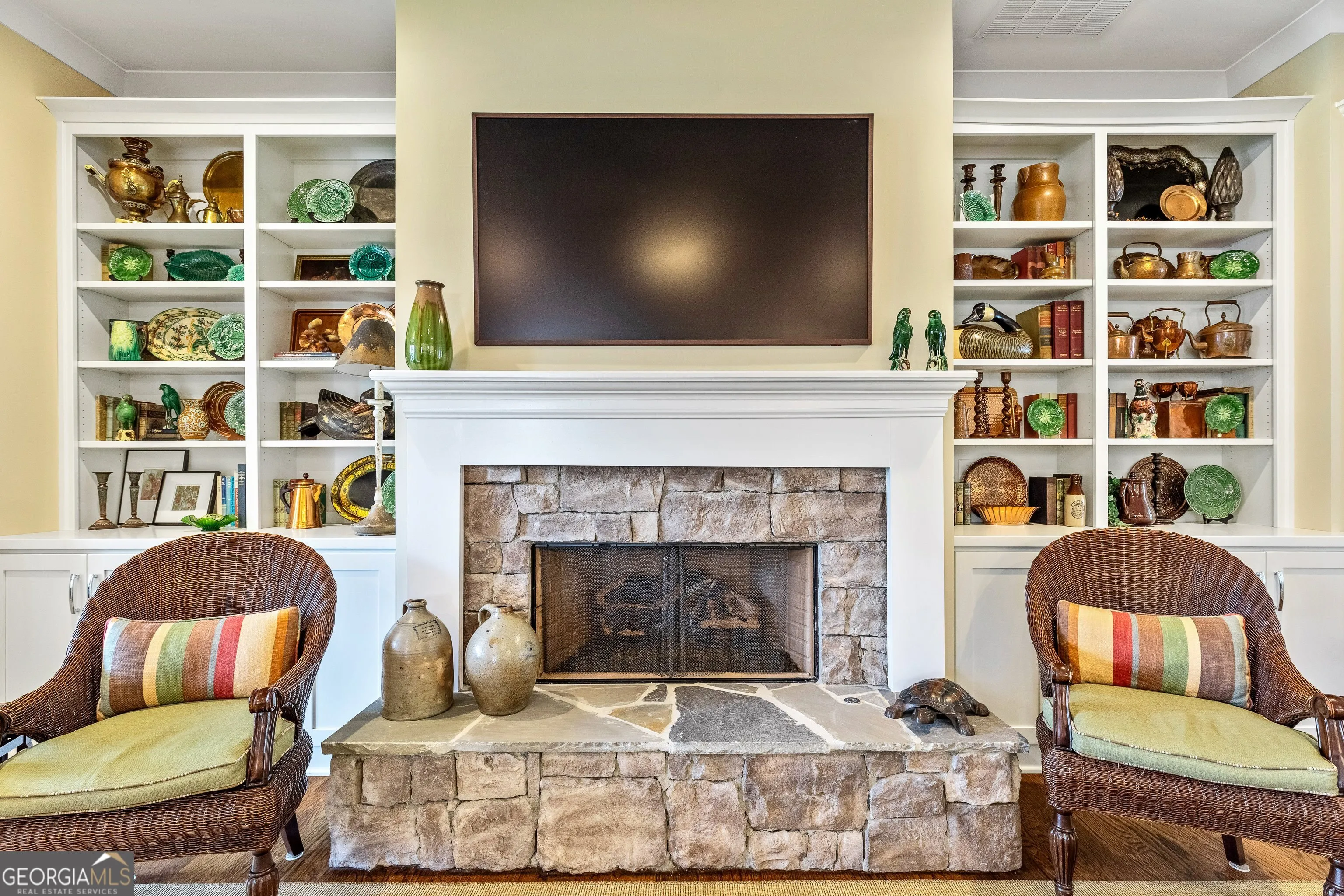 BETTER THAN NEW! THIS AMAZING HOME IN GRAFTON IS PERFECT IN EVERY WAY! Truly custom built with designer finishes, lighting, and wallpaper throughout, there is simply no detail overlooked! Exceptional features include an open floor plan with family, dining and kitchen open to each other, site finished hardwood floors, plantation shutters, custom closets, spray foam insulation, and tankless hot water heater. From the front porch, you’ll enter the home and off the foyer is a powder room and butler pantry with built in cabinetry. Ahead is the family room with gas fireplace with stone surround, flanked by built in cabinetry. The family room is open to the oversized dining area and culinary kitchen featuring quartz counters, herringbone backsplash, farm sink, double wall ovens, 5 burner gas cooktop, and serving area! Off the dining room is a bar area with a wooden top and beverage refrigerator. The back entry has custom cabinetry, pantry, and the stunning laundry room – laundry will never feel like a chore again! The primary suite on the main level has a sitting area and a fantastic bath room with free-standing tub, frameless shower, double vanity, wallpaper, and custom closet. Rounding out the main level is a guest suite with en suite bathroom and built in desk area – so it can double as a work from home office! Off the family room is a large screened porch with blue stone flooring and outdoor stone fireplace. The blue stone spills from the screened porch onto the patio, perfect for dining al Fresco! The back yard has lush landscaping and is completely fenced in! Back inside, the upper level has 2 more generously sized bedrooms and a common den area with built-in bookshelves and hardwood floors. You’ll also find walk-in attic space providing abundant storage and since the home features spray foam insulation, the climate in the attic is moderate year-round! This home is conveniently located to downtown Senoia, a short walk or golf cart ride will allow you to enjoy all that Senoia has to offer – Saturday Farmer’s Market, Alive After Five, Car Shows, dining, shopping and so much more!