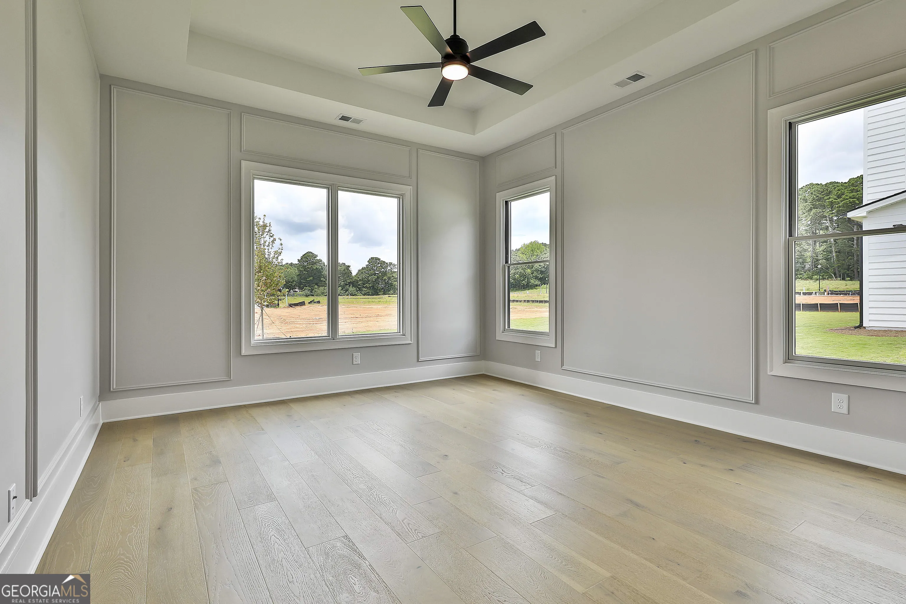 Caray F New Construction in Peachtree City – Move-In Ready! This home offers three spacious bedrooms on main level to include the owners suite and three full bathrooms and a powder room. The gourmet kitchen features high-end appliances, quartz countertops, a gas cooktop, custom wood vent hood, and ceiling-height cabinetry, along with an extended peninsula perfect for entertaining. The kitchen opens to a bright great room with picture windows that bring in natural light and showcase the backyard. The primary suite includes large picture windows, dual vanities, upgraded quartz countertops, a soaking tub, tile shower, and a walk-in closet with a custom system. The split-bedroom layout offers privacy and functionality, with two additional bedrooms and a full bath on the second floor. Enjoy the extended covered patio with a cozy outdoor fireplace, ideal for gatherings. Gas lanterns at the front and along the street enhance the home’s charm and curb appeal.