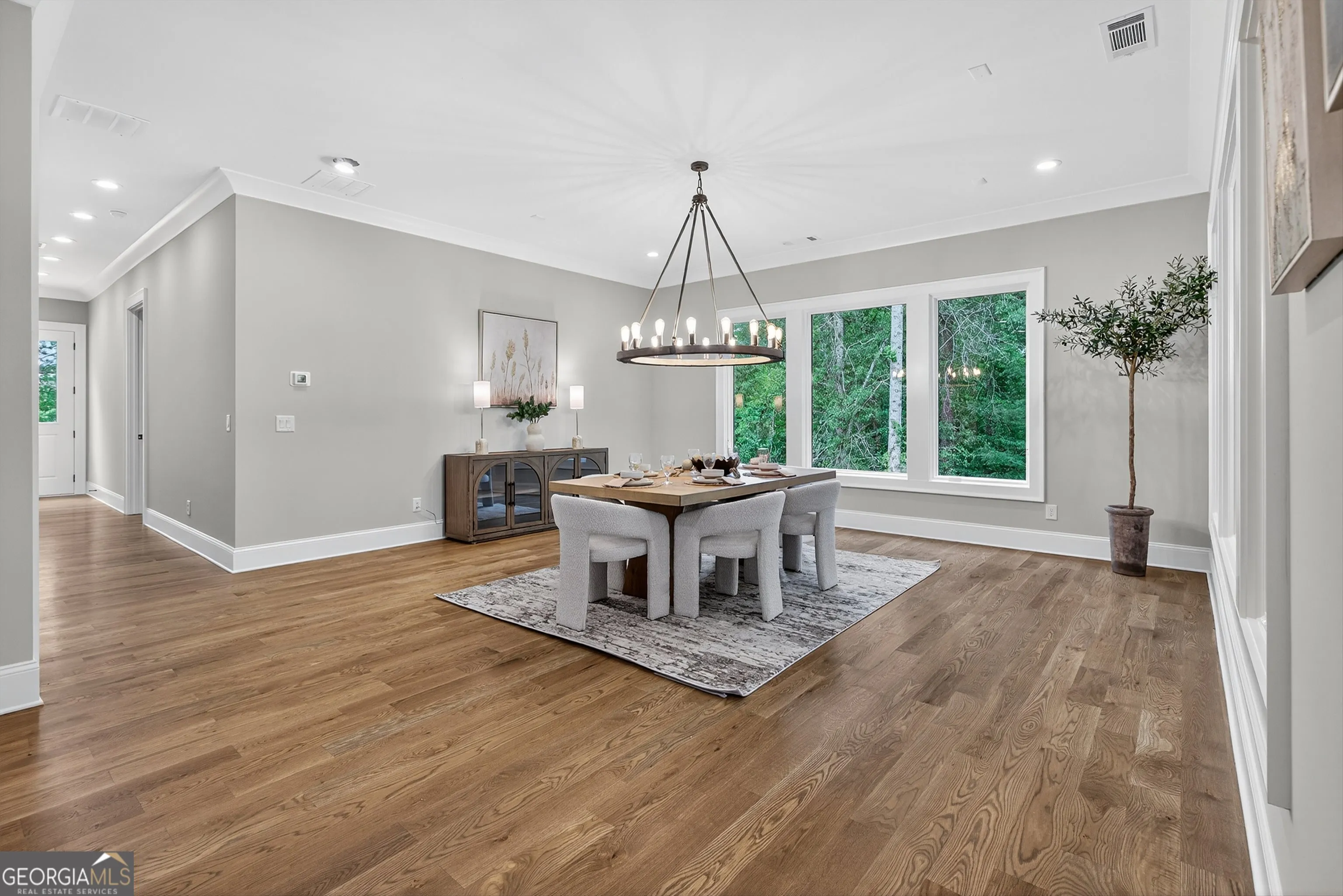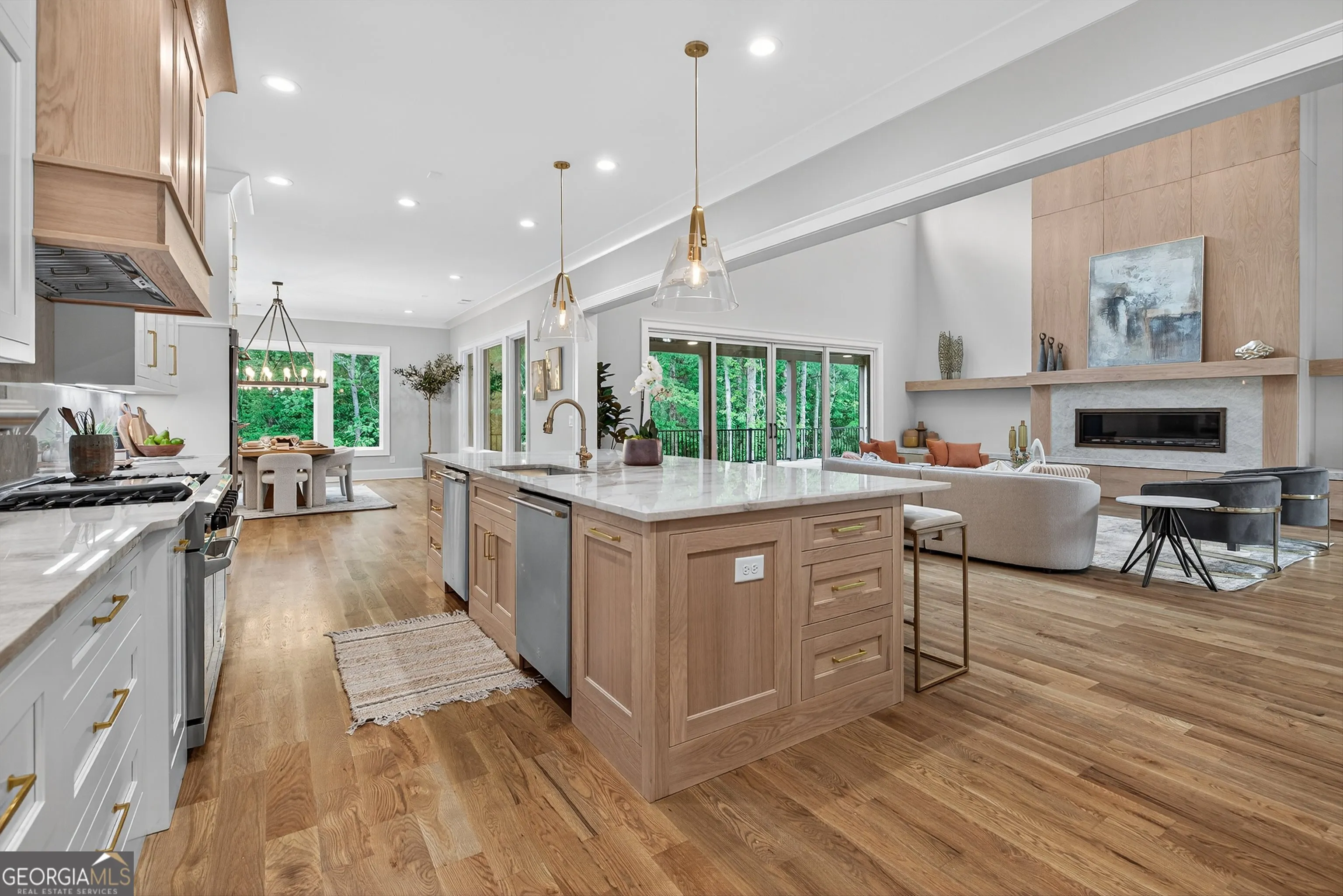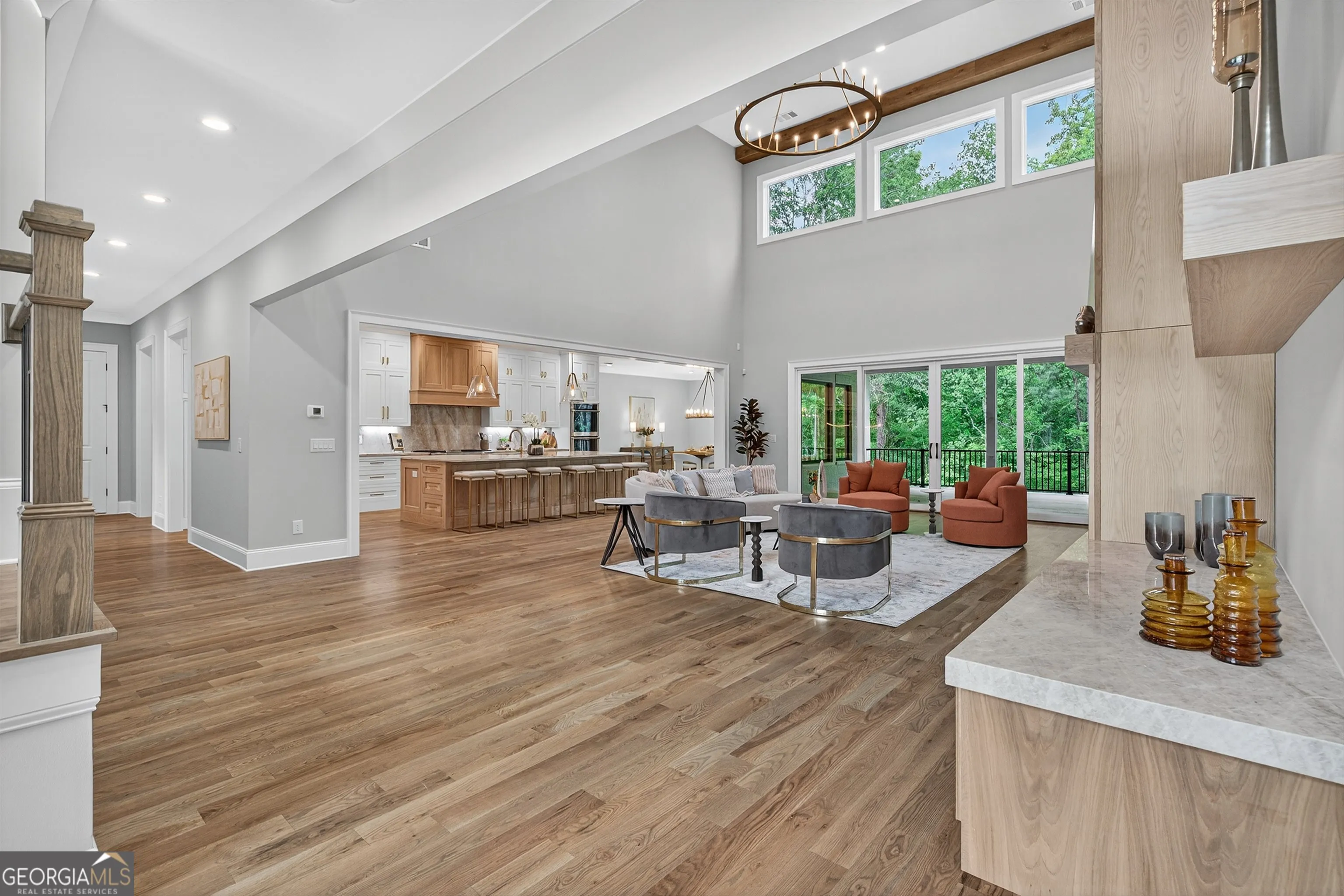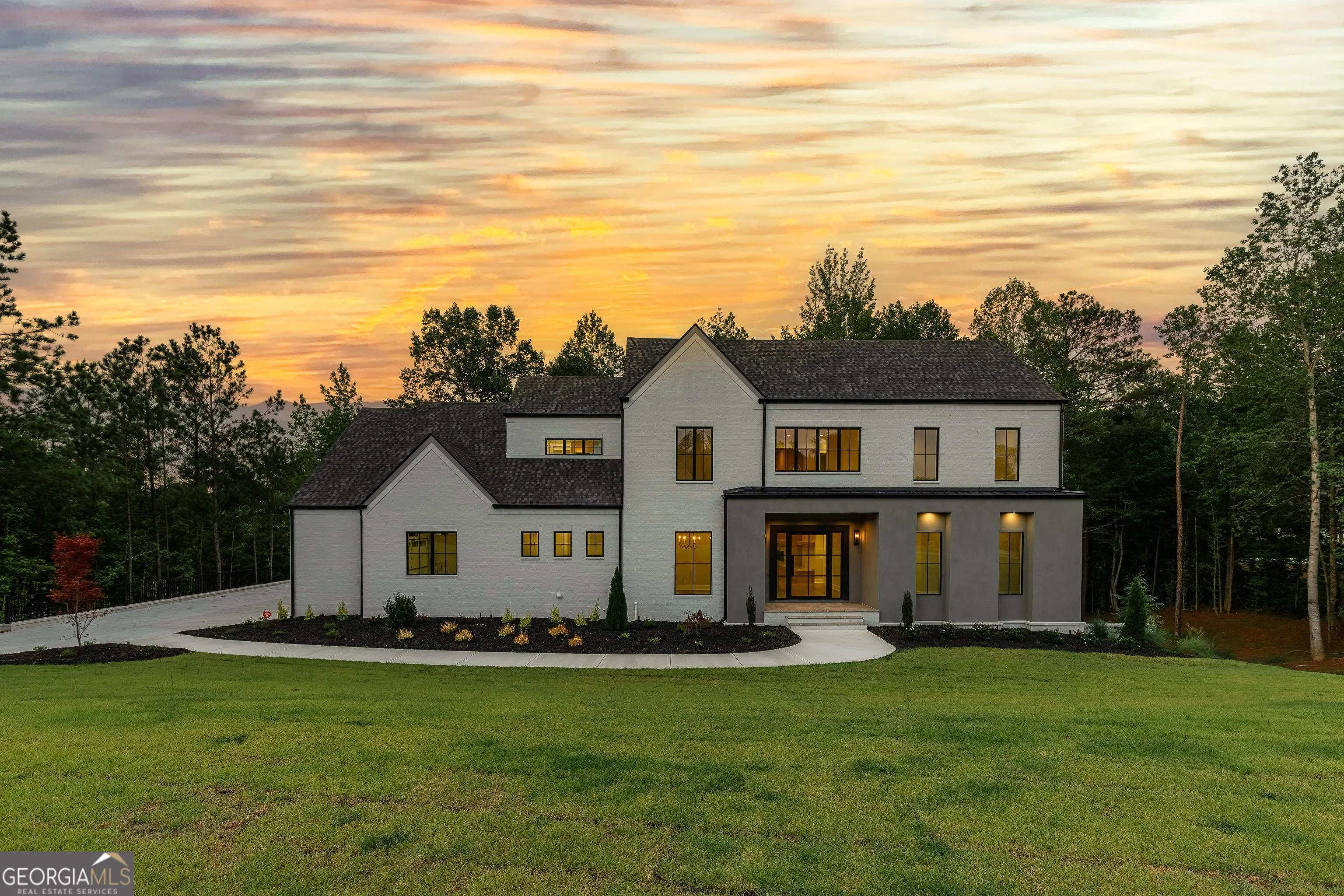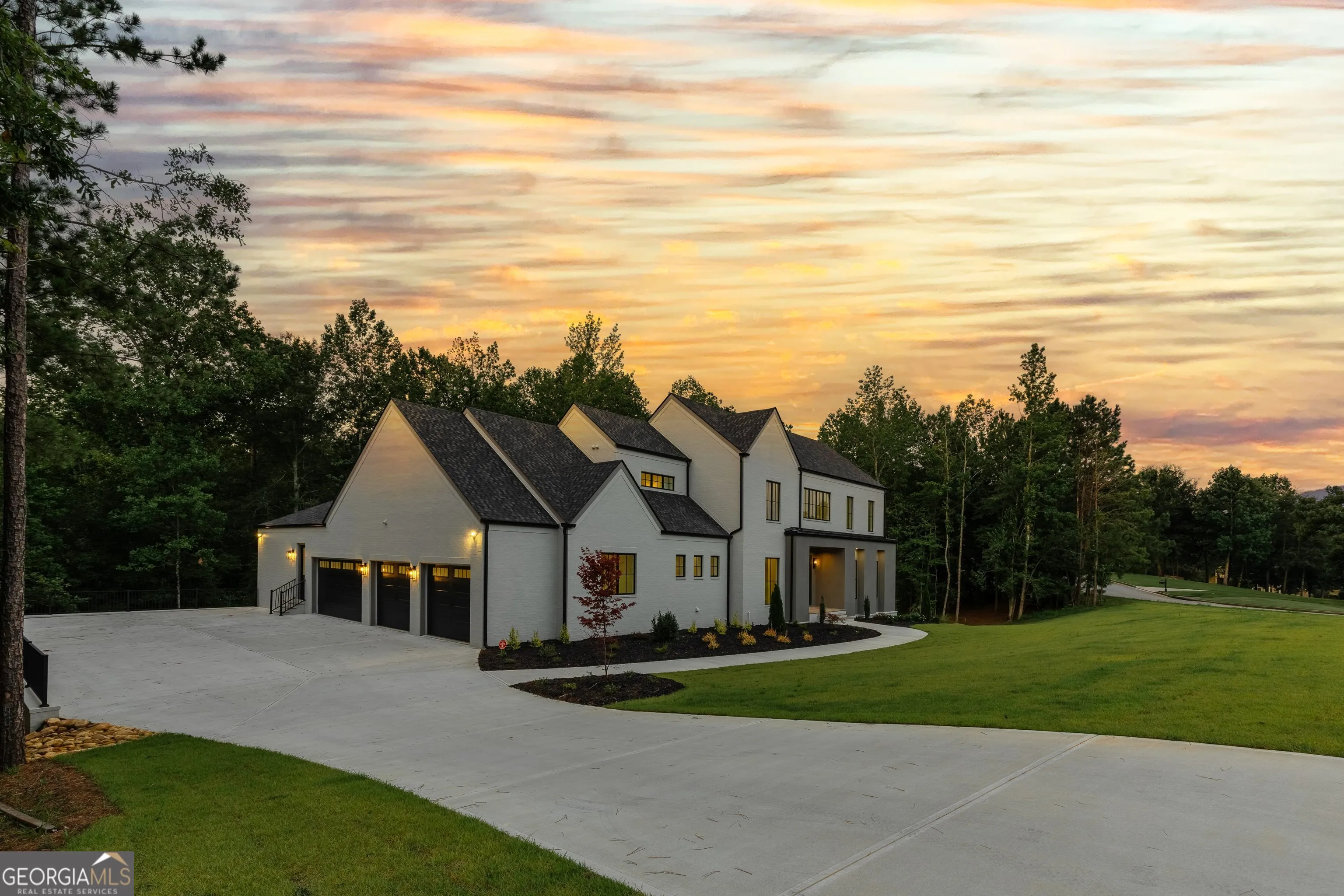 Welcome to this stunning new construction custom home crafted by Abernathy Custom Homes and perfectly situated on 1.78 acres in the prestigious Arbor Springs community of Newnan. This thoughtfully designed residence offers over 5,400 square feet of luxurious living space with five bedrooms and five and a half bathrooms, blending timeless craftsmanship with today’s modern functionality. From the moment you arrive, the all-brick exterior and covered front entry create a grand and lasting impression. Step inside your custom front doors to a soaring foyer and discover an open, light-filled layout that flows seamlessly from one space to the next. The heart of the home is the extraordinary gourmet kitchen, designed with both everyday functionality and upscale entertaining in mind. Outfitted with premium Electrolux appliances, this space features an oversized gas range with eight burners and a center griddle with double ovens, a custom vent hood, a built-in wine fridge, a large side-by-side refrigerator and freezer, built-in microwave, and two dishwashers for maximum convenience. The expansive island offers ample seating and prep space, while lower cabinets are thoughtfully designed with abundant drawer storage for practical use without sacrificing style. Privately tucked behind the main kitchen is a hidden prep kitchen, complete with pantry space, additional cabinetry, an extra sink, and two beverage refrigerators-perfect for catering, entertaining, or keeping everyday clutter out of sight. Every detail has been considered to elevate this kitchen to a true chef’s dream and a showpiece for the home. The living room is breathtaking, featuring soaring vaulted ceilings that create an airy, open feel and draw your eye upward to the dramatic wood-accented fireplace wall, which extends all the way to the ceiling for a bold architectural statement. Custom built-in storage with sleek drawer systems lines the wall beneath the fireplace, blending style with functionality. A full wall of sliding glass doors spans the rear of the living room, flooding the space with natural light and providing seamless access to the expansive back patio. From here, you’ll enjoy peaceful views of the wooded landscape beyond-offering a private, picturesque backdrop that feels like your own retreat. The main level also includes a formal dining room, a flex space ideal for a home office, den, or playroom, a large laundry room with built-in space for lifted front loading appliances, and abundant cabinet and storage space. You’ll also find a guest suite, tucked privately at the back of the home with it’s own private ensuite with beautiful tiled shower. The luxurious owner’s suite provides a private retreat with spa-like features including a frameless glass shower with multiple shower heads and space and plumbing to add in a soaking tub if desired, dual vanities with abundant cabinet space, and a generous walk-in closet ready for your total customization, courtesy of the builder. Upstairs, each of the secondary bedrooms is oversized with its own en suite bath and walk-in closets with custom shelving, offering comfort and privacy for family or guests. High-end finishes abound throughout the home, including white oak wide-plank hardwood flooring, designer tile, upgraded lighting, detailed millwork, and coffered ceilings that add depth and character to every room. Beyond the beautifully finished living space, this home presents exciting opportunities to personalize even further. The expansive unfinished terrace level offers room to create a custom basement with a home theater, fitness studio, bar, guest suite, or additional living space. It features 12 foot ceiling and a plumbed in bath, ready for your own ideas. Located in Northgate school district and close to golf, shopping, and dining, this exceptional home offers a rare combination of luxury, customization, and location.