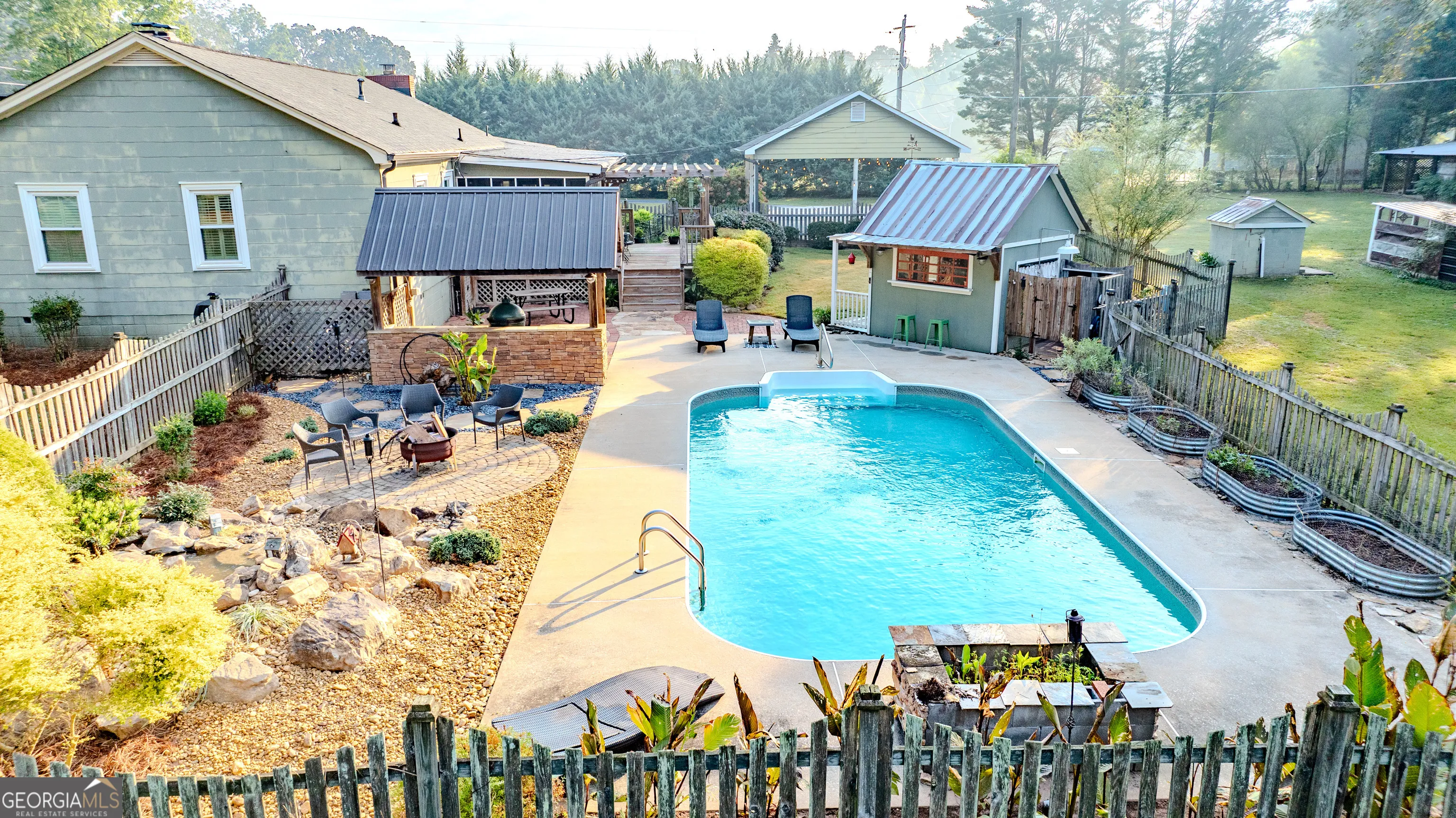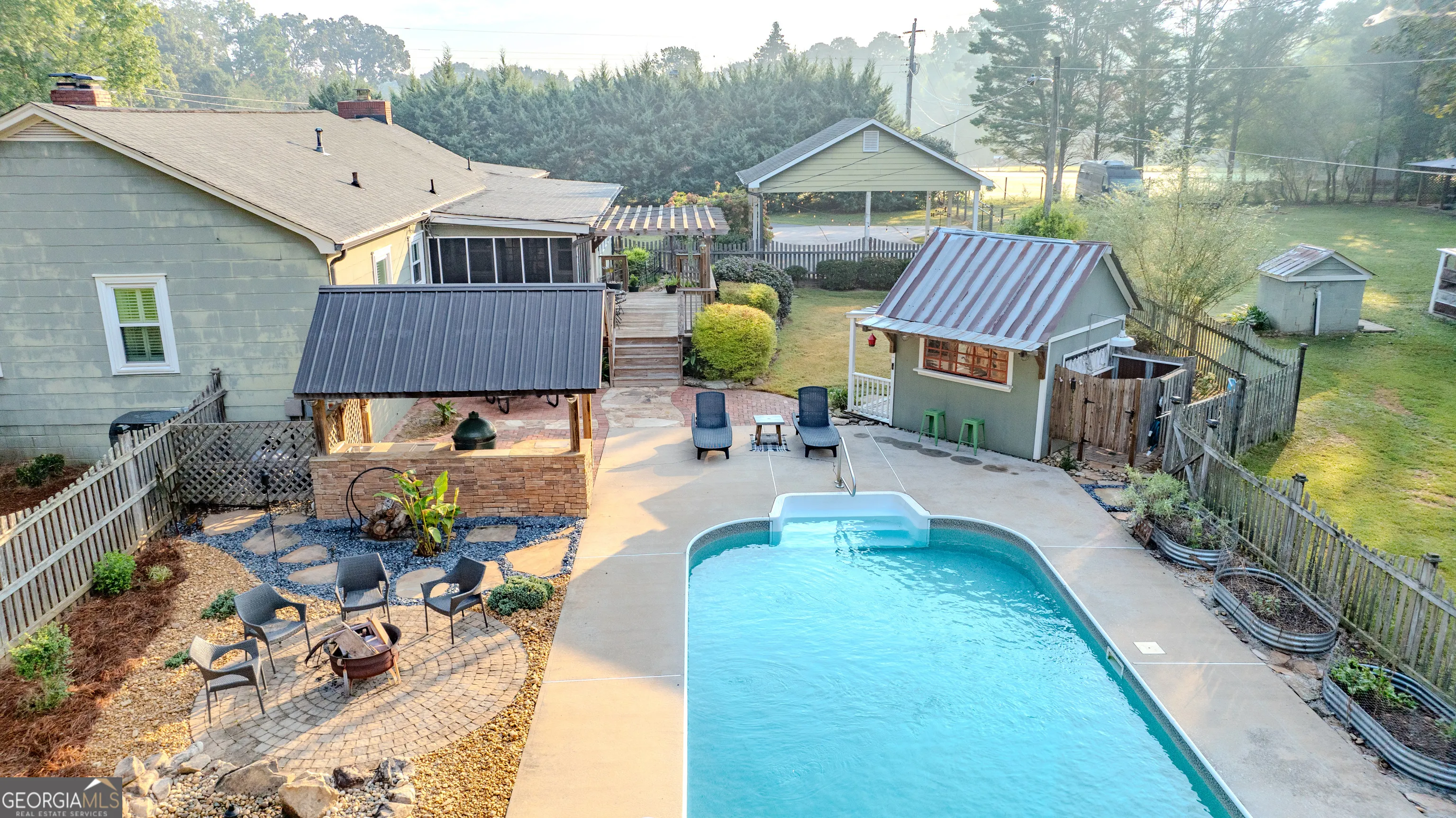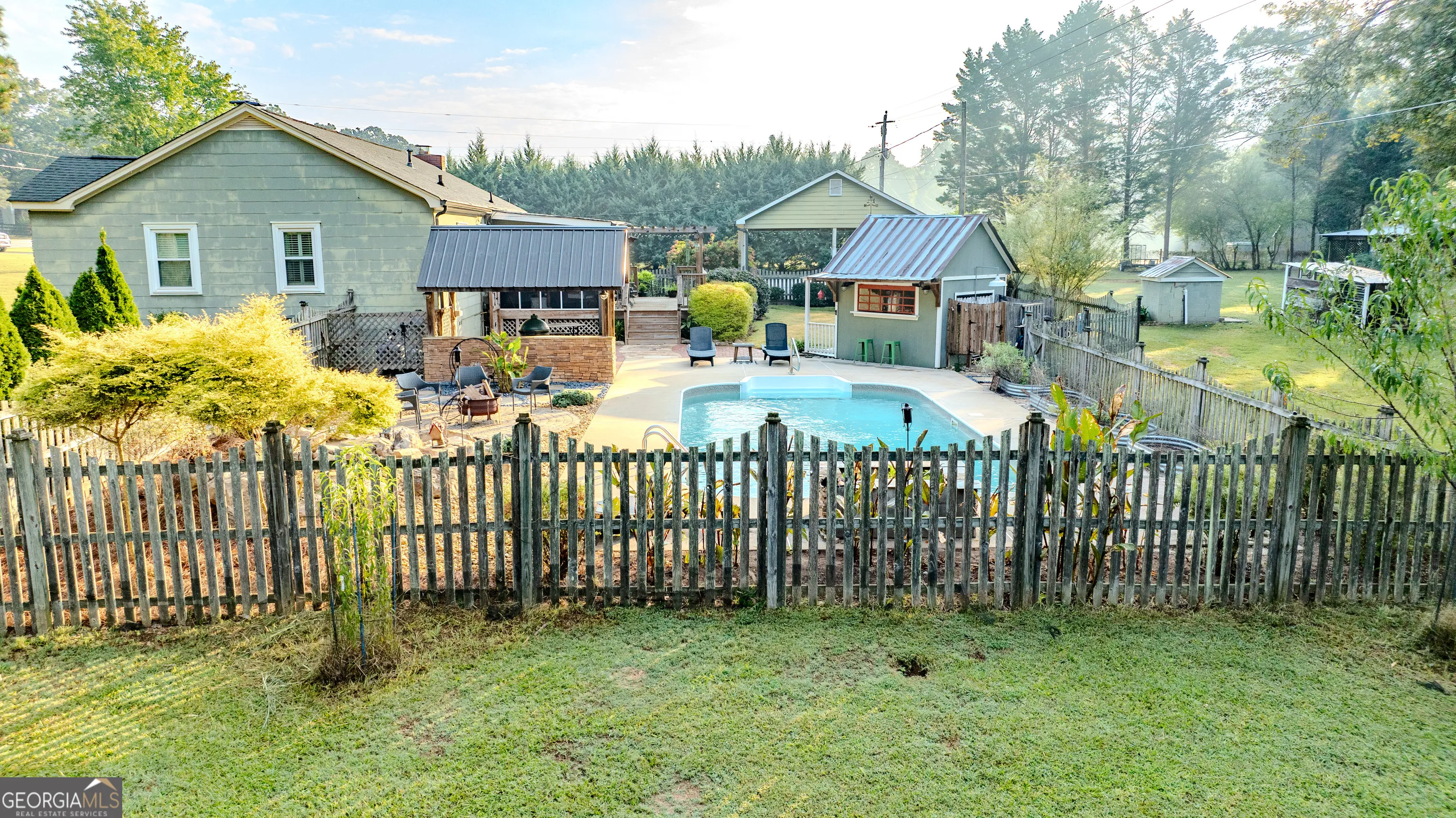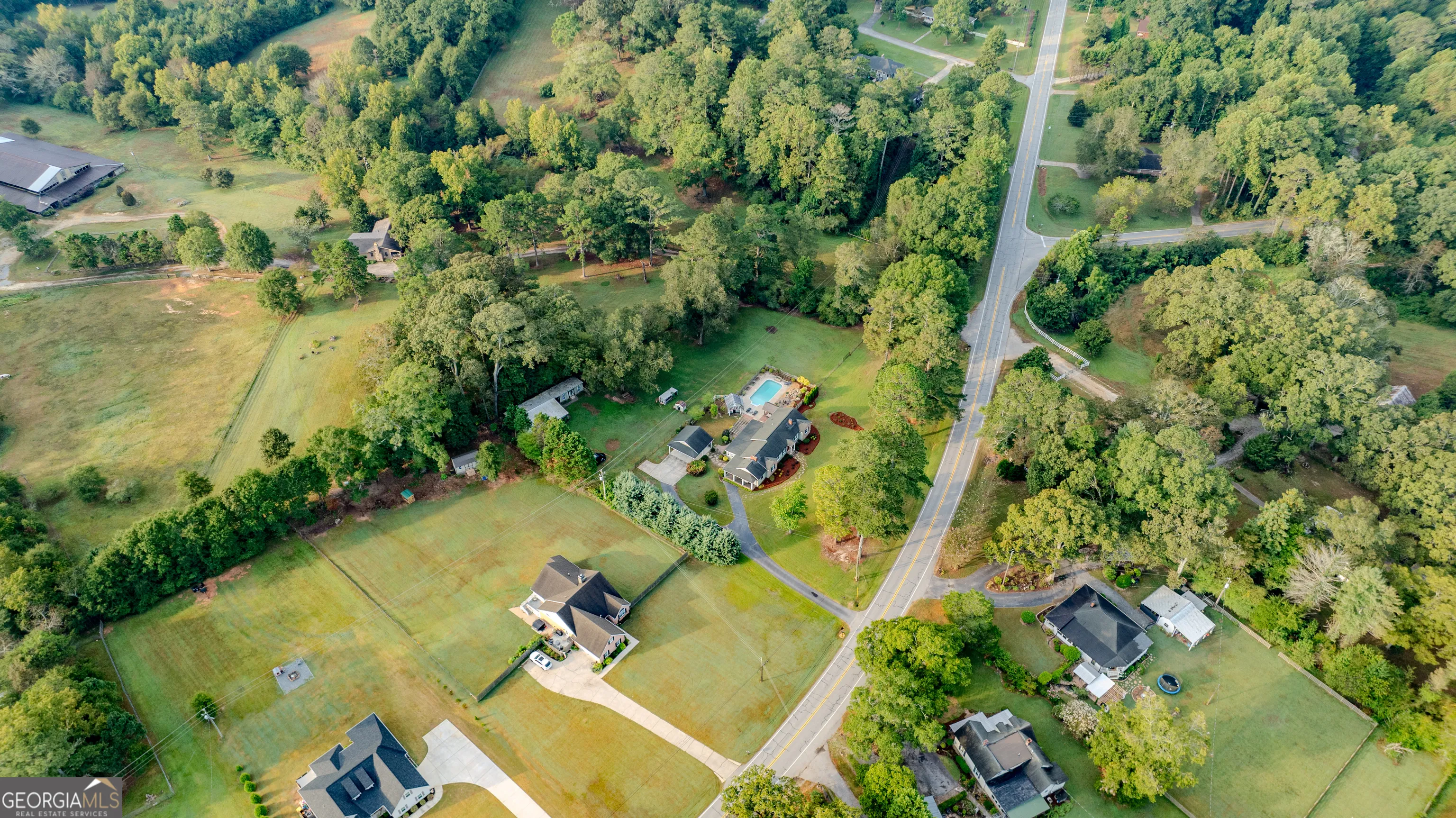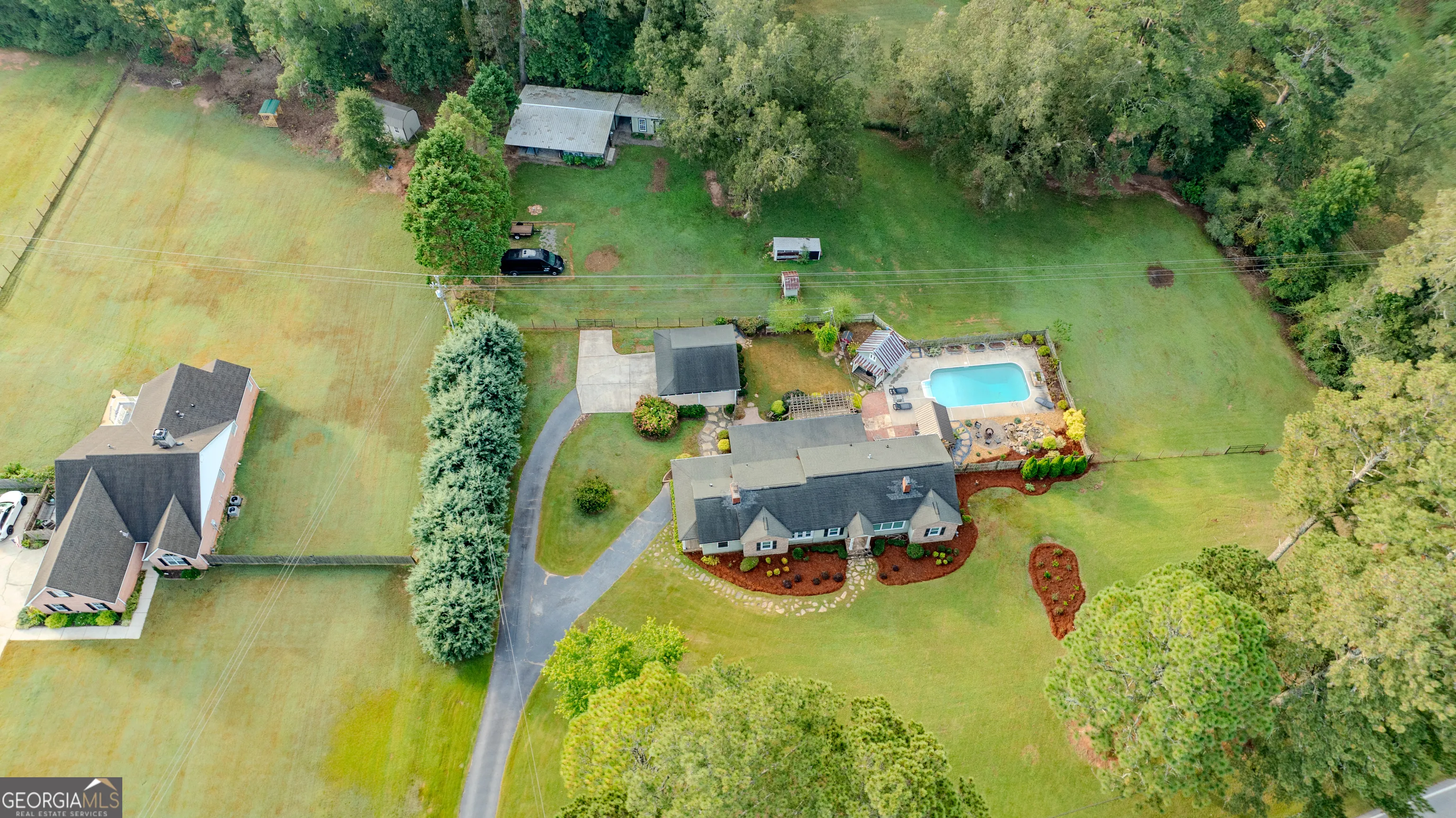 NEW ROOF! NEW SEPTIC SYSTEM! BEAUTIFUL FARMHOUSE WITH A POOL ON A SPACIOUS AND PRIVATE TWO-ACRE LOT. Gorgeous hardwood floors, plantation shutters, updated kitchen with marble countertops, new appliances and fixtures, beautiful cabinets, large island, coffee nook, living room with brick fireplace, built-in bookshelves, separate dining room with built-in china cabinet, glass transoms, beadboard ceilings, big den w/ lovely natural light, powder room with laundry in hall. Roomy master bedroom with brick, wood-burning fireplace, exposed beams, fantastic master bath with walk-in tiled shower, soaking tub, walk-in closet with built-ins, private entrance to wrap around porch. Split bedroom plan with nice-sized bedrooms. Screened porch off back foyer entrance. New 6mil moisture plastic barrier in the crawl space. Foam insulation in crawl space and in the attic. All windows are new energy saving windows. Backyard oasis with back deck with pergola, 16 x 32 pool, outdoor kitchen, pool house, speakers, outdoor shower, fire pit area, waterfall, fenced backyard, chicken coops, kennel, workshop, with power (240 amp), barn with stables, storage space, ample parking for RV. Enjoy life in the country while being close enough to downtown Newnan, Ashley Park and I-85.