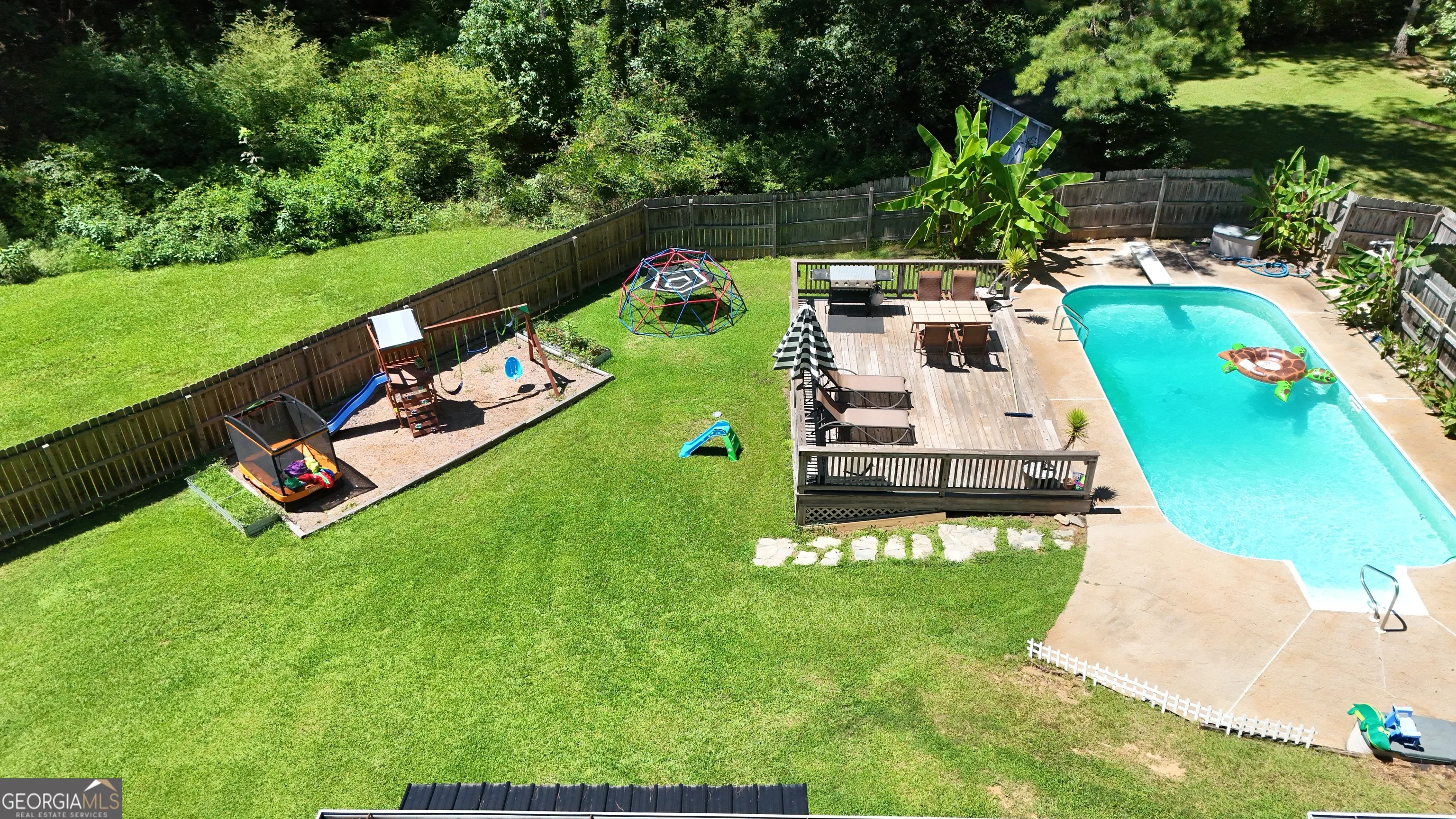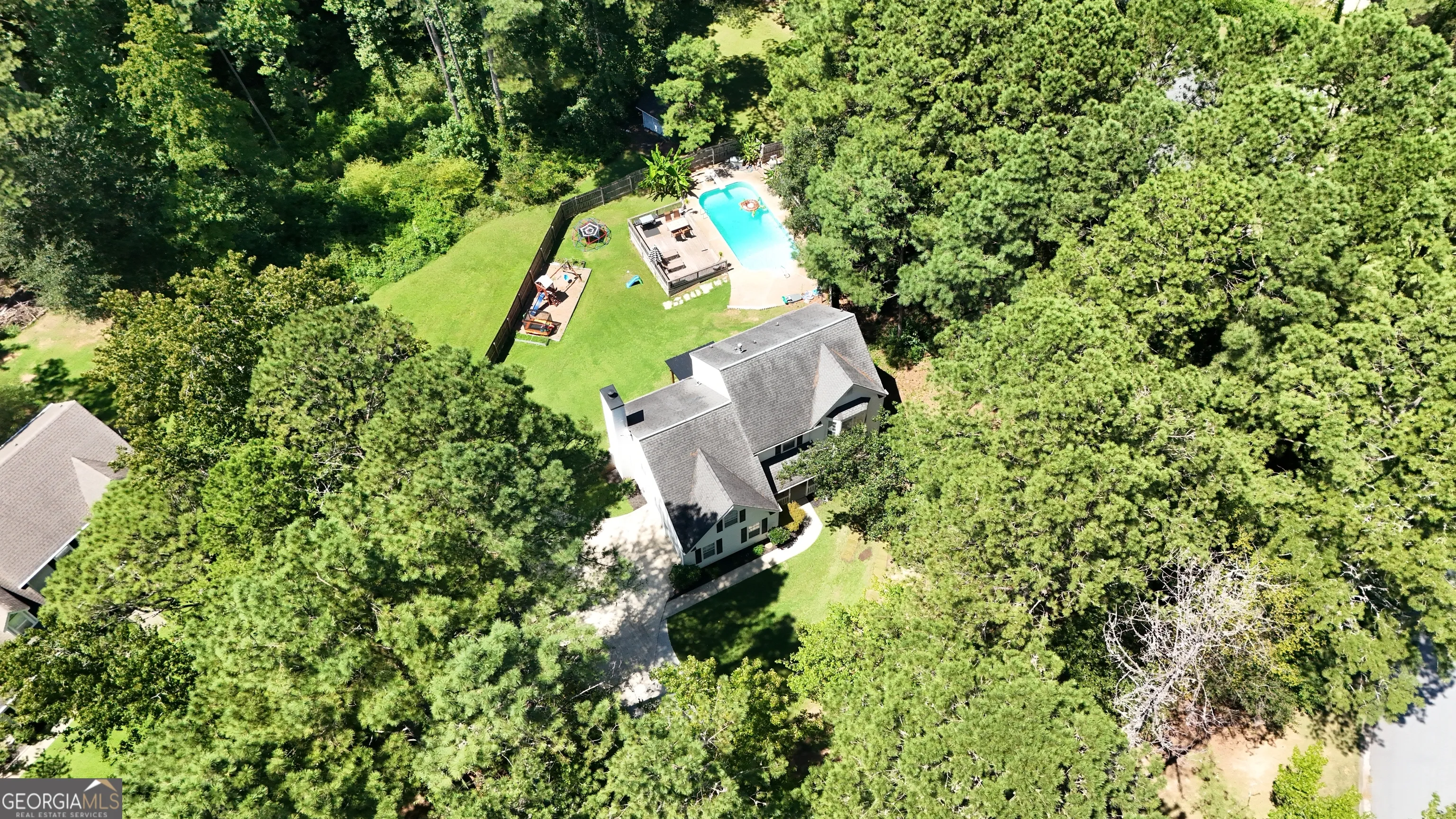 Welcome to this inviting 4-bedroom home on over an acre with a sparkling saltwater pool in the sought-after Northgate school district. Tucked away on a quiet cul-de-sac lot, this property offers relaxation, comfort, and convenience. Step inside from the welcoming front porch into a bright foyer that opens to the living room, highlighted by a charming bay window that fills the space with natural light. The formal dining room flows seamlessly into both the kitchen and living room, making it ideal for entertaining. The updated kitchen has stainless steel appliances, bar seating, and a pantry for added storage. Just off the kitchen is a cozy second living area featuring a shiplap fireplace. Upstairs, you’ll find all four bedrooms. The spacious primary suite is enhanced by a bay window and includes an en suite bathroom with an updated tile shower and a generous walk-in closet. Three additional bedrooms share a full bath, with one large bedroom offering the flexibility to serve as a bonus room or home office. Step outside to the expansive backyard, where you can relax under the covered patio, enjoy the saltwater pool surrounded by a deck, or make use of the storage shed and space for a swing set, perfect for outdoor living and play. Just minutes from shopping and dining in Peachtree City and Newnan with quick access to Highway 85, this home offers a peaceful retreat in a prime location. Southeast Mortgage is our preferred lender. If buyer chooses to work with them, Southeast Mortgage will provide 1% credit up to $5,000. Reach out to the listing agent for more information.