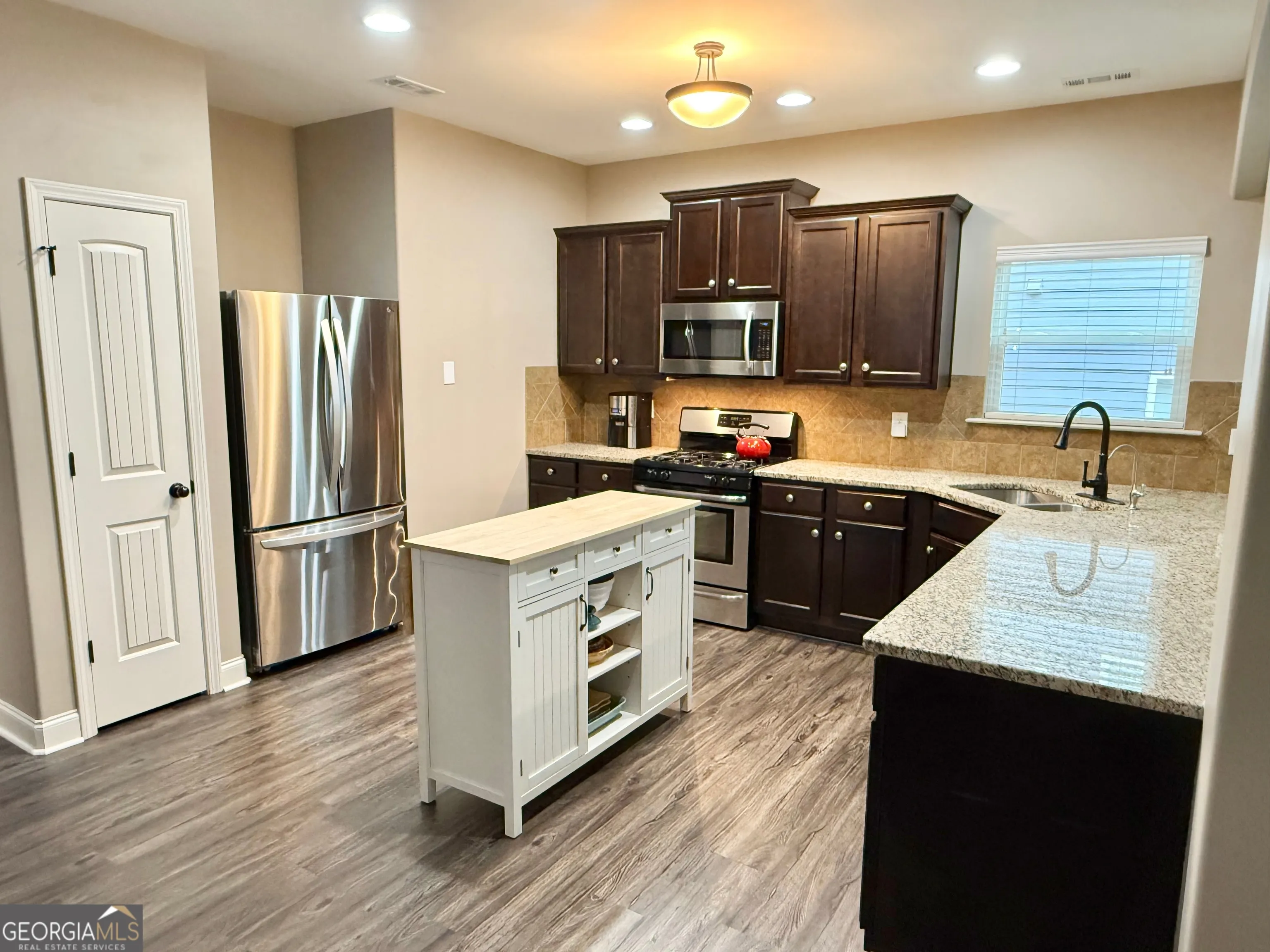 This home is an end-lot with natural space next to it, built in 2013 with a total of 2602 sq ft with 4 bedrooms 2 1/2 bathrooms and made of Hardi-plank siding and stack stone! The home has all new paint, and a water softener system. The master bedroom is on the main level! This home is super clean with beautiful archways, open floor plan, a rocking chair front porch, along with a back patio, and a privacy fenced backyard. Your guests will have plenty of room to park out front or use the alleyway behind the home to park in the extended driveway. There is a two-car attached garage. The main level of the home is open and consists of a formal sitting room/office, open kitchen with extended countertops, dining area, living room with beautiful fireplace, guest bathroom, drop zone for jackets and shoes, and laundry room with utility sink. Under the staircase is a cute home for your pet to hang out. The guest bathroom has a wood-planked wall along with an updated vanity. The primary bathroom is very large and has its own private en-suite with double vanity, NEW walk-in shower, soaking tub, water, closet, linen closet, and extra large clothes closet. There is a coat closet and storage closet on the main level as well. The kitchen has a gas stove, plenty of cabinetry, and is open to the living room where there is space for barstools and extra seating. Upstairs, you will find three large bedrooms each with its own walk-in closet. There is a hall bathroom that also connects to one of the bedrooms. The third bedroom has a wood plank wall. This home has been very well maintained and is ready for its new owners. It is super close (walking distance) to shopping, restaurants, hotels, interstate access, and entertainment. This home is in Madison Park at Newnan Lakes subdivision and zoned for Newnan Crossing Elementary, Arnall Middle School, and East Coweta High School.