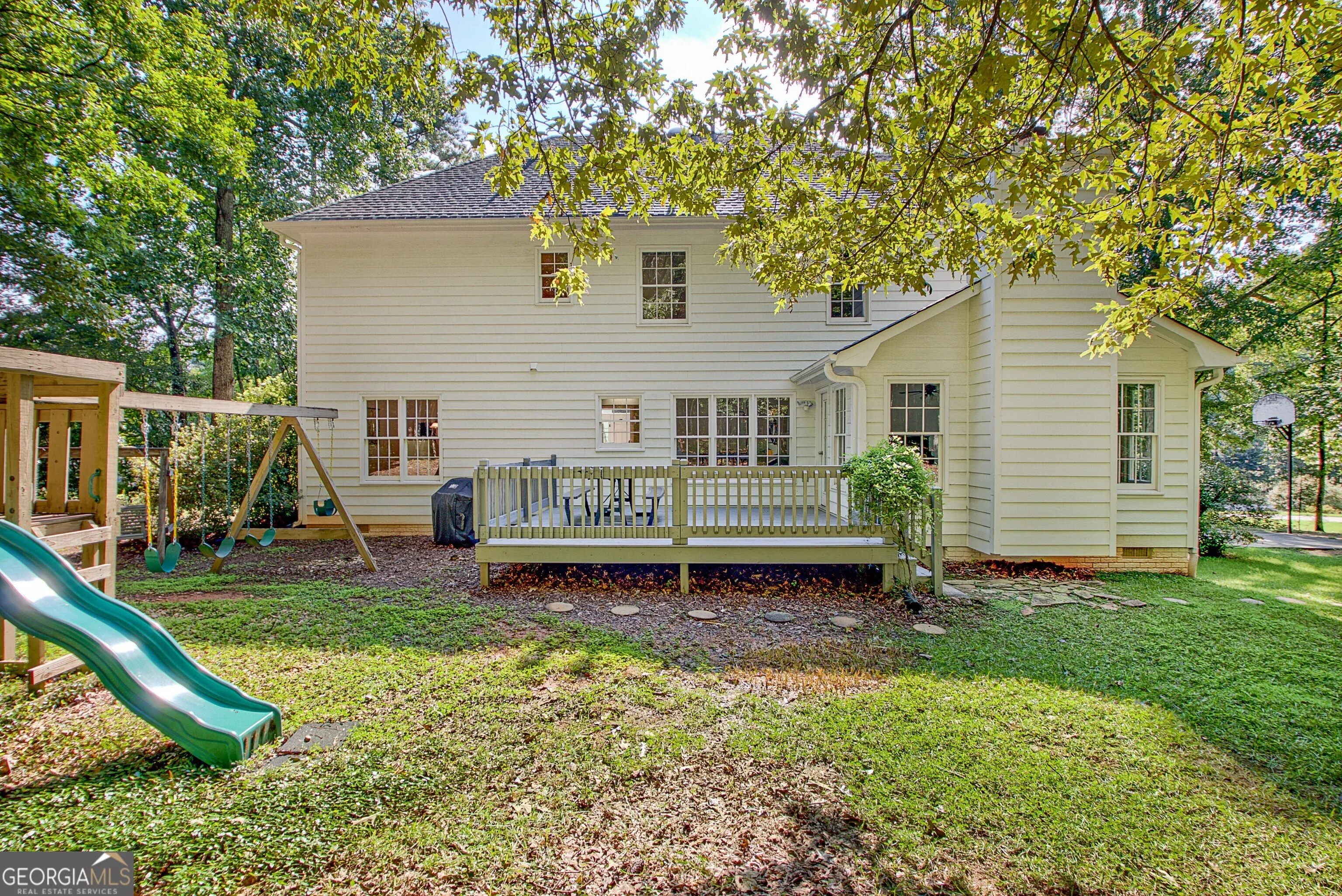 Welcome to this beautiful 4-bedroom, 2.5-bath home perfectly located in the heart of Tyrone, GA. Situated on almost an acre, this property offers space, privacy, and convenience all in one. Step inside to find large windows that fill the home with natural light, creating a warm and inviting atmosphere throughout. The main level features a formal dining room perfect for entertaining, and a spacious kitchen with tile flooring, stainless steel appliances, a tile backsplash, ample cabinet space, and a breakfast bar. The adjoining breakfast area opens to the family room, where an abundance of windows and a cozy fireplace make it the perfect spot to gather and relax while enjoying views of the backyard. Upstairs, the primary suite offers a peaceful retreat with a master bath featuring tile flooring, double sinks, and a separate soaking tub. Three generously sized secondary bedrooms provide plenty of room for family, guests, or a home office. Outside, enjoy the spacious deck overlooking the expansive yard-ideal for entertaining, gardening, or creating your own outdoor oasis. With its convenient location, natural light, and beautiful setting, this home perfectly combines comfort and style in one of Tyrone’s most desirable areas.