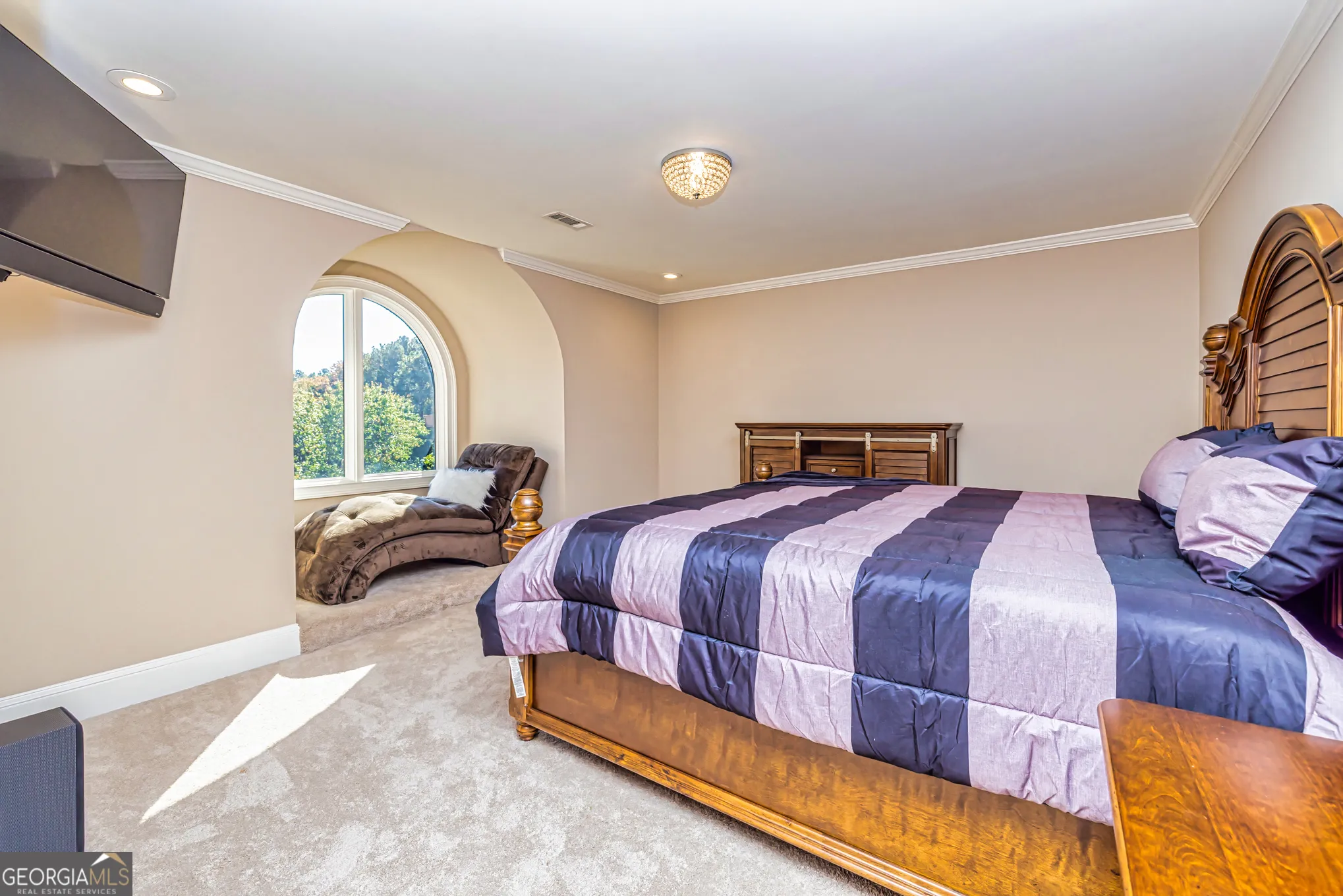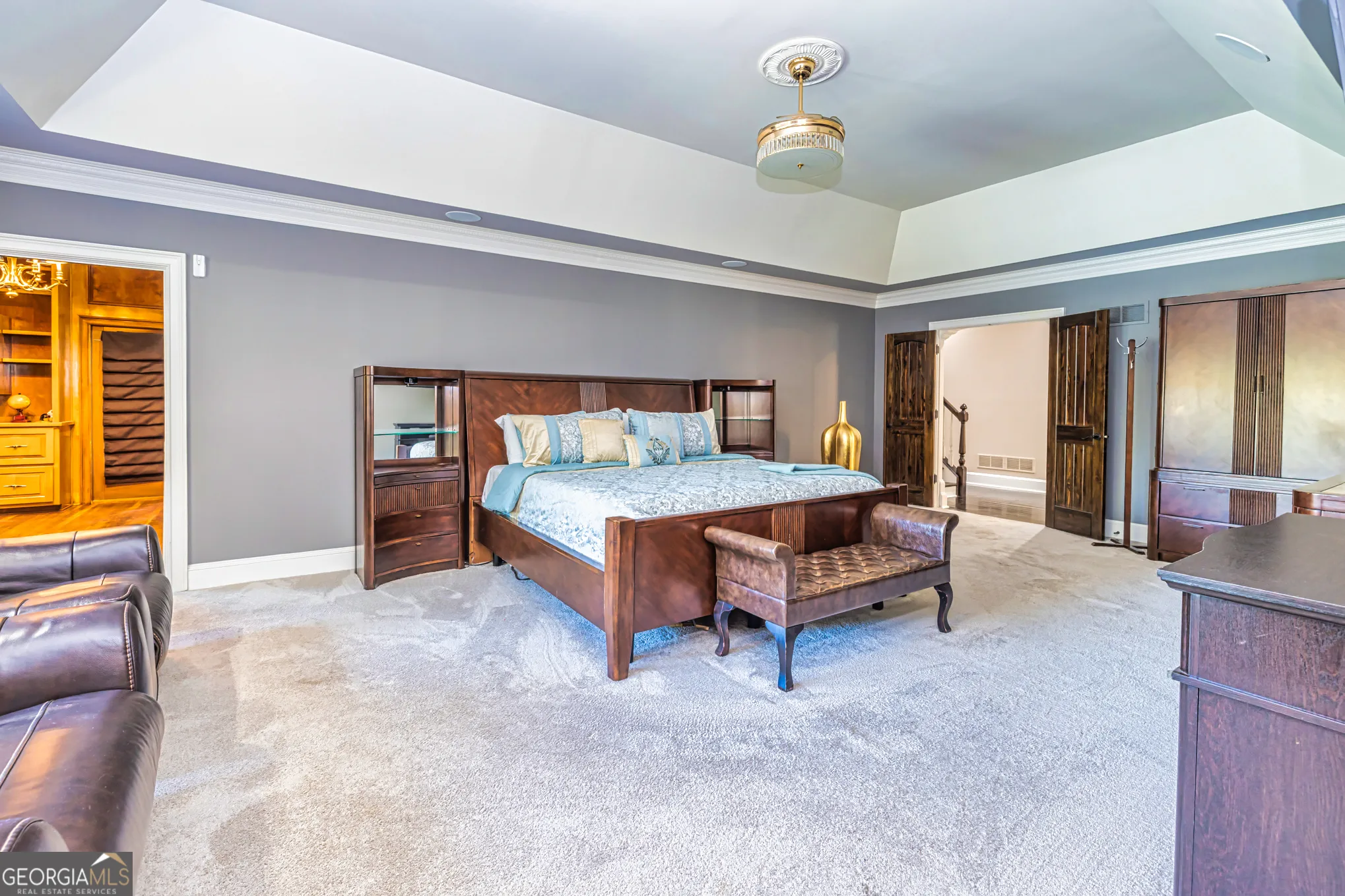 This European estate is located on 4.77+/- gated acres in Tyrone, Georgia, and has undergone meticulous renovation by skilled craftsmen to present a residence suitable for both sophisticated entertaining and comfortable day-to-day living. The driveway is bordered by mature trees, with professionally landscaped gardens enhancing the property’s visual appeal. Double solid wood doors introduce a marble foyer featuring a curved staircase and a crystal chandelier. Adjacent to the foyer, the right hallway leads into a wood-paneled living room with a fireplace, custom bookcase, wet bar, and triple French glass doors. A guest bedroom and bathroom are situated conveniently nearby. To the left of the foyer, the hallway provides access to a China room, a formal dining room with a crystal chandelier, and a chef’s kitchen that includes an oversized island, breakfast area, snack bar, walk-in pantry, utility space, and a glass-door elevator. The rear hallway from the kitchen connects to the primary suite, a secondary staircase, the terrace level, and a half bath. The primary suite features a tray ceiling and bay window overlooking the rear grounds. The en-suite bathroom offers a garden tub, a private toilet closet with bidet, a steam shower, and dual custom closets. An adjoining wood-paneled office equipped with custom bookcases is accessible from the suite. A central four-seasons lanai, climate-controlled for year-round use, contains an indoor swimming pool, hot tub, sauna, full bar, wine closet, and a full bath and changing room with a steam shower. Upstairs, there are three separate bedroom suites, each with built-in cabinetry, window seating, and ample closet space. Additional features include elevator access, two sitting areas, and significant storage. The lower level provides extensive recreational amenities, including a tavern-style bar, full bath with shower, home theater, game room with vintage arcade games, and a regulation 10-pin bowling alley. Outside, a full sport court for tennis, pickleball, or basketball sits perfectly surrounded by lush gardens and a koi pond. The property offers privacy while remaining within convenient driving distance of Atlanta International Airport, Peachtree City, Trilith Studios, as well as various entertainment venues, restaurants, and shopping centers.