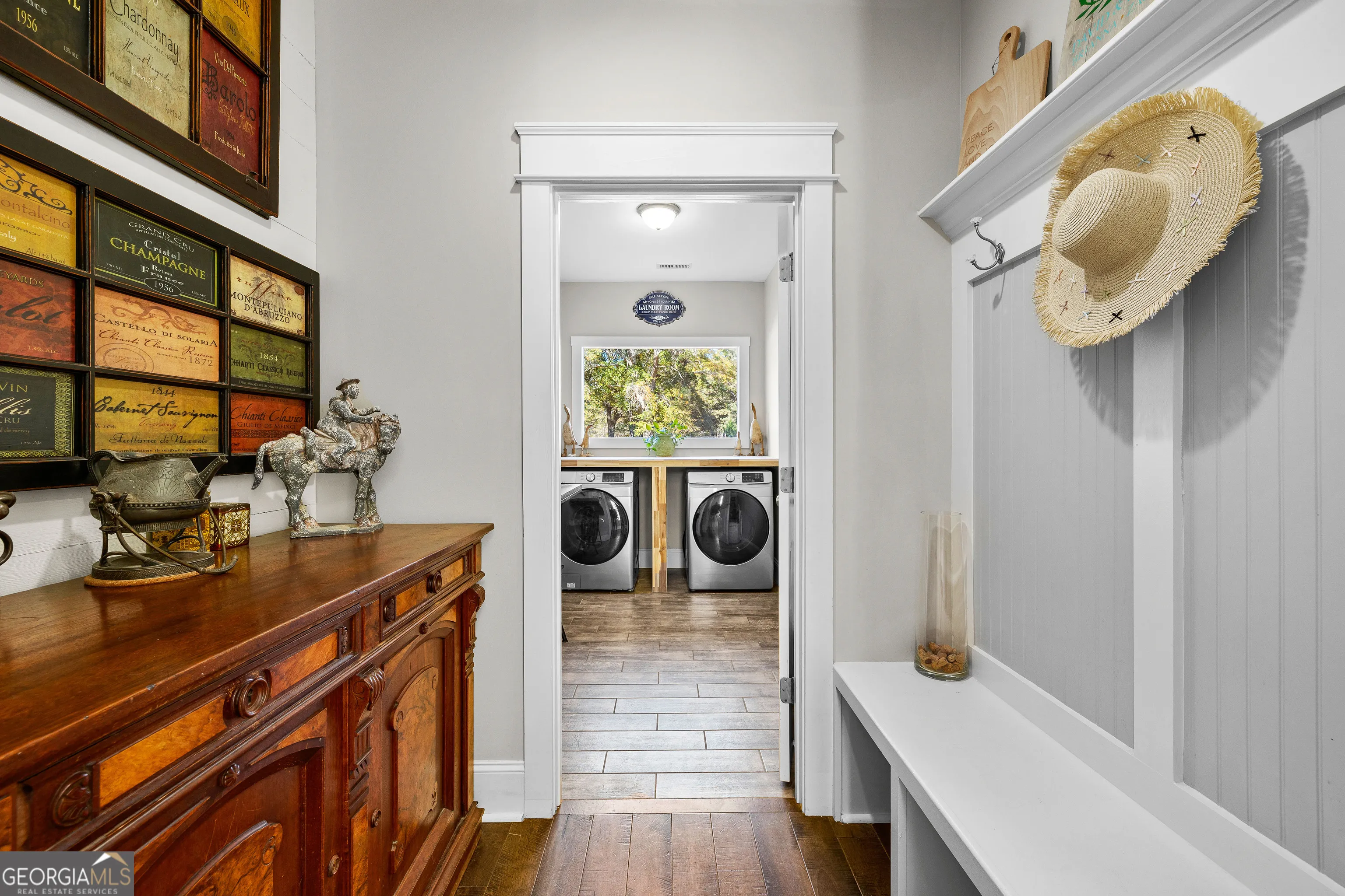 Tucked away on 5 quiet acres in Woodbridge Farms, this Mitch Ginn-designed home feels like a place where life slows down and moments become memories. The wraparound porch welcomes you in, and the arched double doors open to a warm, character-filled interior enhanced by thoughtful upgrades added by the current owners. The foyer leads directly into a spacious dining area, perfect for gatherings, and just across the hall is a private bedroom with its own bath that also works beautifully as a home office. On the main level, 9-foot ceilings create an airy, open feel. The family room, centered around a stone fireplace and custom built-ins, flows naturally into the kitchen, where a large quartzite island, stainless steel appliances, a brand-new range, and a separate wall oven make cooking and entertaining effortless. Just beyond the kitchen is a gorgeous breakfast room with vaulted ceilings overlooking the peaceful backyard-a beautiful spot to enjoy your mornings. The primary suite is also located on the main level, offering a peaceful retreat with a spa-inspired bath featuring a 10-foot double shower and a custom-designed closet. A generous laundry/mudroom adds everyday convenience and charm, highlighted by a window overlooking the backyard. Upstairs, two en-suite bedrooms, a bonus room, and a flex room with a walk-in closet provide flexible spaces for guests, hobbies, or play. Step outside and discover your own private oasis: a saltwater Pebble Tec pool, hot tub, covered porch, and serene pergola-complemented by lush sod, a full sprinkler system, and beautiful outdoor lighting that brings the entire space to life day or night. Just minutes from Peachtree City, Fayetteville, Senoia, and Trilith Studios, this beautifully maintained home is ready for its next chapter-and waiting for you to call it home.