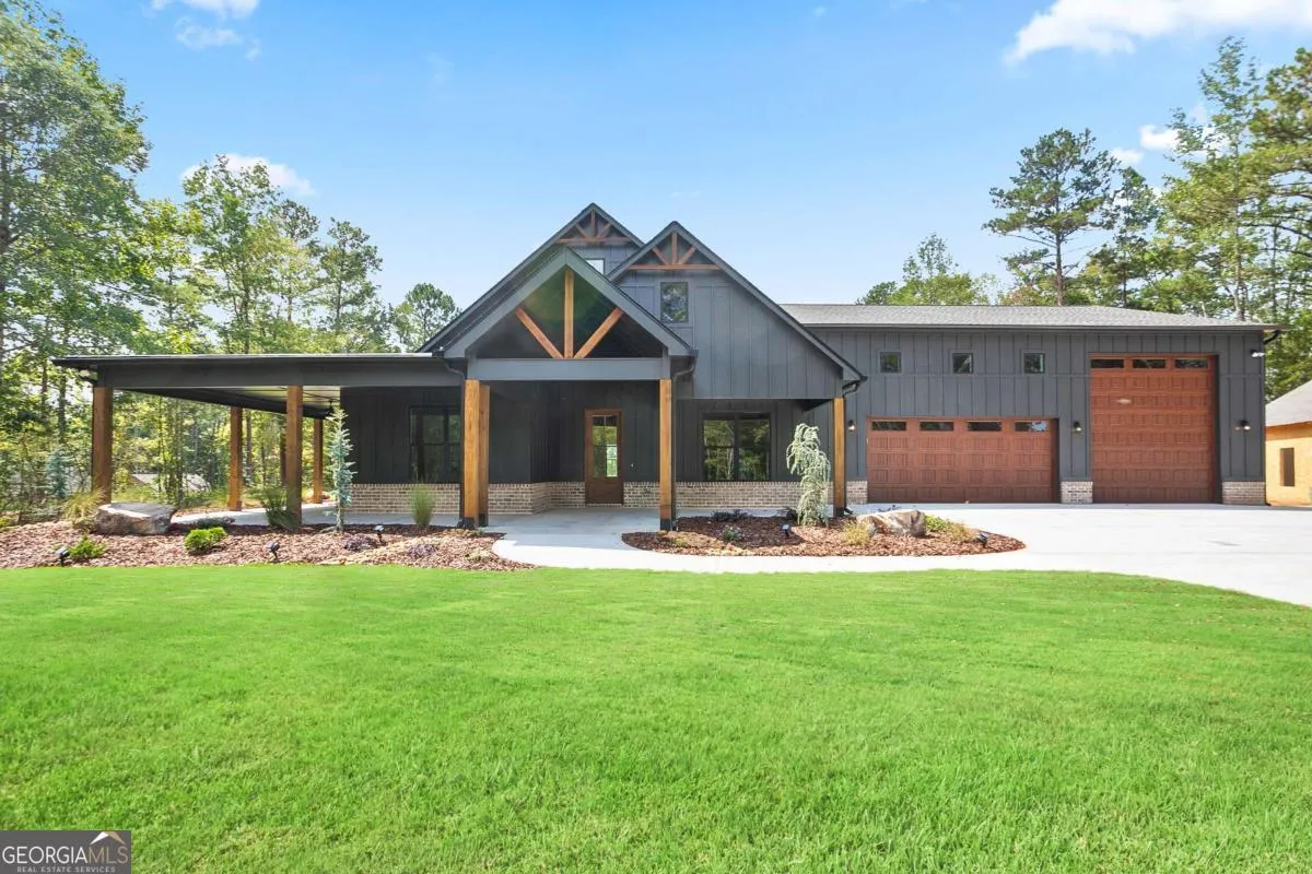 New Construction – Custom Built – The Brody Barndominium/Farmhouse – No HOA! Welcome to Old Sandhill Estates in Carrollton. This custom designed Brody Barndominium style farmhouse offers a spacious and thoughtfully designed layout with no HOA restrictions. Main level features three generously sized bedrooms and 2.5 bathrooms. Spacious primary suite with plenty of closet space and direct access to the laundry room. Two additional bedrooms connected connected by a Jack and Jill bathroom. Chef’s kitchen with a central island, stainless steel appliances, quartz countertops and a walk-in pantry. Vaulted ceilings in the family room and kitchen with 9-foot ceilings in bedrooms. Upper level with additional bedroom, full bathroom and a versatile bonus room. 8-foot ceilings throughout. Interior highlights feature hardwood flooring throughout the main living areas. Stylish tile in all bathrooms, laundry room. Sliding glass doors from both the dining room and owner’s suite. Exterior offers a covered front porch and rear patio for seamless indoor-outdoor living. Board and batten siding on the front facade with hardi plank on three sides.