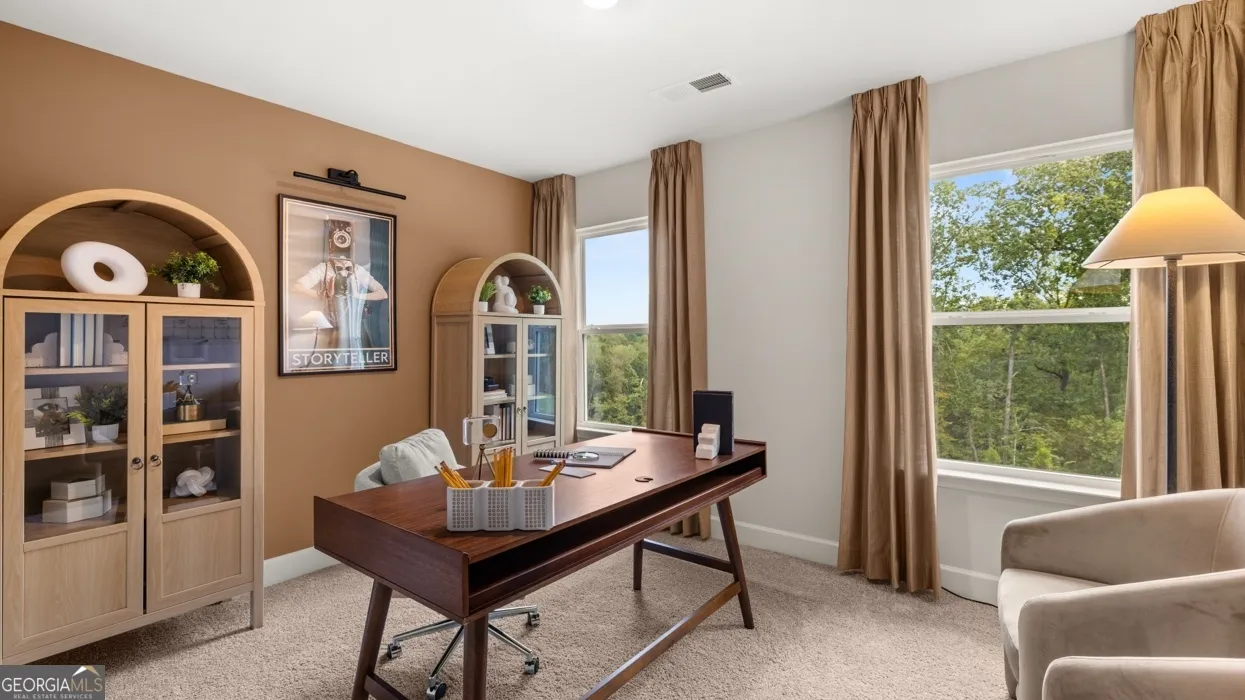 GOLF CART PATH TO HISTORIC DOWNTOWN SENOIA MINUTES TO PEACHTREE CITY WITHOUT THE PRICE TAG OVERSIZED LOTS WITH WOODED PRIVACY The Savannah offers 5 bedrooms and 4 baths with an open, inviting layout. The main level features a chef’s kitchen with quartz countertops, stainless steel appliances, and a large island that flows seamlessly into the dining and living areas. A secondary bedroom on the main level sits next to a full bath, offering convenience for guests. The owner’s retreat features a walk-in closet and a spa-inspired bath with double vanities, soaking tub, and separate tiled shower. Media room on upper level. Covered porch overlooks wooded backyard. Resort-style amenities include a sparkling aquatic center with cabana seating, tennis and basketball courts, playground, and clubhouse for gatherings. Smart home technology included.