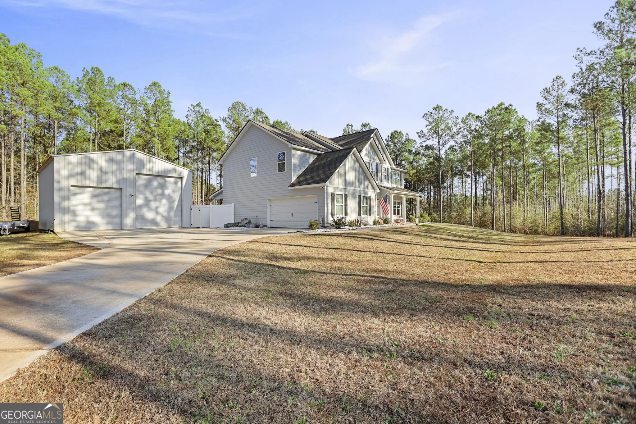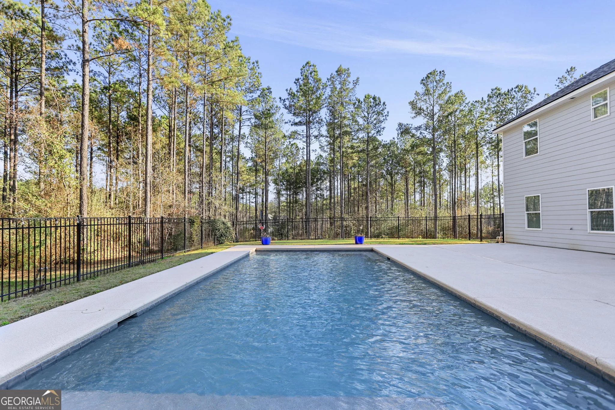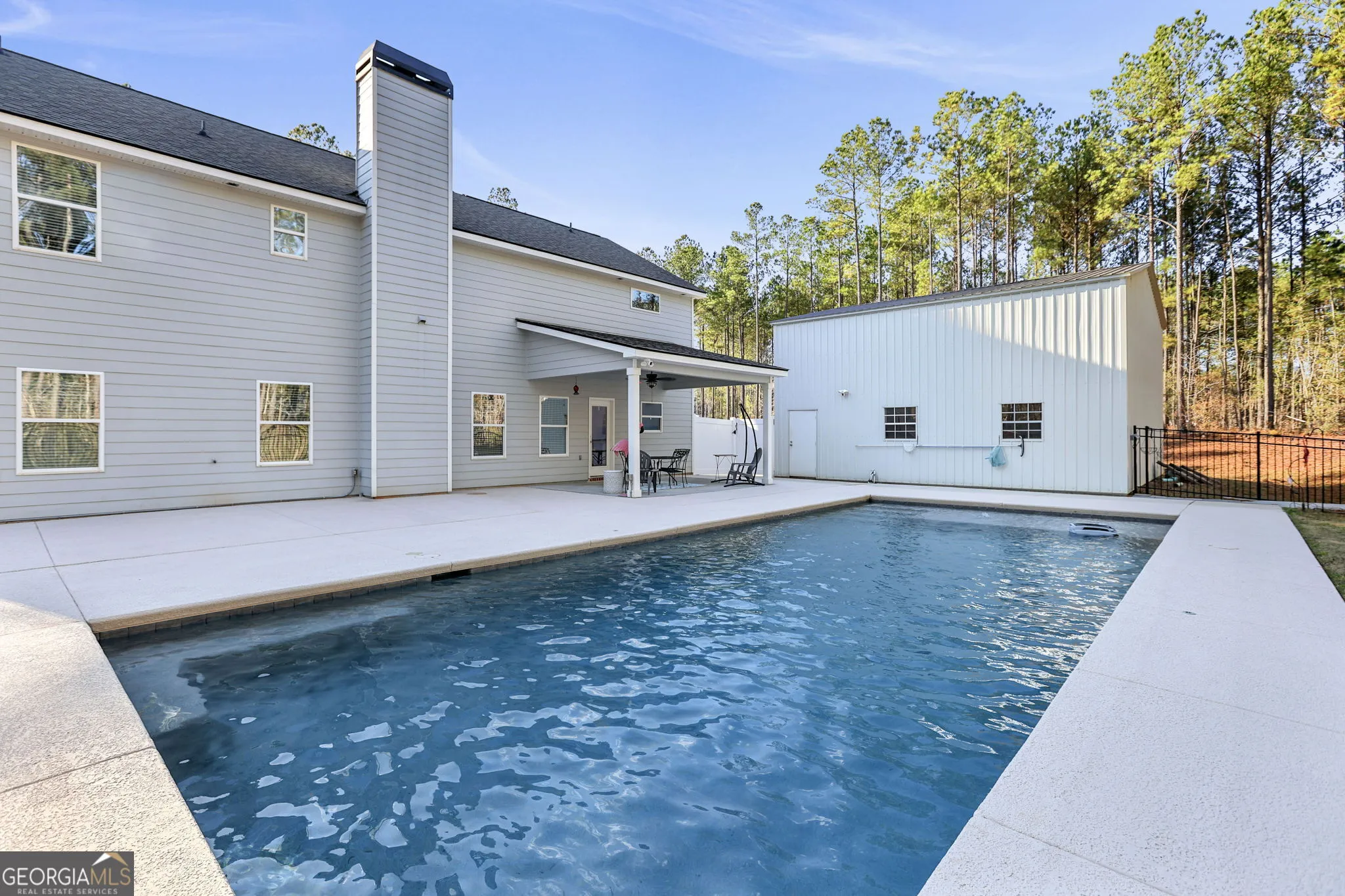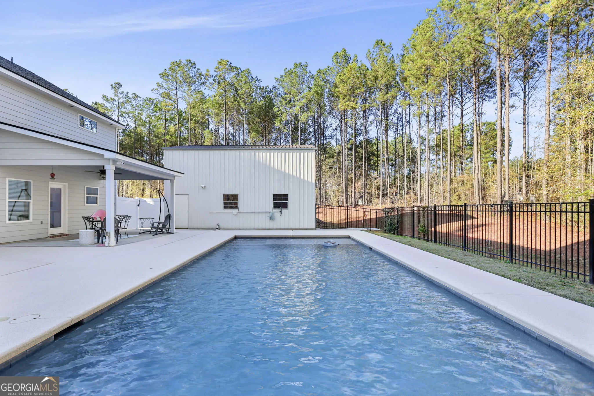 Step inside the welcoming foyer, where beautiful hard surface flooring and refined trim immediately set the tone for the thoughtful craftsmanship found throughout the home. Just off the entry, two versatile rooms offer endless possibilities and are ideal for a home office, formal dining room, or play space tailored to your lifestyle. At the heart of the main level, the spacious family room centers around an elegant fireplace, creating a warm and inviting gathering place. From here, the home flows seamlessly into the kitchen, thoughtfully designed with solid surface countertops, a stylish tile backsplash, stainless steel appliances, and abundant storage including a generous pantry. A guest bedroom is conveniently located on the main level, with a full bathroom just outside the room, offering comfort and accessibility for visitors. Upstairs, the oversized primary suite serves as a peaceful retreat and features a beautifully tiled bath and a striking walk in shower. Two additional bedrooms share a well appointed full bath, while a spacious secondary living area provides exceptional flexibility for a media room, homework zone, or creative space. Hard surface flooring enhances much of the main level, and carefully selected details throughout the home add both charm and everyday functionality. Outdoor living truly shines here. A covered rear patio opens to a private backyard oasis highlighted by an inground sports pool with a premium PebbleTec finish, surrounded by CoolCrete surfaces designed for durability and barefoot comfort and ideal for hot Georgia summers. Whether relaxing poolside or hosting gatherings, this outdoor space is designed for enjoyment. Beyond the pool, a generous thirty by thirty foot shop with power offers endless possibilities for woodworking, storage, or hobbies. The exterior of the home features durable fiber cement siding, architectural shingles, and Low E windows, all contributing to excellent energy efficiency and long term value. Blending comfort, craftsmanship, and exceptional outdoor amenities, this property offers a lifestyle you will enjoy for years to come.