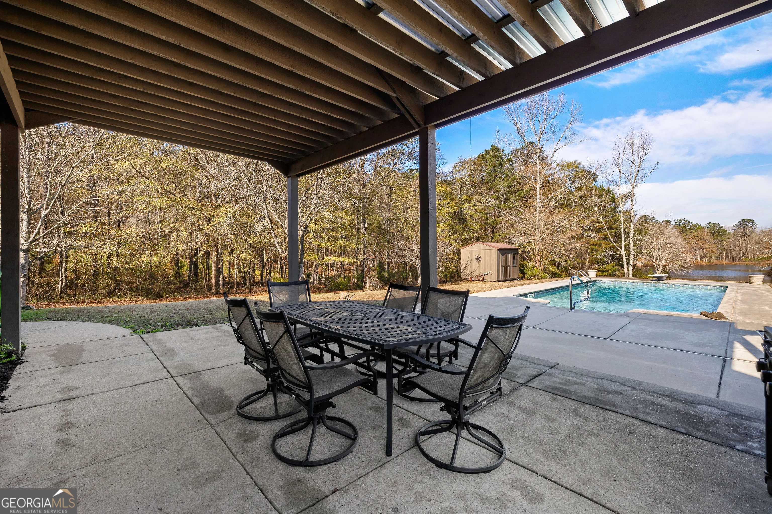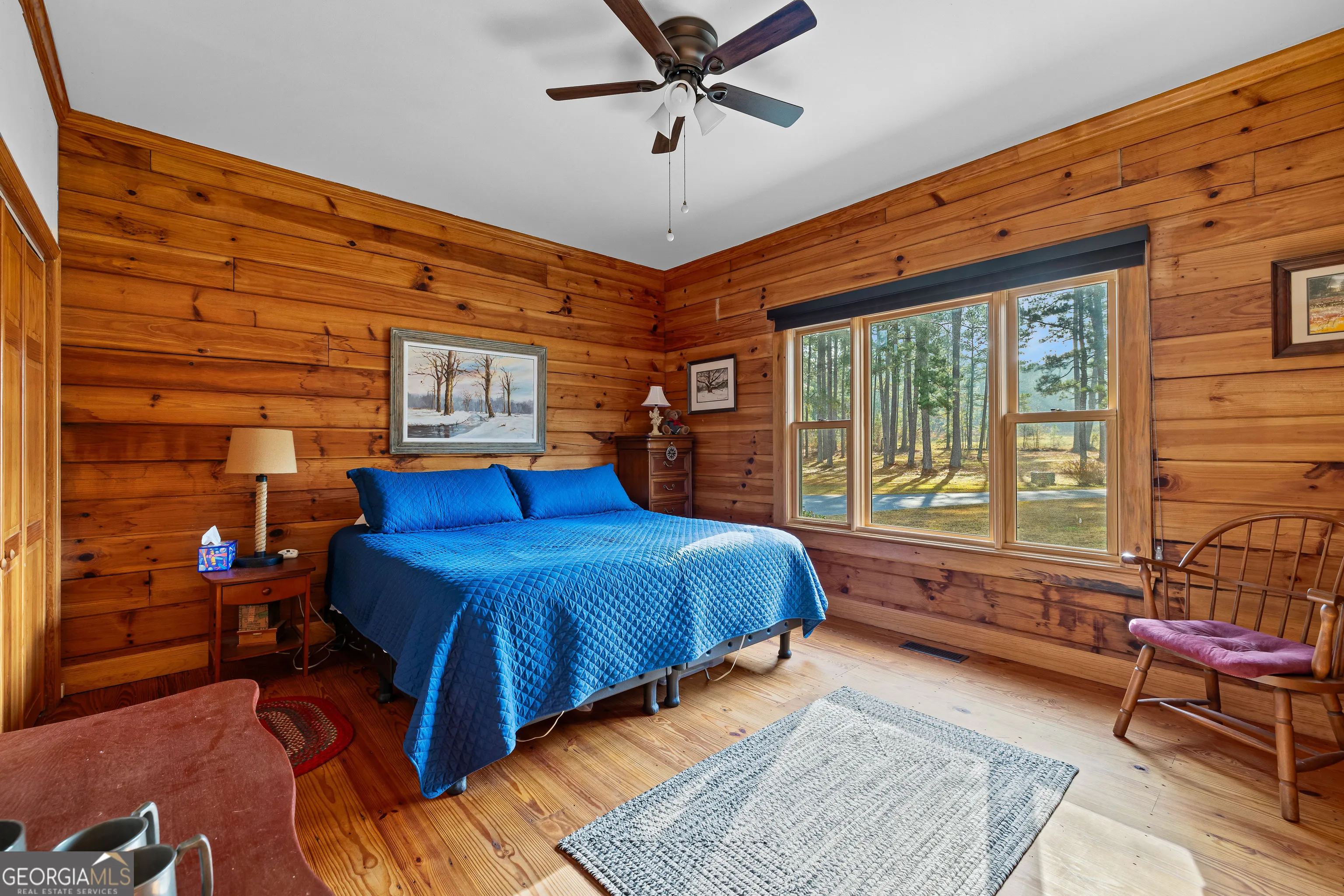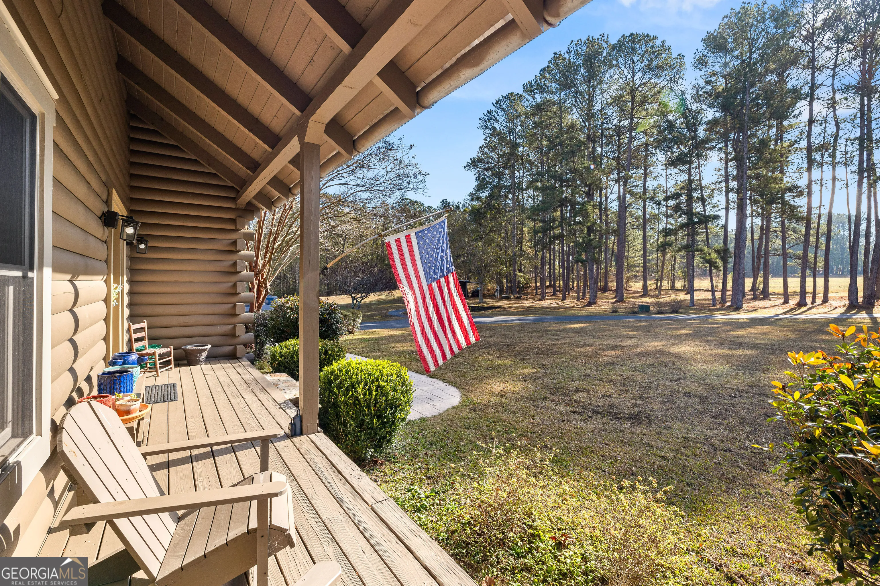 Tucked away on just under 20 acres, this beautifully crafted 2,528 sq ft log home offers privacy, natural surroundings, and thoughtfully designed outdoor living. Located in Meriwether County, near the Troup County line, the property provides a peaceful rural setting with a long private drive leading to a gazebo, saltwater pool, and multiple outdoor structures ideal for storage, equipment, or recreational use. While remaining approximately 6 miles to Interstate 85. Inside, the home offers an open floor plan with vaulted ceilings, exposed beams, and a spacious main living area anchored by a floor-to-ceiling stacked stone fireplace. Large windows provide abundant natural light and showcase views of the surrounding acreage. The kitchen serves as the heart of the home, featuring an oversized granite island with seating, extensive cabinetry, and ample workspace. It flows seamlessly into the living area, creating an ideal layout for gathering, entertaining, or everyday living. A finished two-room bonus area behind the carport provides an additional estimated 280 sq ft of heated and cooled flexible space suitable for an office, studio, gym, or additional storage needs. The outdoor living includes front and rear porches with peaceful, scenic views, while the rear of the home is overlooking the saltwater pool and shared lake with dock. A covered patio connects the home to the outdoor living area, while a pole barn with a wired workshop adds valuable utility space. With nearly 20 acres of open fields, mature trees, and total privacy, this property offers plenty of space for recreation, hobbies, and peaceful rural living in a truly magnificent setting.