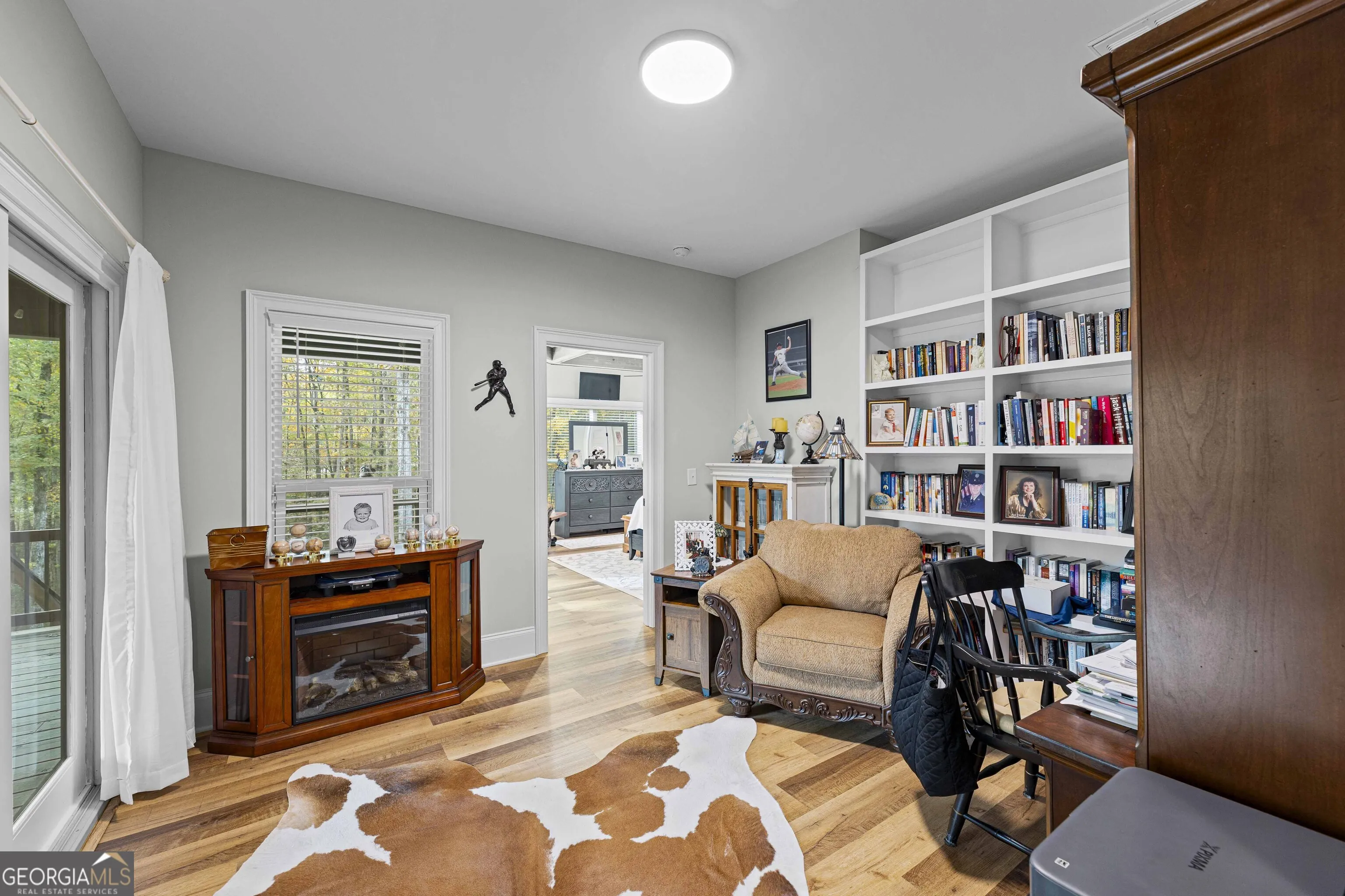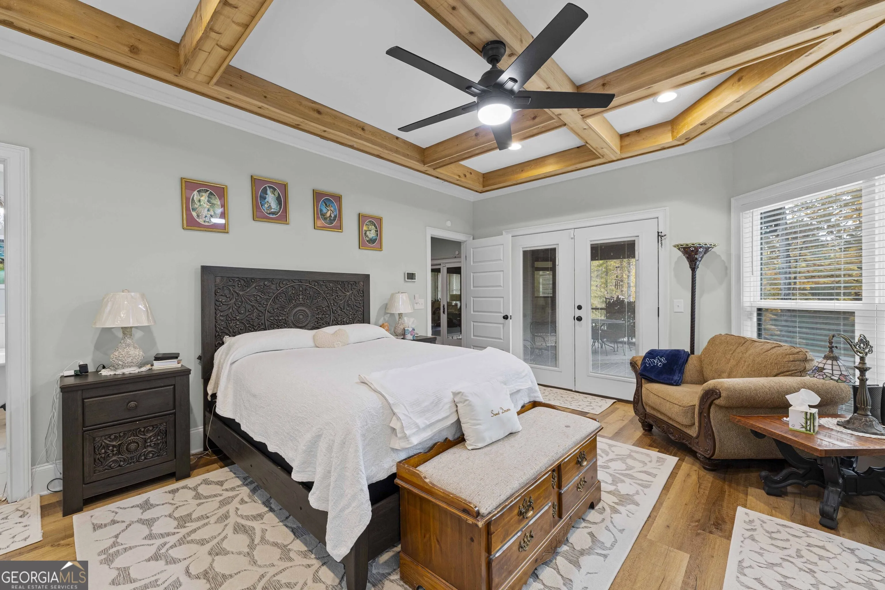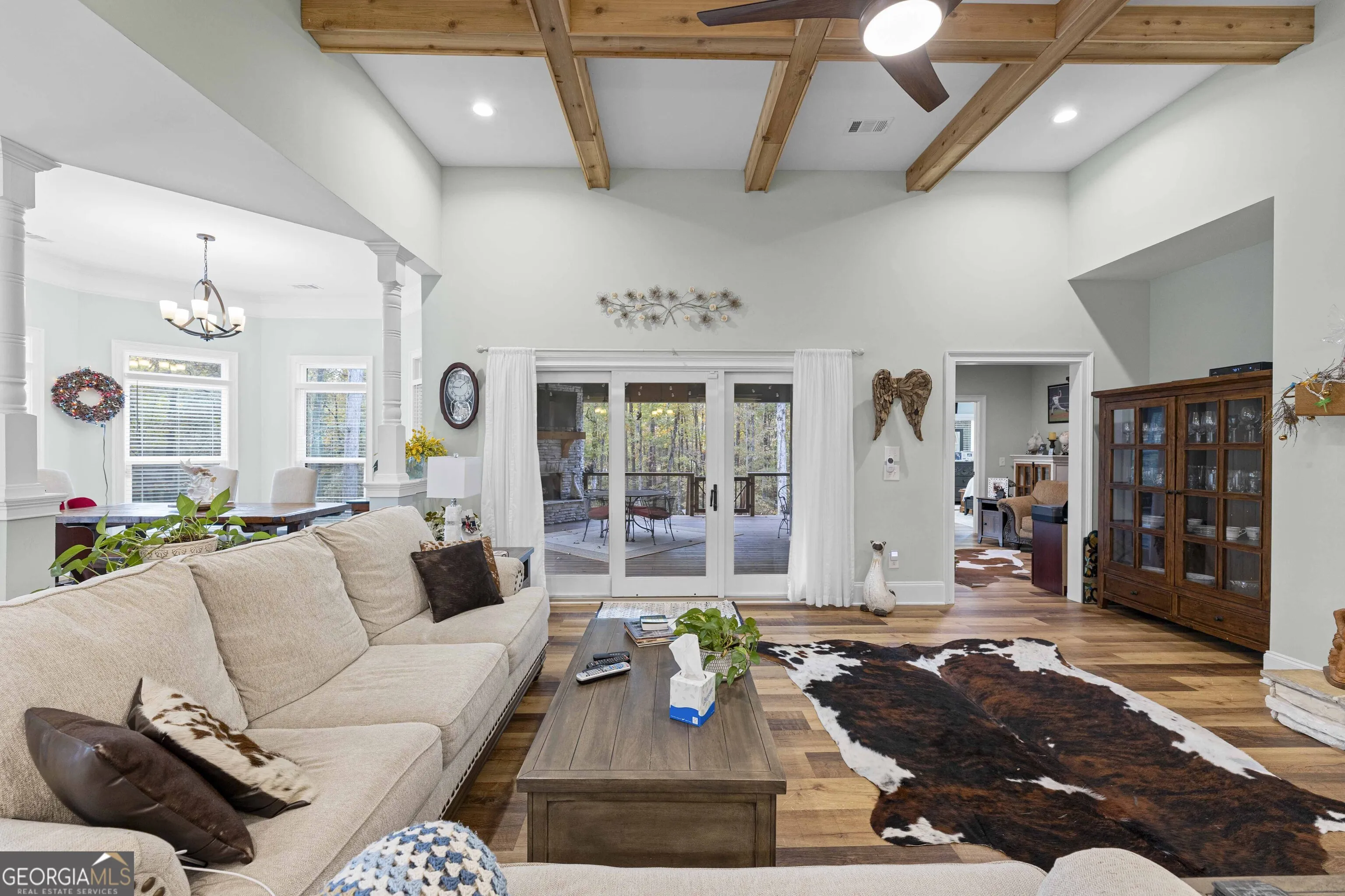 Nestled on 2.47 private wooded in Harris County and located CLOSE to town! This custom-built home offers 3,429 sq ft of refined craftsmanship and distinctive Turret-style architectural charm. A welcoming entry foyer opens into a stunning great room featuring a stone gas-log fireplace and wood-beamed coffered ceilings. The gourmet kitchen is truly the heart of the home, showcasing a large island with stone countertops, Viking appliances, built-in refrigerator, multi-burner gas stove with dual ovens, custom vent hood, walk-in pantry, and an elegant wet bar-ideal for entertaining. A formal dining room adds the perfect space for gatherings and celebrations. The primary suite is conveniently located on the main level and features wood-beamed coffered ceilings, an adjoining private office, and a spa-inspired bath with double vanities, a claw-foot soaking tub, a custom tile-and-glass walk-in shower, and an expansive walk-in closet. The main floor also includes a second private mater suite with full bath and custom tile shower, a bonus room, a half bath, and a spacious laundry room with abundant storage. Upstairs, you’ll find two additional bedrooms, a full bath, and a versatile flex space perfect for media, office, or playroom needs. Outdoor living is equally impressive, with a covered patio and a covered deck overlooking the serene wooded backdrop- featuring a wood-burning fireplace-and an outdoor firepit area for year-round enjoyment.