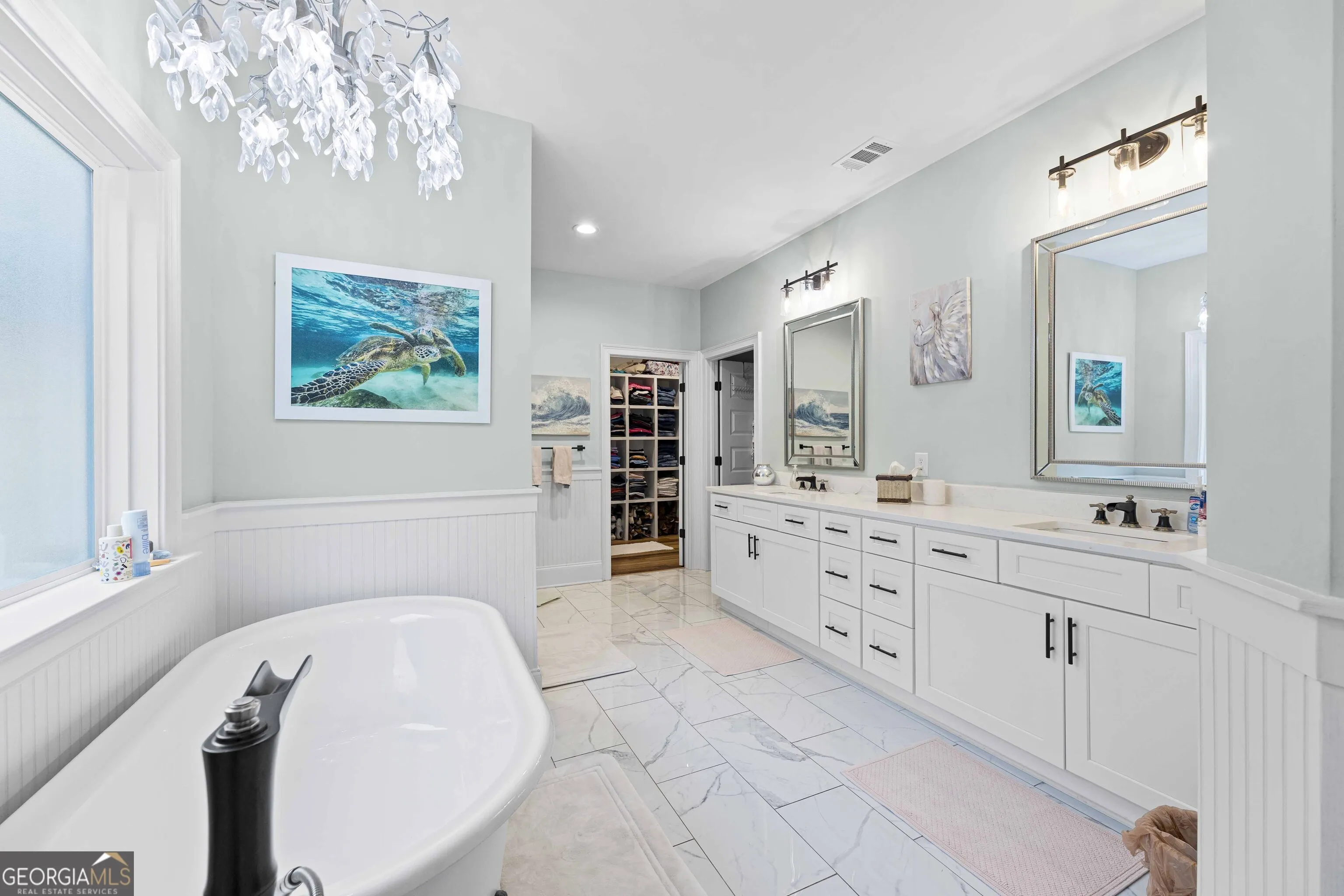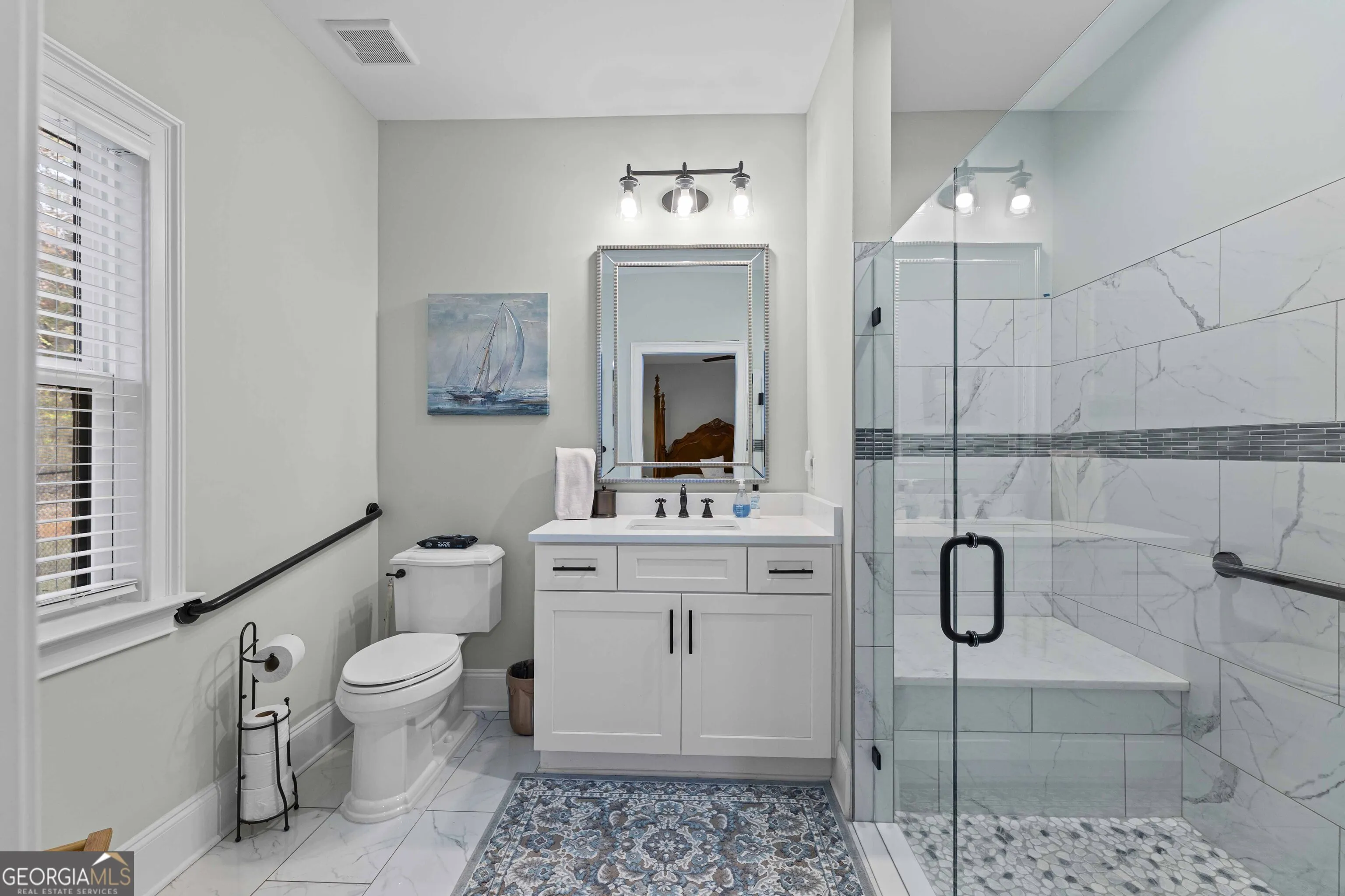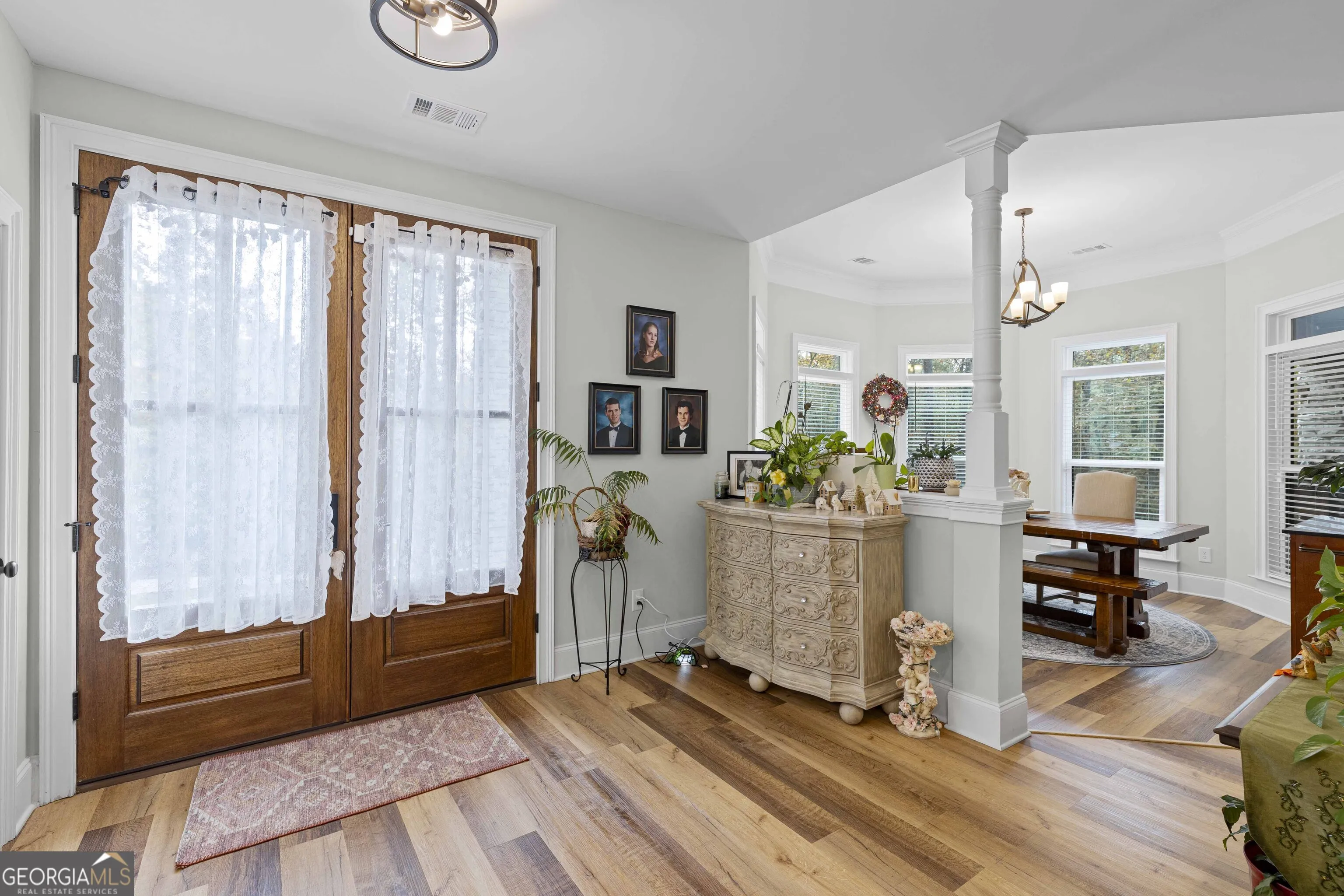 Nestled on 2.47 private wooded in Harris County and located CLOSE to town! This custom-built home offers 3,429 sq ft of refined craftsmanship and distinctive Turret-style architectural charm. A welcoming entry foyer opens into a stunning great room featuring a stone gas-log fireplace and wood-beamed coffered ceilings. The gourmet kitchen is truly the heart of the home, showcasing a large island with stone countertops, Viking appliances, built-in refrigerator, multi-burner gas stove with dual ovens, custom vent hood, walk-in pantry, and an elegant wet bar-ideal for entertaining. A formal dining room adds the perfect space for gatherings and celebrations. The primary suite is conveniently located on the main level and features wood-beamed coffered ceilings, an adjoining private office, and a spa-inspired bath with double vanities, a claw-foot soaking tub, a custom tile-and-glass walk-in shower, and an expansive walk-in closet. The main floor also includes a second private mater suite with full bath and custom tile shower, a bonus room, a half bath, and a spacious laundry room with abundant storage. Upstairs, you’ll find two additional bedrooms, a full bath, and a versatile flex space perfect for media, office, or playroom needs. Outdoor living is equally impressive, with a covered patio and a covered deck overlooking the serene wooded backdrop- featuring a wood-burning fireplace-and an outdoor firepit area for year-round enjoyment.
