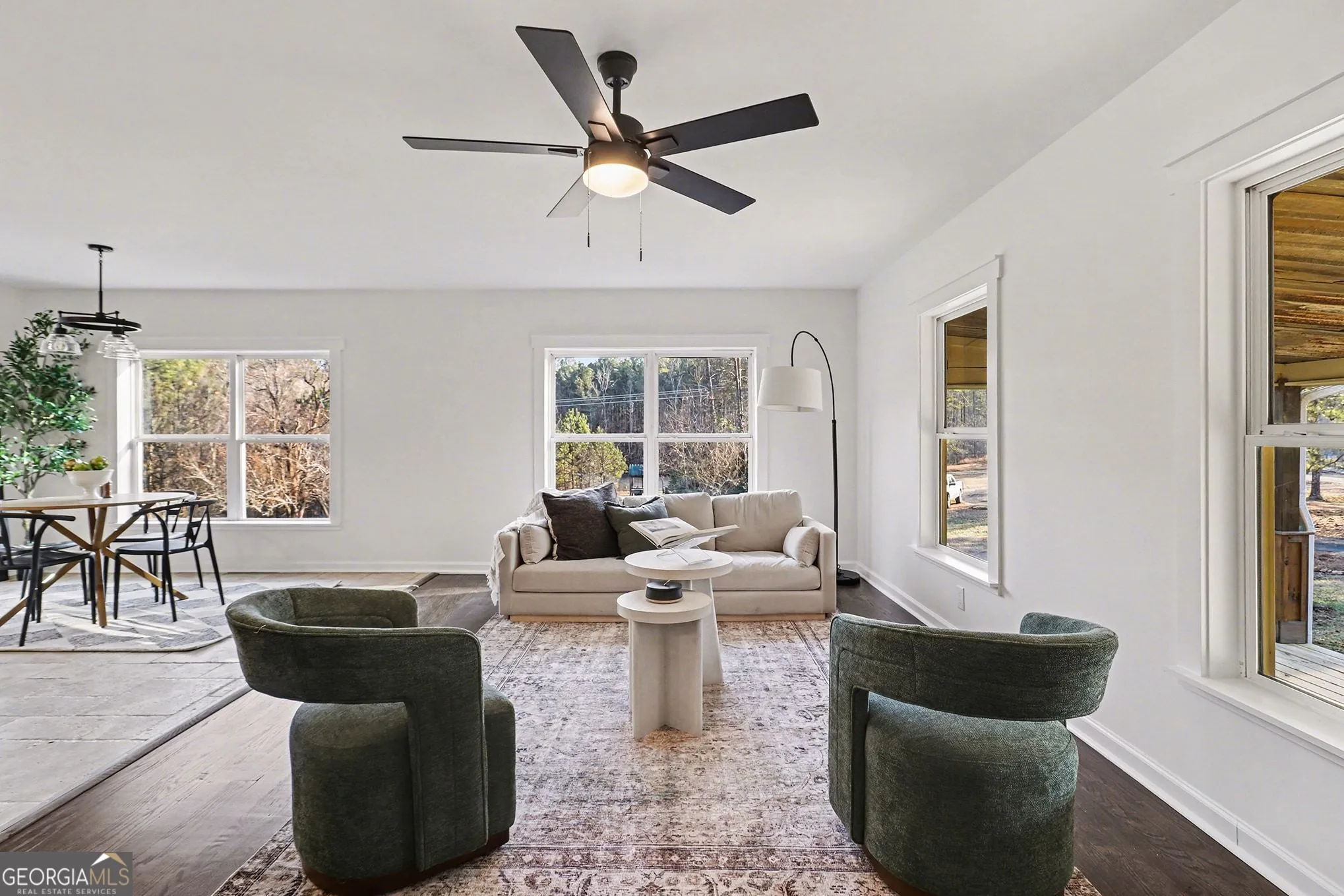 Recently renovated Southern Modern Ranch estate featuring a classic rocking chair front porch. This beautiful 4-bedroom 2-bath home opens into a brand-new foyer leading to sun-drenched living spaces with genuine hardwoods throughout. Renovation Highlights: * Designer Kitchen: Vented stove hood and premium stainless-steel appliances. Dual-tone cabinets, custom granite counters, stone tile flooring, and a large island with recessed and pendant lighting. * Refined Living Space: Gleaming hardwood floors, oversized windows, and peaceful, park-like views. * Primary Suite: Private, spacious layout with hardwood floor, walk-in closet, and a master bathroom with custom granite vanity. * Updated Bedrooms: All-new paint, plush carpeting, and modern ceiling fans. Enjoy abundant natural light and timeless style in a home that feels brand new while retaining its original charm. Beyond the back door, experience the sprawling acreage that defines this estate. With ample room to start your own hobby farm, these sun-drenched grounds complete this beautiful property-perfectly blending refined interior living with the freedom to grow.