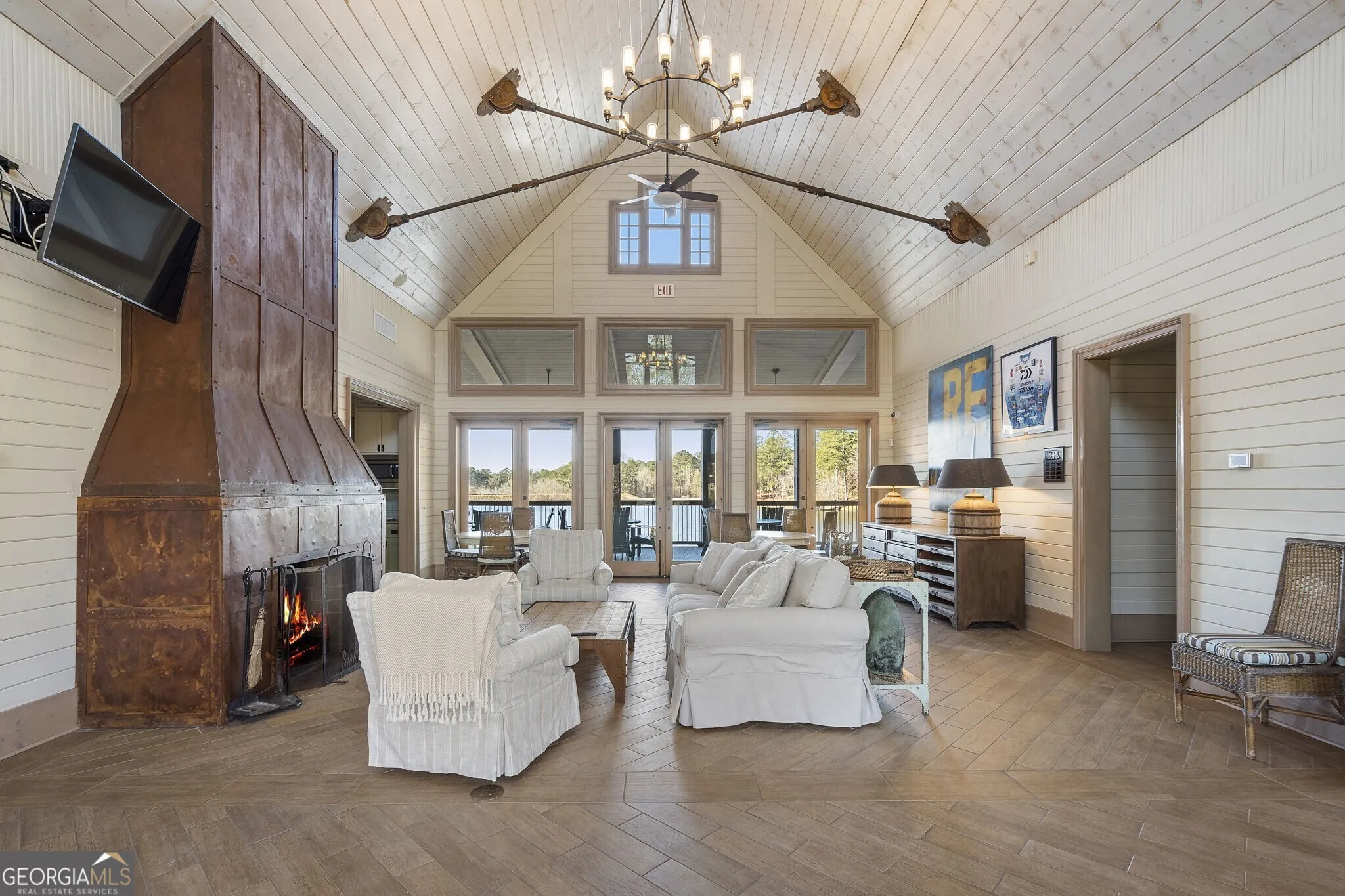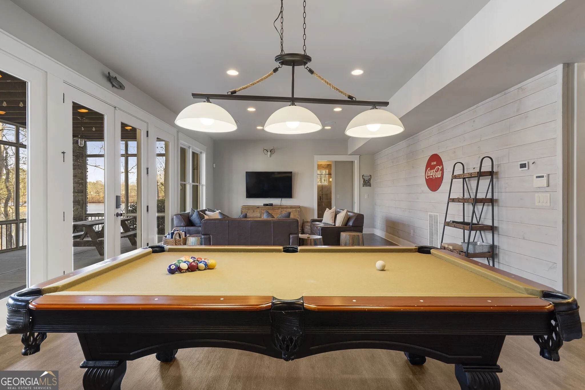 Welcome to the perfect lakefront getaway in the sought after private community, Blalock Lakes, which is a gorgeous private sporting club near downtown Newnan and just an hour outside of Atlanta. This home comes fully furnished and is thoughtfully and tastefully designed with an open floorplan that perfectly balances refined living, comfort, and Southern charm. Open the impressive accordian doors across back of home, and take in the stunning, unmatched views of the lake from the huge screened porch. Chef’s kitchen with custom barn wood accents and commeercial grade appliances is open to the fireside living space and perfect for entertaining guests. With double primary suites on the main, generous walk in closets, spa inspired baths, additional bedrooms downstairs with a bunkroom, everyone has their own private space. Also on the terrace level, you’ll find a wet bar, laundry room, additional living space and another screened in porch with ping pong, pool table in rec room, and picnic table. Take in the fresh air as you make your way to the backyard with stone firepit, powered boat dock, your very own pontoon boat, and kayaks to go explore the lake life. Single garage on lower level. You can also enjoy the community pool that overlooks the lake with clubhouse for gathering, stables for equestrians, and The Lodge for all of your outdoor sporting needs. The opportunities are endless at this tranquil home away from home where you can stay as busy as you want or just relax away from it all! Do not miss this chance to be on the lake with endless amenities in a private, quiet setting.