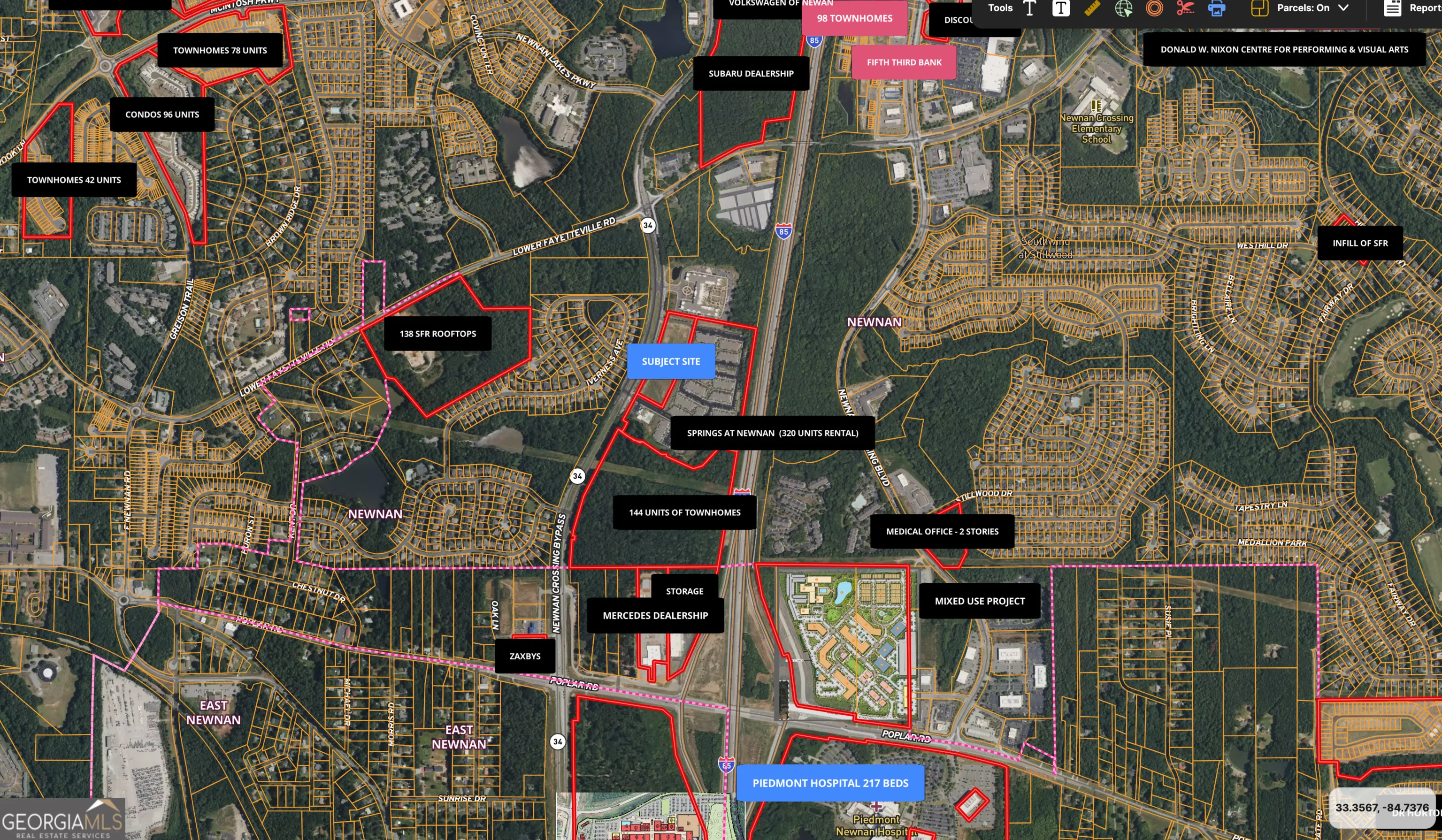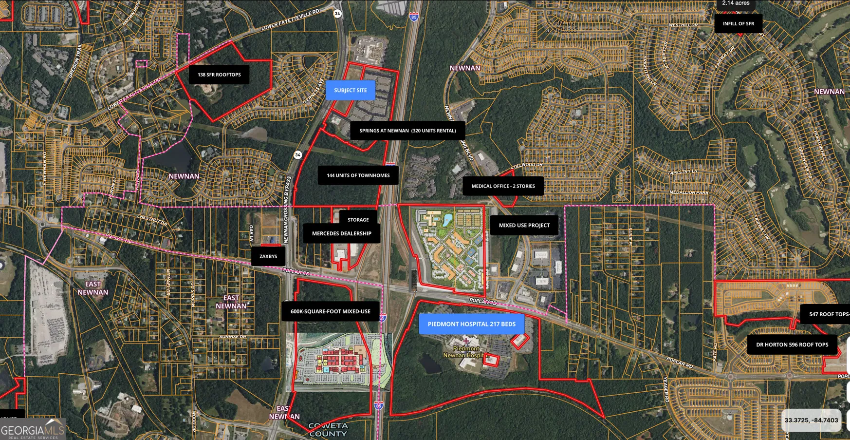 Prime 5.93 acre pad-ready commercial parcel located WITHIN the City limits of Newnan along the heavily traveled Newnan Crossing Bypass (SR 34), offering exceptional visibility and access. Zoned MXD, this pad-ready vacant land is approved for retail, medical office, or restaurant use and features an approved site plan for two one-story buildings totaling approximately 43,520 SF with 232 parking spaces, significantly reducing entitlement risk and accelerating development timelines. The property offers approximately 755 feet of road frontage, off-site stormwater detention, and access to public water, sewer, underground utilities, and high-speed internet. Access is well designed with a north-south curb cut including a median break, along with two additional right-in/right-out access points serving both directions of traffic. Strategically positioned directly in front of the 320-unit Springs at Newnan apartment community and adjacent to the 202-unit Ashlynn Ridge 55+ community, the site benefits from strong surrounding rooftops and ongoing growth, with over 2,000 residential units and 50+ projects currently under construction or in permitting within the city limits. The property is located less than 0.8 miles from the I-85/Poplar Road interchange and within close proximity to major anchors including Piedmont Newnan Hospital (217 beds), City of Hope Cancer Treatment Center, Ashley Park lifestyle retail center, SummerGrove Golf & Tennis, White Oak Golf Club, and historic Downtown Newnan. Hartsfield-Jackson Atlanta International Airport is approximately 29 minutes away, further enhancing regional accessibility. This highly visible infill opportunity offers a rare combination of approved entitlements, dense surrounding development, and immediate access to Newnan’s premier medical, retail, and residential corridors. OM available to qualified buyers.