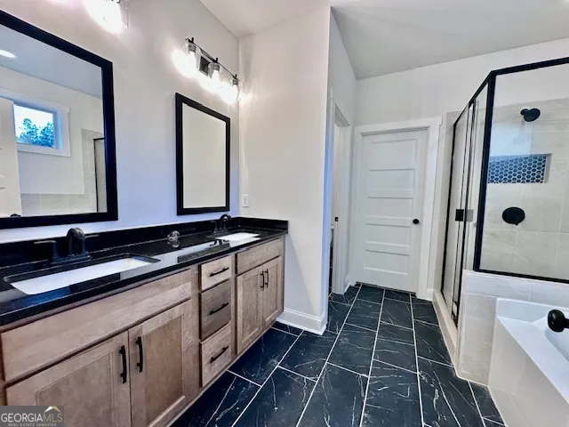 : Walk-In Closet(s), High Ceilings, Vaulted Ceiling(s), Double Vanity, Master On Main Level, Split Bedroom Plan, Tile Bath, Pulldown Attic Stairs, Separate Shower, Soaking Tub