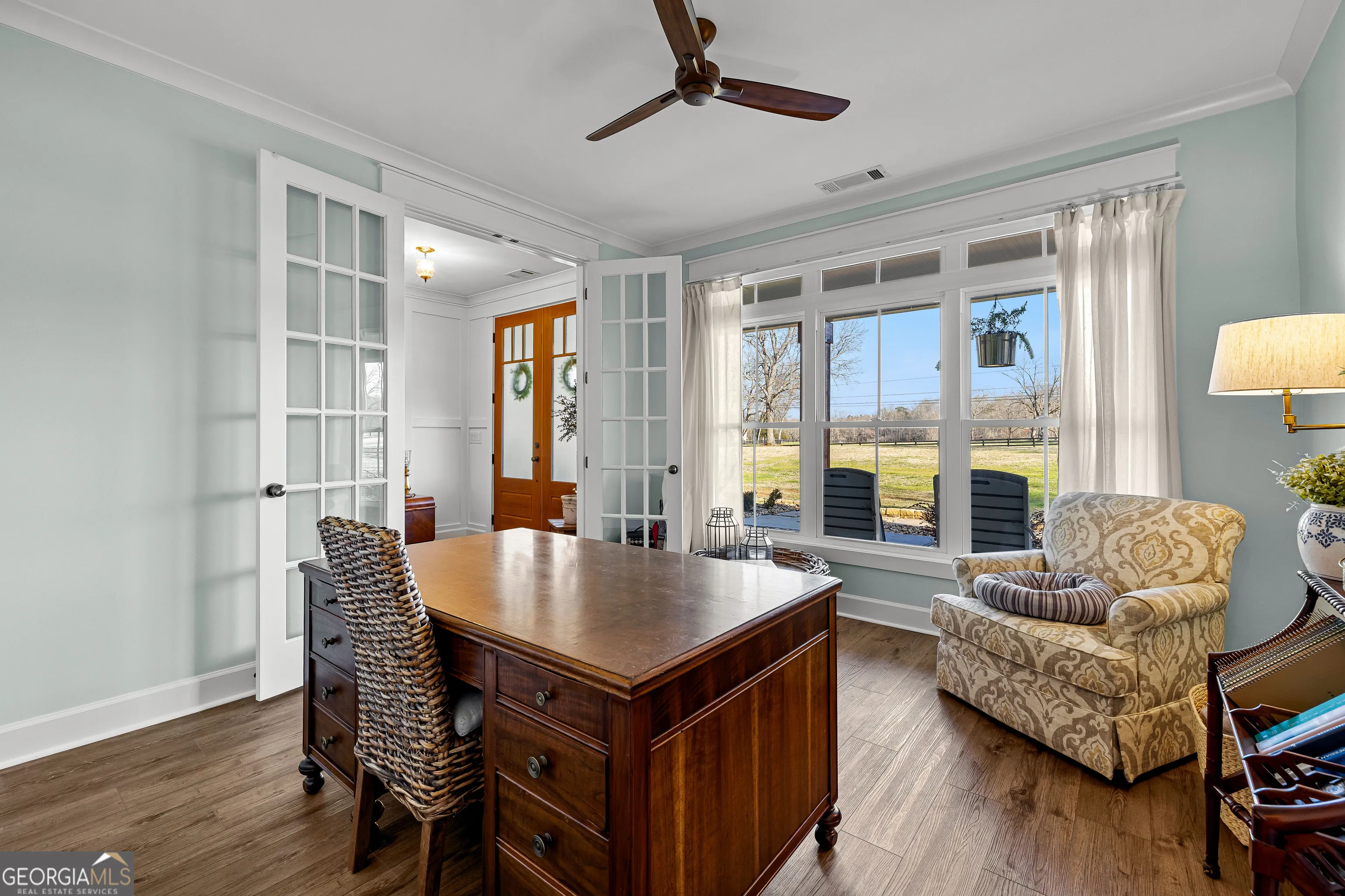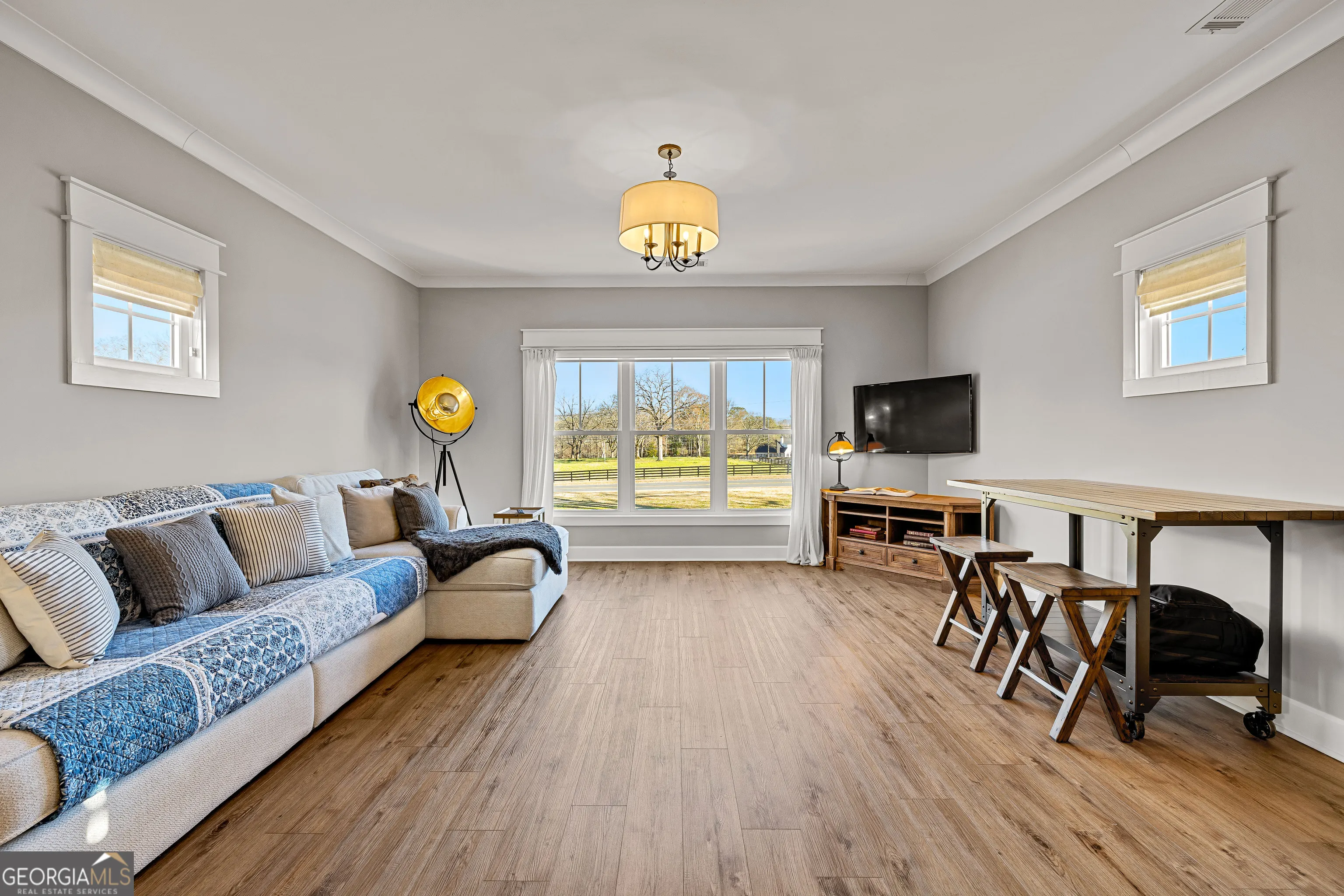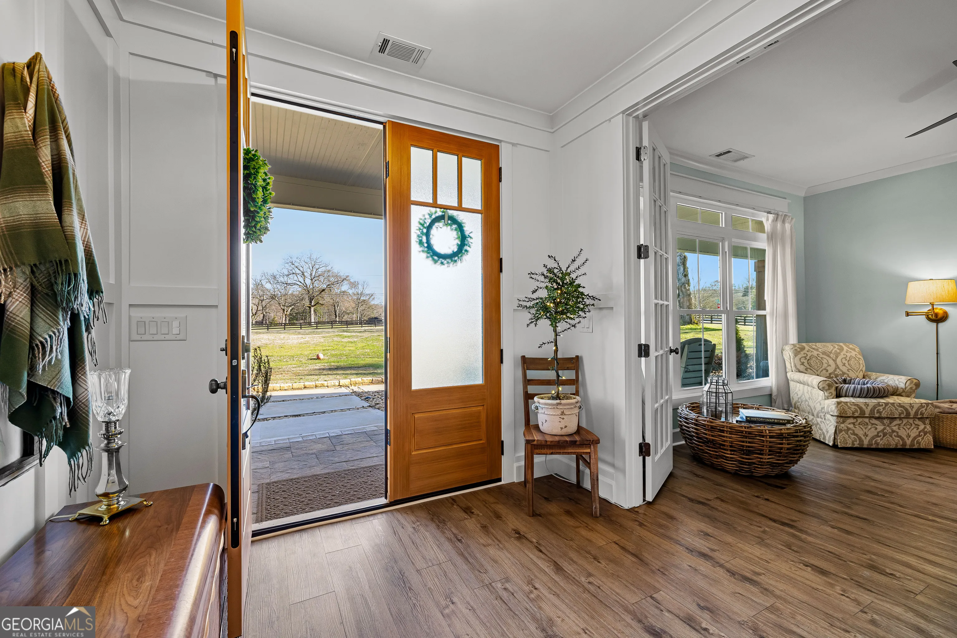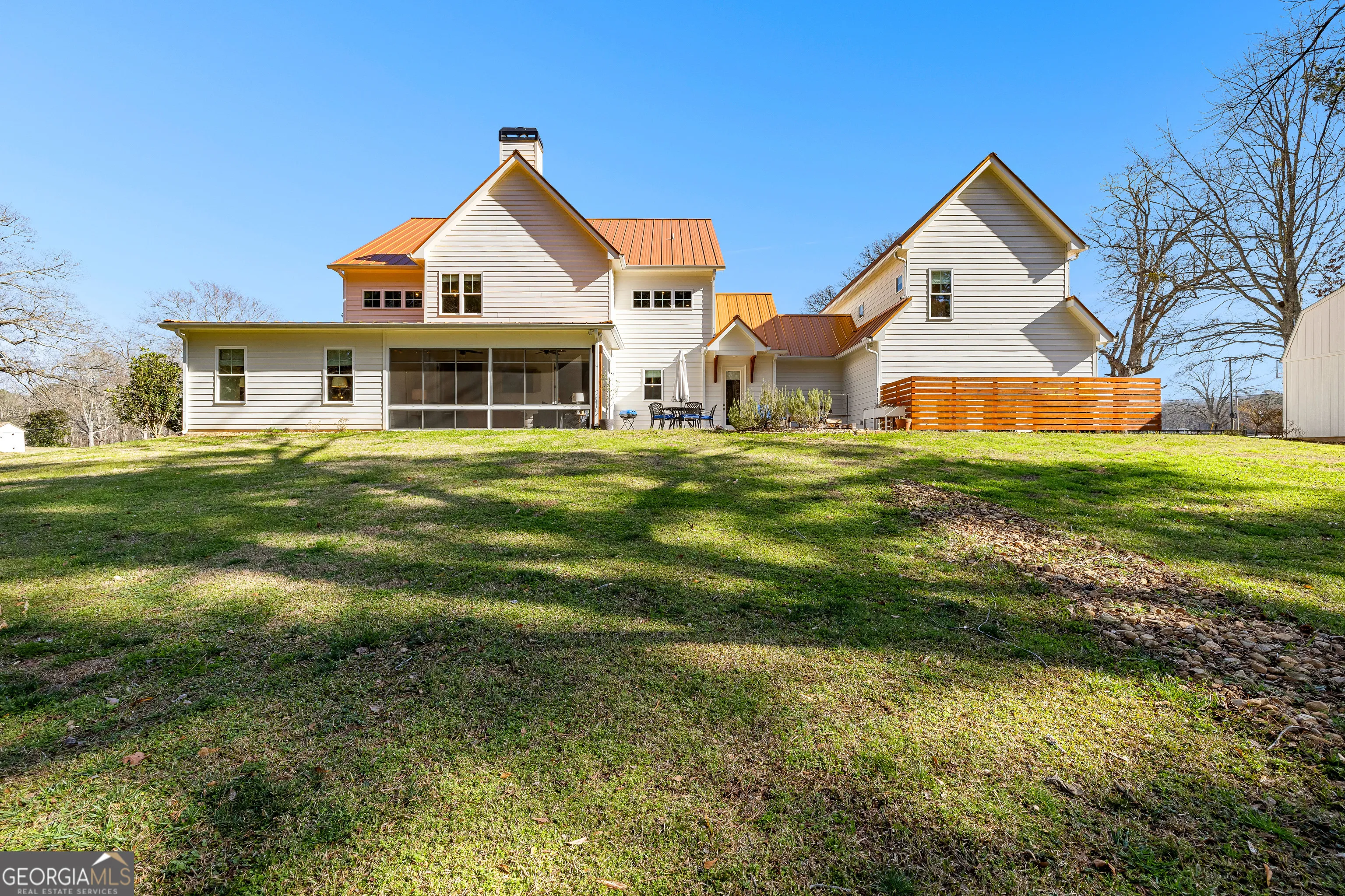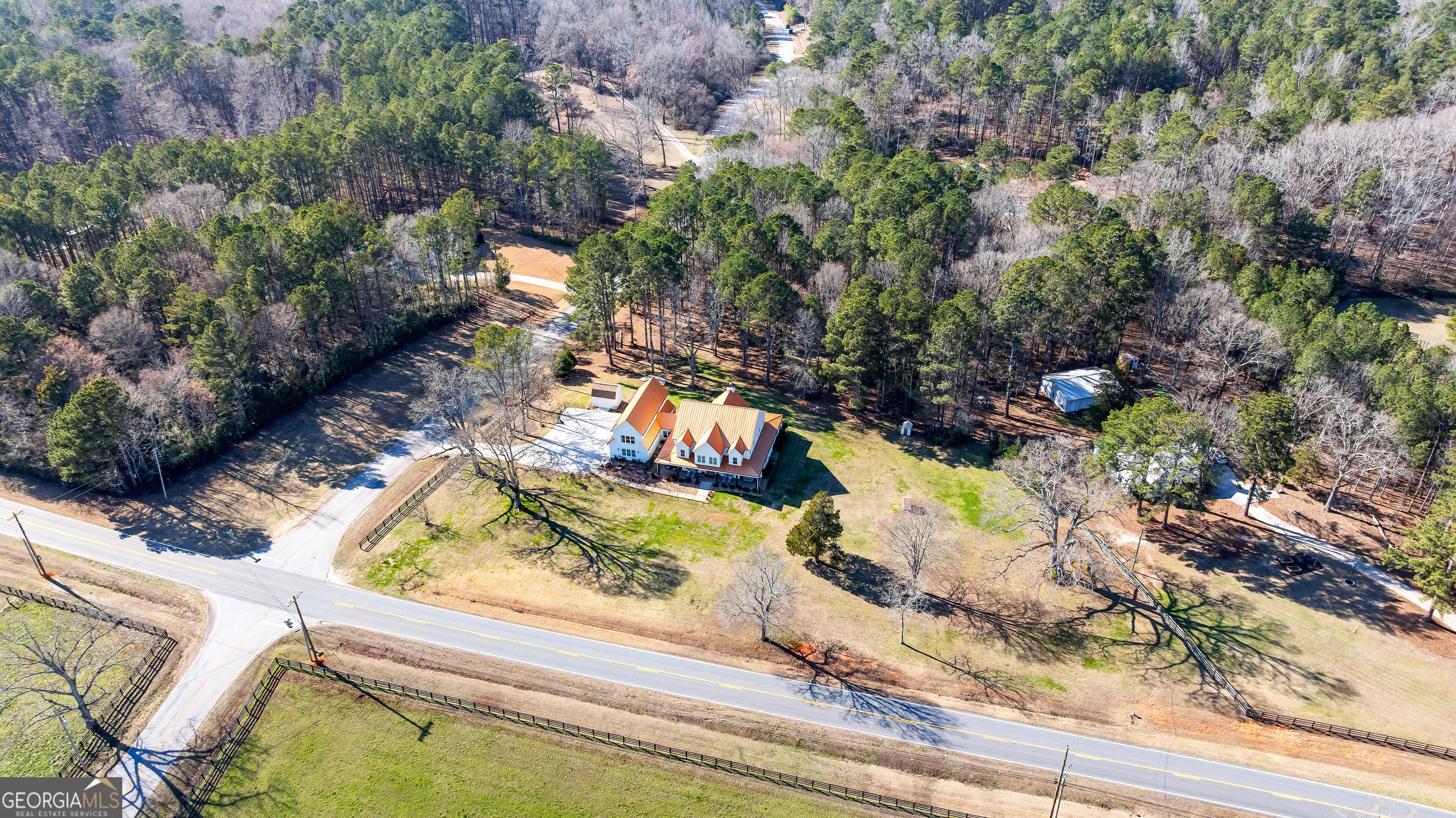 CUSTOM LUXURY FARMHOUSE on 3.37 Acres. Custom built in 2022, this luxury farmhouse offers over 6,200 square feet of beautifully designed living space with five bedrooms, five-and-a-half bathrooms, three bedrooms on the main level, a dedicated home office, and a four-car garage with approximately 800 square feet of finished space above it. Thoughtfully designed with flexibility in mind, this home combines classic farmhouse character with high-end finishes, abundant natural light, and a layout that works for real life. Inside, the home feels bright and open thanks to the abundance of windows throughout. Nine-foot ceilings and tongue-and-groove ceiling treatments in the kitchen and dining areas add warmth and texture without feeling heavy. The kitchen features open farmhouse-style shelving, a gas range, walk-in pantry, ample cabinetry, and two large prep tables in place of a traditional island, creating multiple gathering and work zones that feel casual, functional, and inviting. The primary suite on the main level feels like a true retreat, featuring an oversized shower with multiple shower heads, a striking copper freestanding tub, and custom closet built-ins. Two additional main-level bedrooms and a dedicated office provide excellent flexibility for guests, family, or working from home. The three-season porch adds living space and great views to the backyard. Upstairs are two more bedrooms along with a game room, media room, and bonus room, ideal for entertaining, hobbies, or creating separate living zones. One of the most unique features of the home is the finished space above the four-car garage. With a full bathroom, massive closet, tons of natural light, and a separate entrance from the garage, this approximately 800-square-foot space is perfect for an in-law suite, private office, studio, or future apartment conversion. Situated on a 3.37-acre corner lot, the property offers a large flat front yard and a wooded backyard that provides privacy without feeling closed in. There is no HOA, plenty of room for a future pool, and an existing well that can be used for irrigation. The home is on public water, septic, and has strong internet service. Located on Old Greenville Road in Fayetteville, you get a peaceful, country feel while still being roughly 10 minutes to Peachtree City grocery shopping, about 15 minutes to the Fayette Pavilion, and approximately 20 minutes to Trilith. Downtown Atlanta is less than an hour and Hartsfield Jackson Airport is a little over 30 minutes away. Zoned for Sarah Harp Minter Elementary, Whitewater Middle, and Whitewater High School. Additional features include insulated interior walls for enhanced sound control and energy efficiency, a tankless water heater, whole-home water filtration and softener system, and in-ceiling speakers in the game room, theater room, workout room, and office. The four-car garage is equipped with two Level 2 EV charging outlets, and the property includes an in-ground irrigation system that can be run off the existing well for efficient landscape watering.