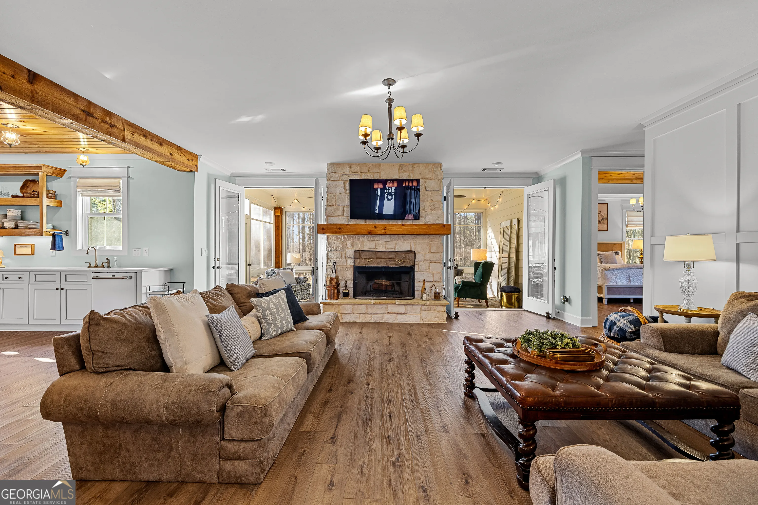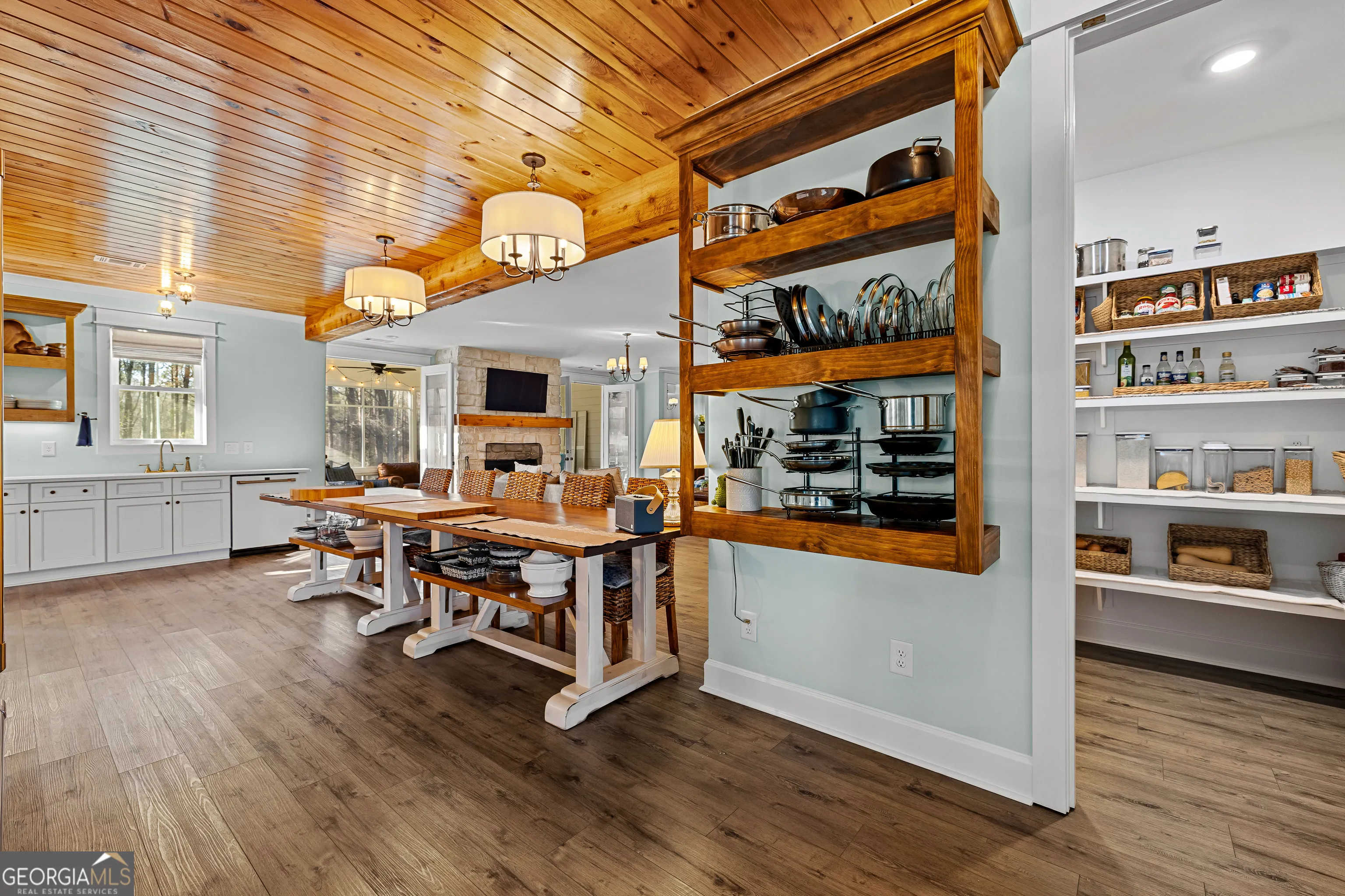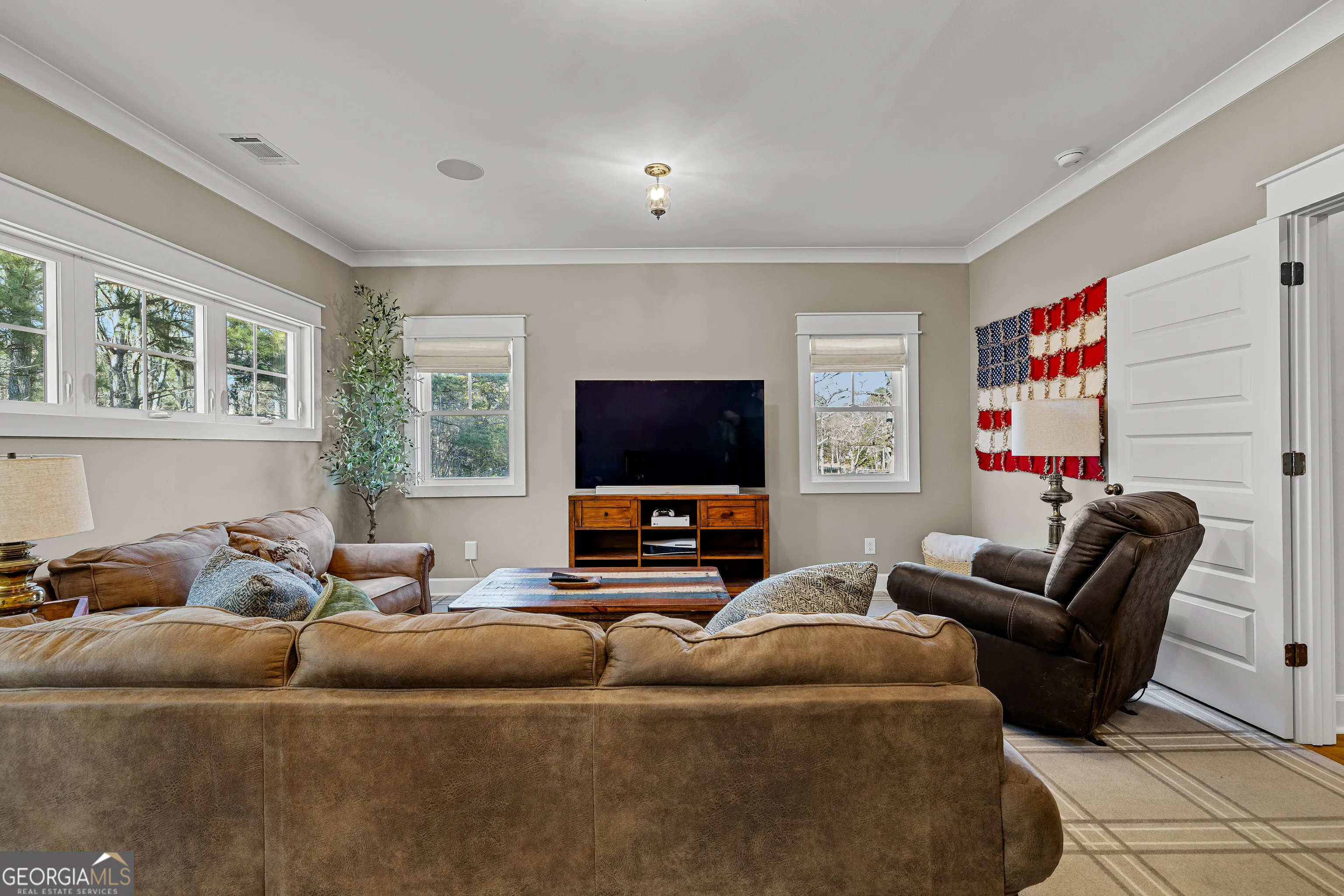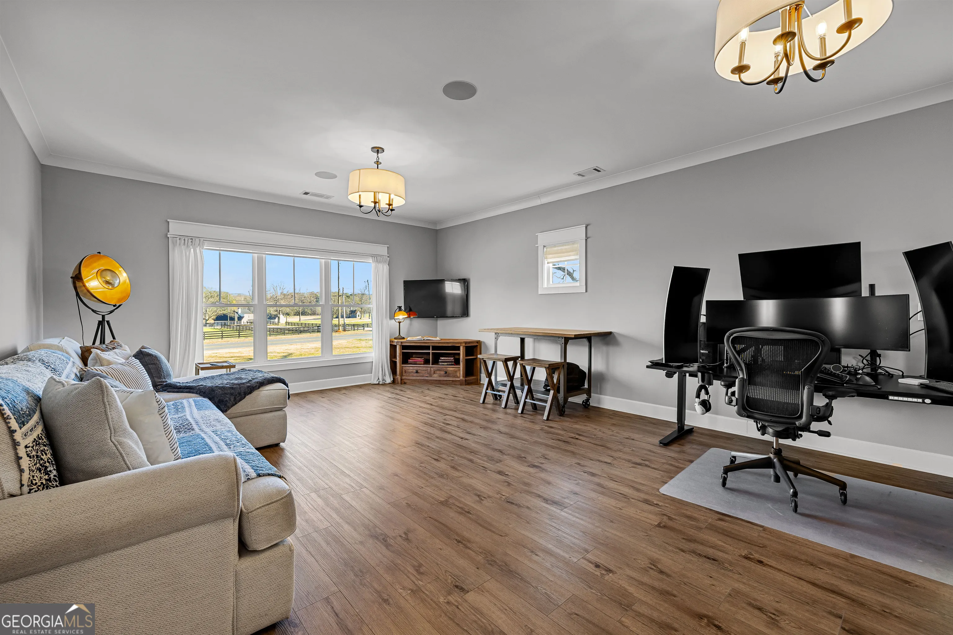 CUSTOM LUXURY FARMHOUSE on 3.37 Acres. Custom built in 2022, this luxury farmhouse offers over 6,200 square feet of beautifully designed living space with five bedrooms, five-and-a-half bathrooms, three bedrooms on the main level, a dedicated home office, and a four-car garage with approximately 800 square feet of finished space above it. Thoughtfully designed with flexibility in mind, this home combines classic farmhouse character with high-end finishes, abundant natural light, and a layout that works for real life. Inside, the home feels bright and open thanks to the abundance of windows throughout. Nine-foot ceilings and tongue-and-groove ceiling treatments in the kitchen and dining areas add warmth and texture without feeling heavy. The kitchen features open farmhouse-style shelving, a gas range, walk-in pantry, ample cabinetry, and two large prep tables in place of a traditional island, creating multiple gathering and work zones that feel casual, functional, and inviting. The primary suite on the main level feels like a true retreat, featuring an oversized shower with multiple shower heads, a striking copper freestanding tub, and custom closet built-ins. Two additional main-level bedrooms and a dedicated office provide excellent flexibility for guests, family, or working from home. The three-season porch adds living space and great views to the backyard. Upstairs are two more bedrooms along with a game room, media room, and bonus room, ideal for entertaining, hobbies, or creating separate living zones. One of the most unique features of the home is the finished space above the four-car garage. With a full bathroom, massive closet, tons of natural light, and a separate entrance from the garage, this approximately 800-square-foot space is perfect for an in-law suite, private office, studio, or future apartment conversion. Situated on a 3.37-acre corner lot, the property offers a large flat front yard and a wooded backyard that provides privacy without feeling closed in. There is no HOA, plenty of room for a future pool, and an existing well that can be used for irrigation. The home is on public water, septic, and has strong internet service. Located on Old Greenville Road in Fayetteville, you get a peaceful, country feel while still being roughly 10 minutes to Peachtree City grocery shopping, about 15 minutes to the Fayette Pavilion, and approximately 20 minutes to Trilith. Downtown Atlanta is less than an hour and Hartsfield Jackson Airport is a little over 30 minutes away. Zoned for Sarah Harp Minter Elementary, Whitewater Middle, and Whitewater High School. Additional features include insulated interior walls for enhanced sound control and energy efficiency, a tankless water heater, whole-home water filtration and softener system, and in-ceiling speakers in the game room, theater room, workout room, and office. The four-car garage is equipped with two Level 2 EV charging outlets, and the property includes an in-ground irrigation system that can be run off the existing well for efficient landscape watering.