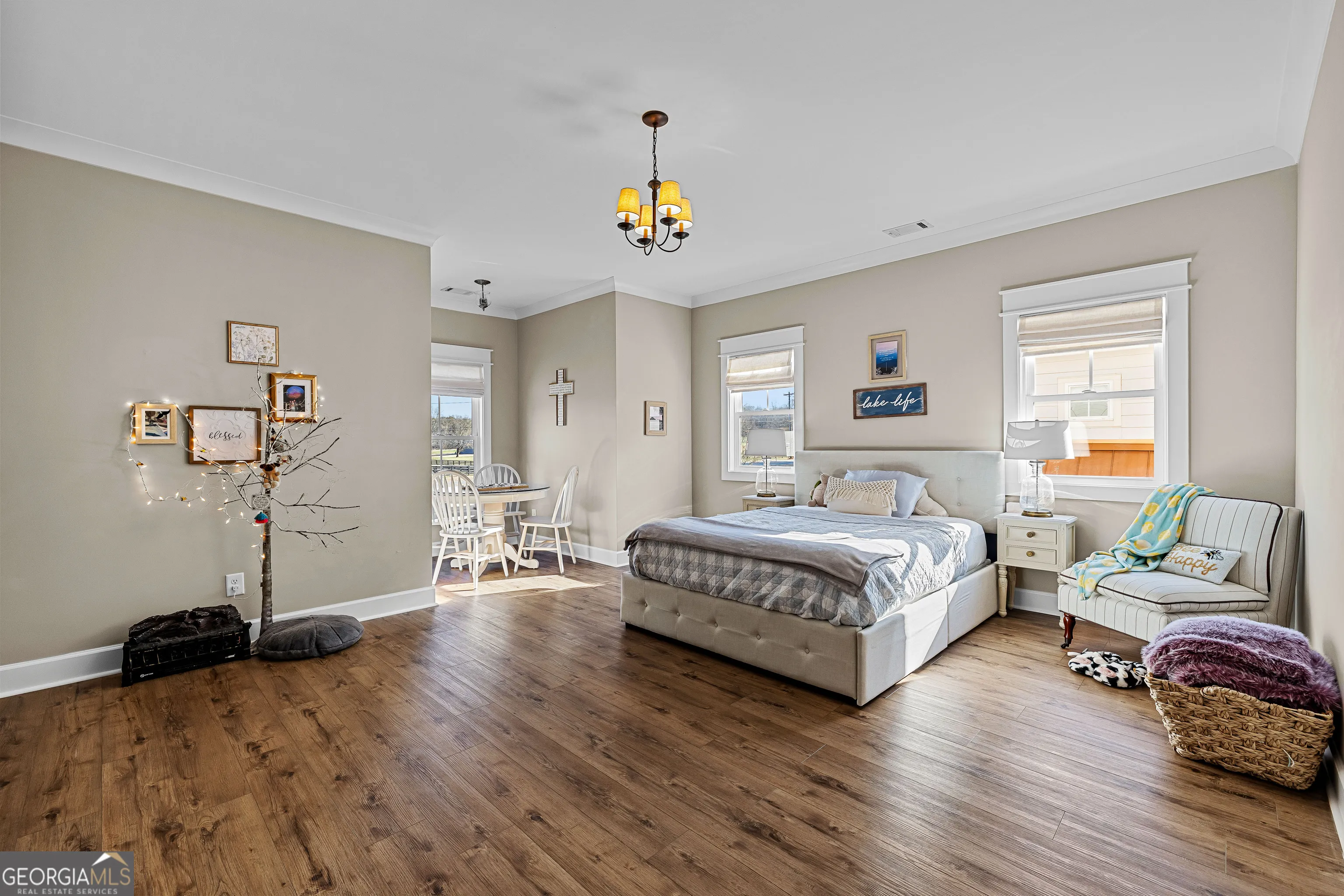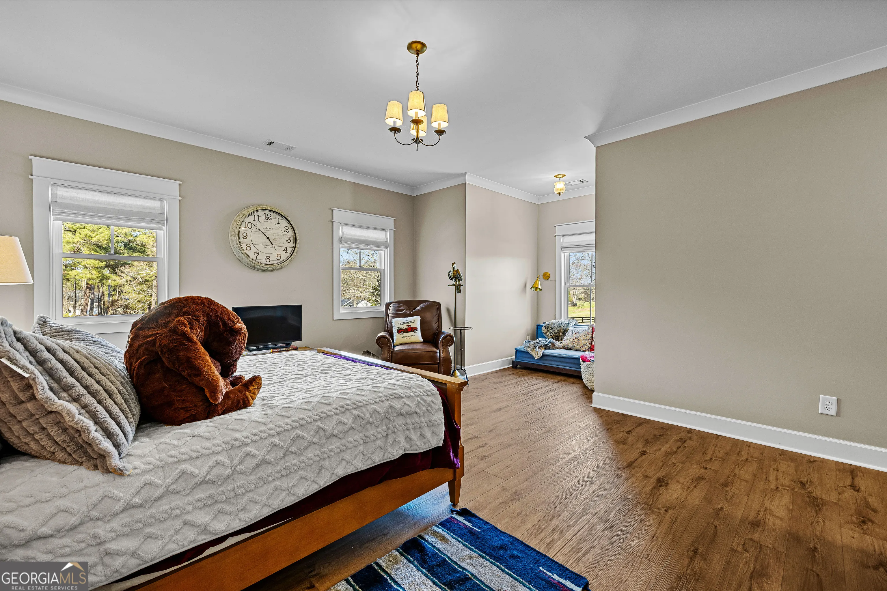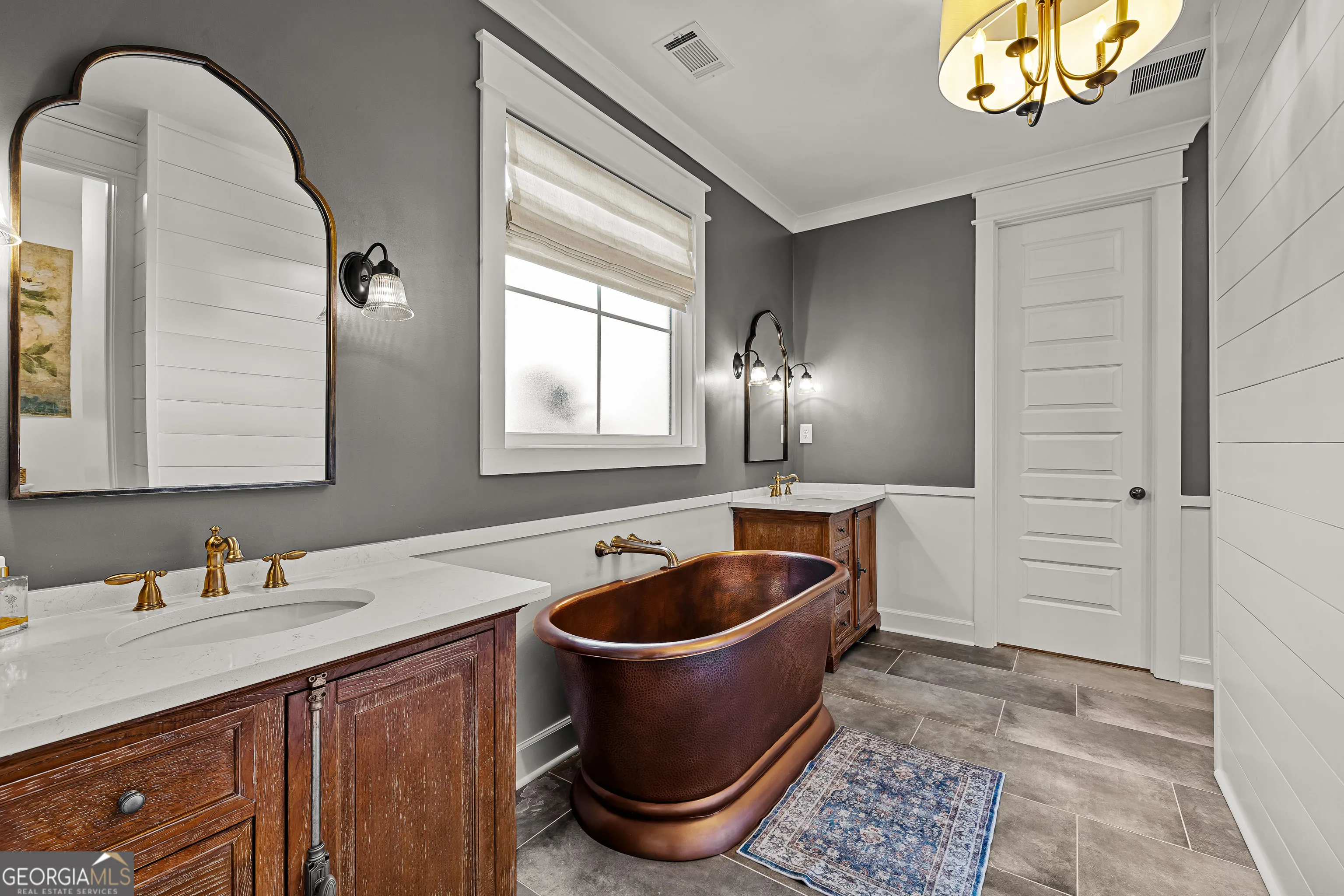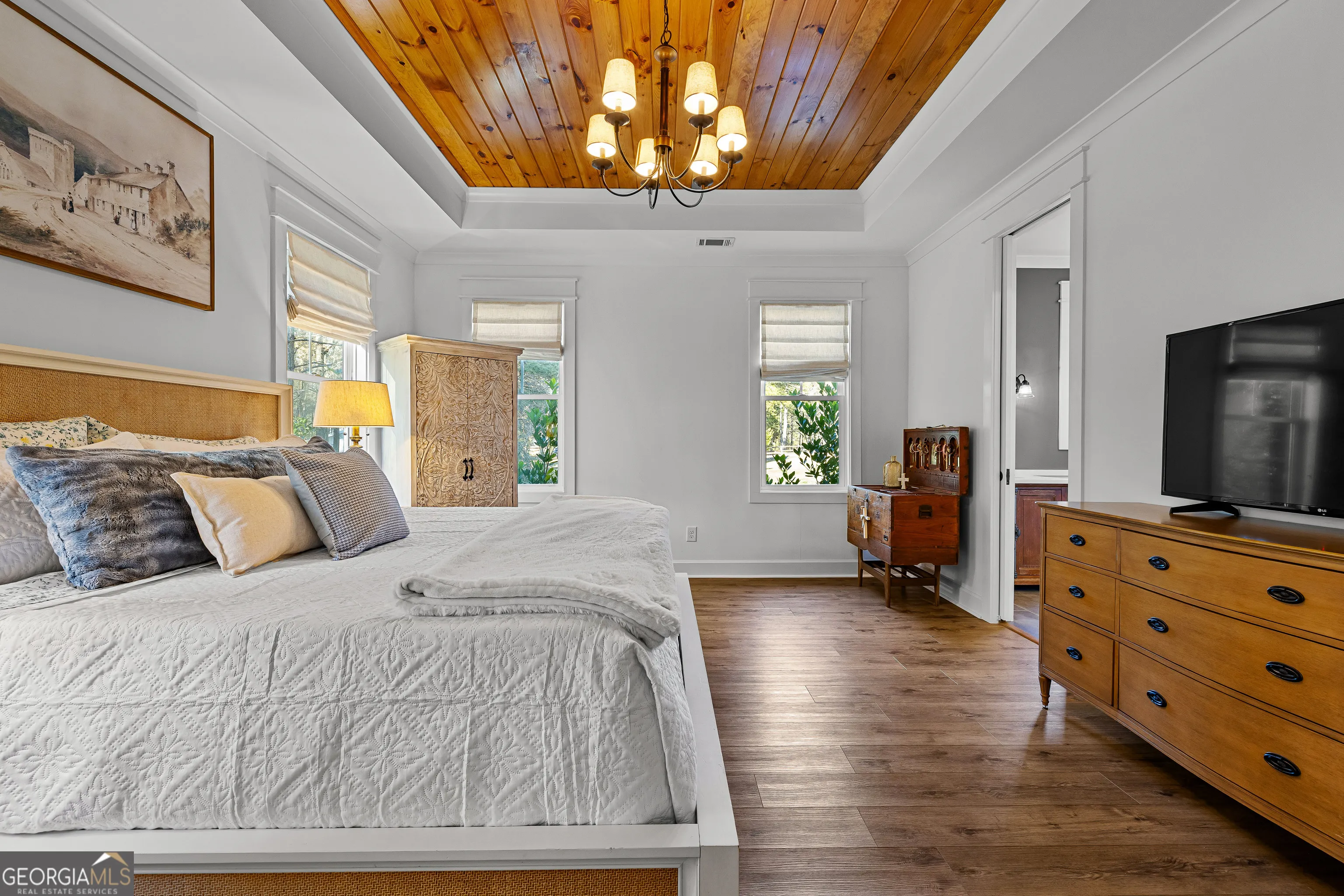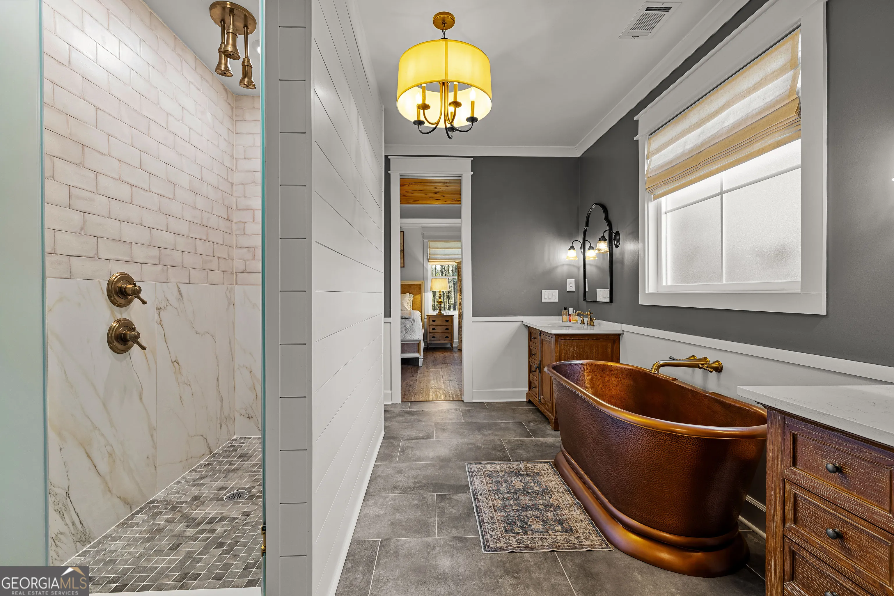 CUSTOM LUXURY FARMHOUSE on 3.37 Acres. Custom built in 2022, this luxury farmhouse offers over 6,200 square feet of beautifully designed living space with five bedrooms, five-and-a-half bathrooms, three bedrooms on the main level, a dedicated home office, and a four-car garage with approximately 800 square feet of finished space above it. Thoughtfully designed with flexibility in mind, this home combines classic farmhouse character with high-end finishes, abundant natural light, and a layout that works for real life. Inside, the home feels bright and open thanks to the abundance of windows throughout. Nine-foot ceilings and tongue-and-groove ceiling treatments in the kitchen and dining areas add warmth and texture without feeling heavy. The kitchen features open farmhouse-style shelving, a gas range, walk-in pantry, ample cabinetry, and two large prep tables in place of a traditional island, creating multiple gathering and work zones that feel casual, functional, and inviting. The primary suite on the main level feels like a true retreat, featuring an oversized shower with multiple shower heads, a striking copper freestanding tub, and custom closet built-ins. Two additional main-level bedrooms and a dedicated office provide excellent flexibility for guests, family, or working from home. The three-season porch adds living space and great views to the backyard. Upstairs are two more bedrooms along with a game room, media room, and bonus room, ideal for entertaining, hobbies, or creating separate living zones. One of the most unique features of the home is the finished space above the four-car garage. With a full bathroom, massive closet, tons of natural light, and a separate entrance from the garage, this approximately 800-square-foot space is perfect for an in-law suite, private office, studio, or future apartment conversion. Situated on a 3.37-acre corner lot, the property offers a large flat front yard and a wooded backyard that provides privacy without feeling closed in. There is no HOA, plenty of room for a future pool, and an existing well that can be used for irrigation. The home is on public water, septic, and has strong internet service. Located on Old Greenville Road in Fayetteville, you get a peaceful, country feel while still being roughly 10 minutes to Peachtree City grocery shopping, about 15 minutes to the Fayette Pavilion, and approximately 20 minutes to Trilith. Downtown Atlanta is less than an hour and Hartsfield Jackson Airport is a little over 30 minutes away. Zoned for Sarah Harp Minter Elementary, Whitewater Middle, and Whitewater High School. Additional features include insulated interior walls for enhanced sound control and energy efficiency, a tankless water heater, whole-home water filtration and softener system, and in-ceiling speakers in the game room, theater room, workout room, and office. The four-car garage is equipped with two Level 2 EV charging outlets, and the property includes an in-ground irrigation system that can be run off the existing well for efficient landscape watering.