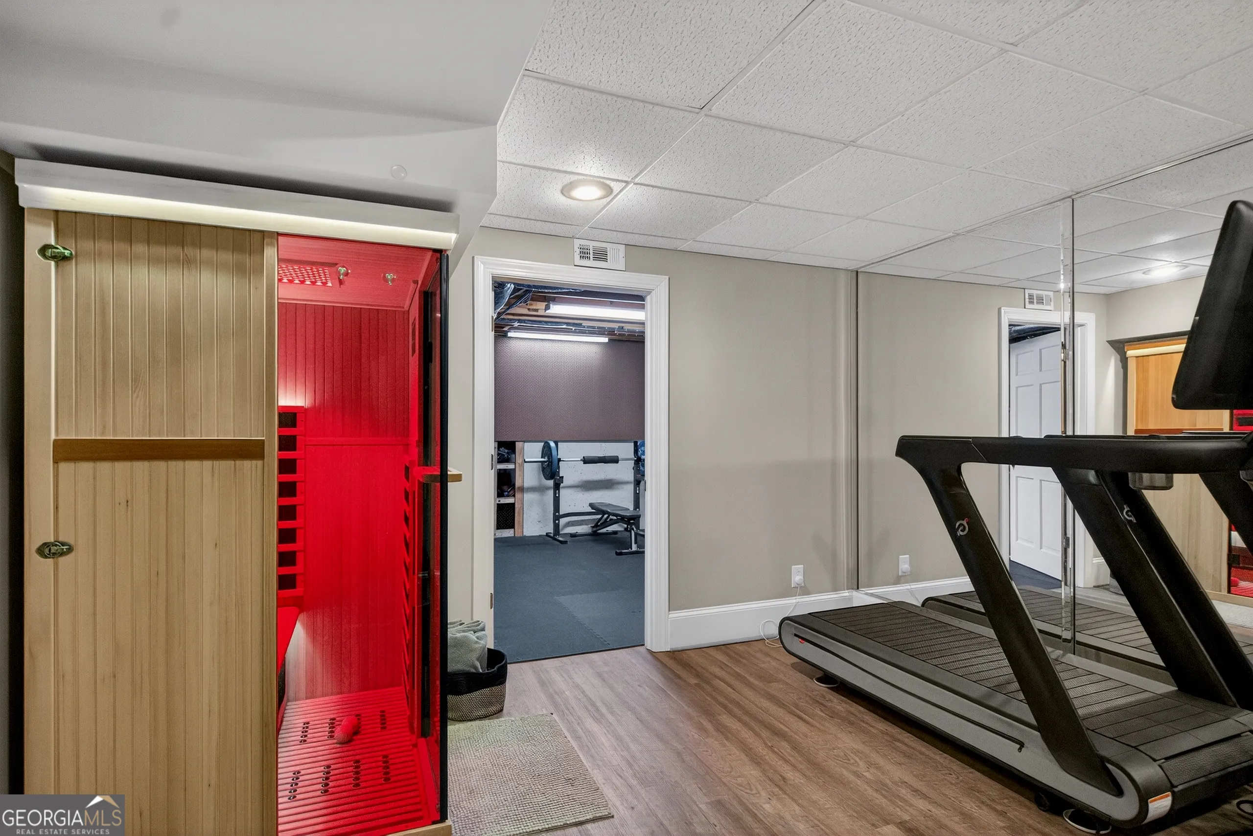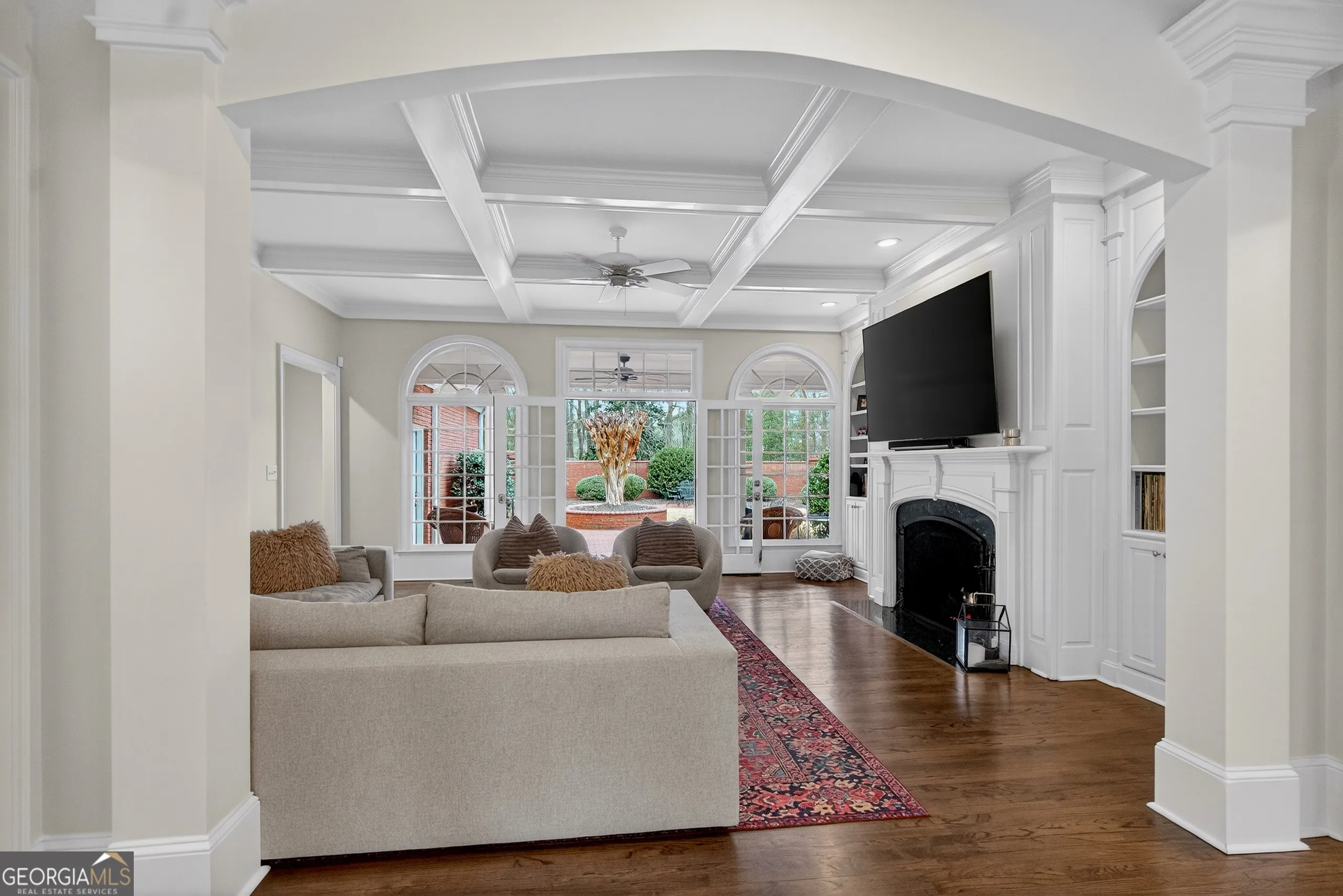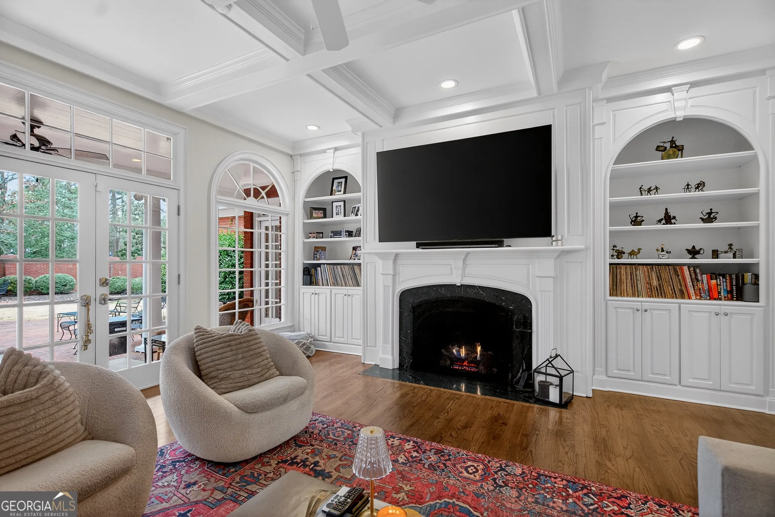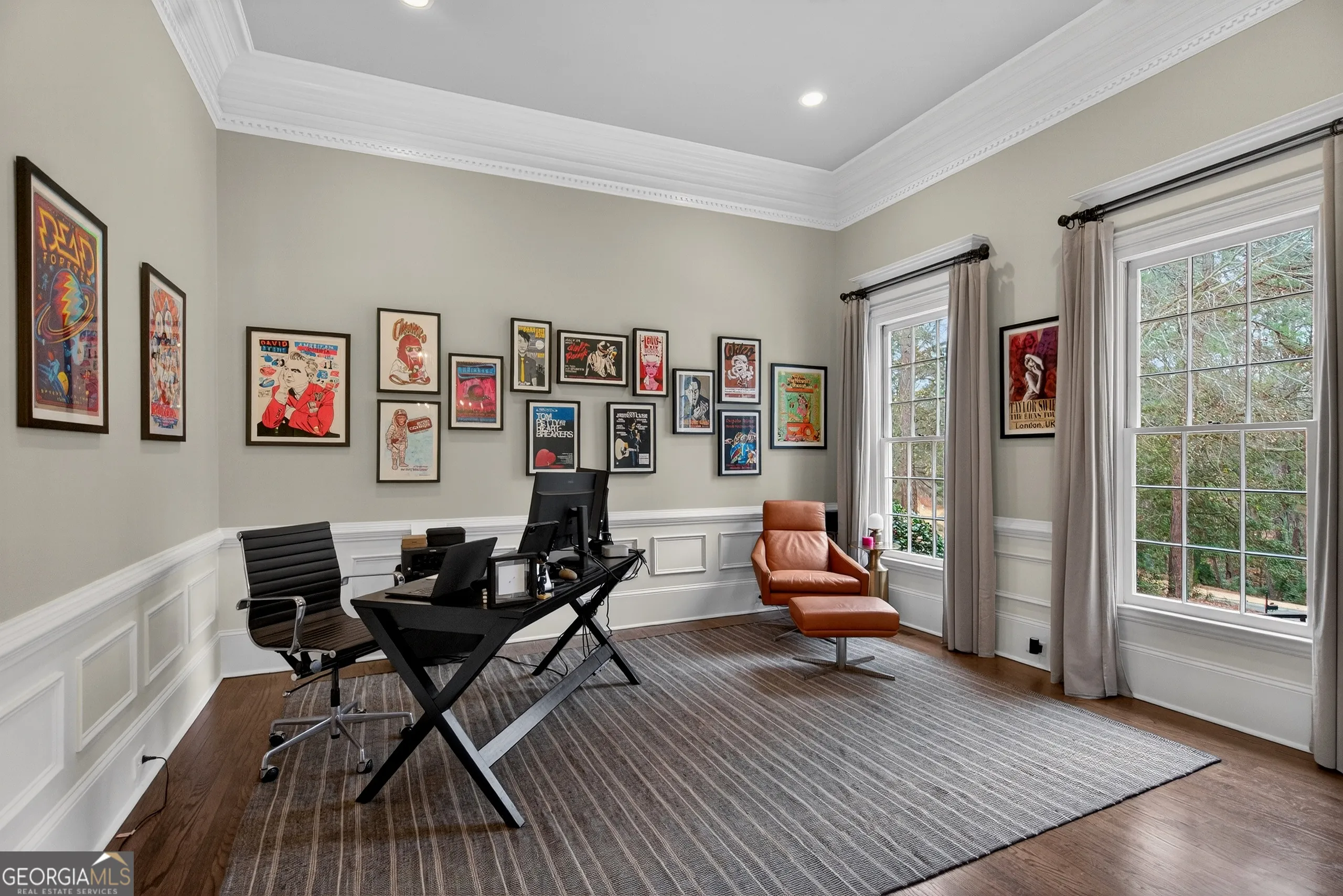 Turnkey executive estate in Moss Creek, one of LaGrange’s most sought-after communities. Priced to include a separately deeded adjacent buildable lot. Five bedrooms, five full baths, and 5,698 sq ft of move-in ready living space across three finished levels on two private acres. Exceptional architectural millwork throughout: coffered ceilings, double-stepped tray ceilings, triple crown molding with dentil detail, raised panel wainscoting, and decorative columns with full capitals. Main level features a gourmet kitchen with granite countertops, floor-to-ceiling pantry, marble backsplash, brand new Bosch dishwasher, GE Cafe refrigerator, double oven, six-burner gas stove, breakfast bar, and walk-in pantry opening to a vaulted family room with gas fireplace, arched windows, and hardwood floors. Brand new GE Profile washer and dryer with steam and Smart Wash technology. Master suite with his-and-her vanities, tile shower, freestanding tub, and oversized walk-in closet. Finished basement with whitewashed brick gas fireplace, additional bedrooms, full bath, climate-controlled home gym with Peloton treadmill and infrared sauna, plus a professionally soundproofed studio ideal for remote work, video calls, music production, or podcasting. Smart home throughout: WiZ by Philips color-capable lighting across interior rooms and five exterior zones, eight HD security cameras, three smart thermostats, monitored alarm, and four Google Nest WiFi routers. Home wired for 1-gig fiber; buyer establishes service. Brand new roof (2025). Water heater replaced 5 years ago. Very large septic tank emptied less than 1 year ago. Both fireplaces converted from wood to gas. Professional landscaping maintained. Moss Creek clubhouse and pristine saltwater pool directly across the street. Tennis courts, West Point Lake access, sidewalks, street lights, underground utilities. HOA $695/year per lot. Ideal for Kia Georgia executives and corporate relocations. Adjacent buildable lot included at list price. Furnishings available under separate agreement. Minutes to Downtown LaGrange, West Point Lake, Kia Georgia, Callaway Gardens, and I-85.