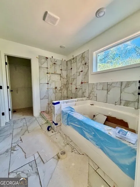 : Walk-In Closet(s), Double Vanity, Split Bedroom Plan, Tile Bath, Pulldown Attic Stairs, Separate Shower, Soaking Tub