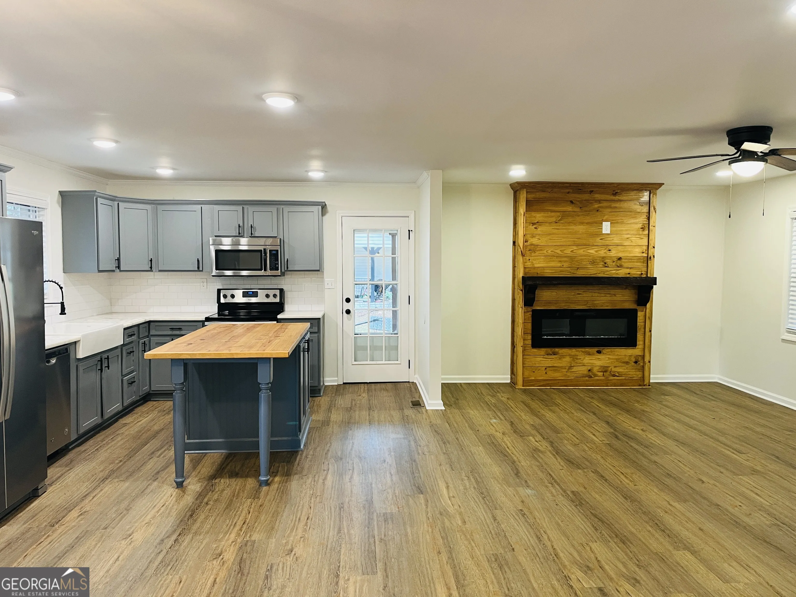 Beautifully remodeled 3-bedroom, 2-bath home filled with charm and modern upgrades. Luxury vinyl plank flooring runs throughout the home, enhancing its seamless, open feel. The stunning kitchen features a large custom butcher block island, stainless steel appliances, marble countertops, and a stylish tile backsplash. The open-concept kitchen and family room are anchored by a custom electric fireplace, creating a warm and inviting focal point ideal for everyday living and entertaining. Both bathrooms have been thoughtfully updated, including a beautifully designed custom tile shower. Enjoy outdoor living from the welcoming covered front porch or step out back to a large, private, fully fenced backyard with a deck-perfect for relaxing or hosting guests. While the home carries a Palmetto address, it is located in desirable Coweta County and zoned for Brooks Elementary, Bass Middle School, and Northgate High School. Conveniently situated just minutes from I-85, Downtown Newnan, shopping, dining, and more.