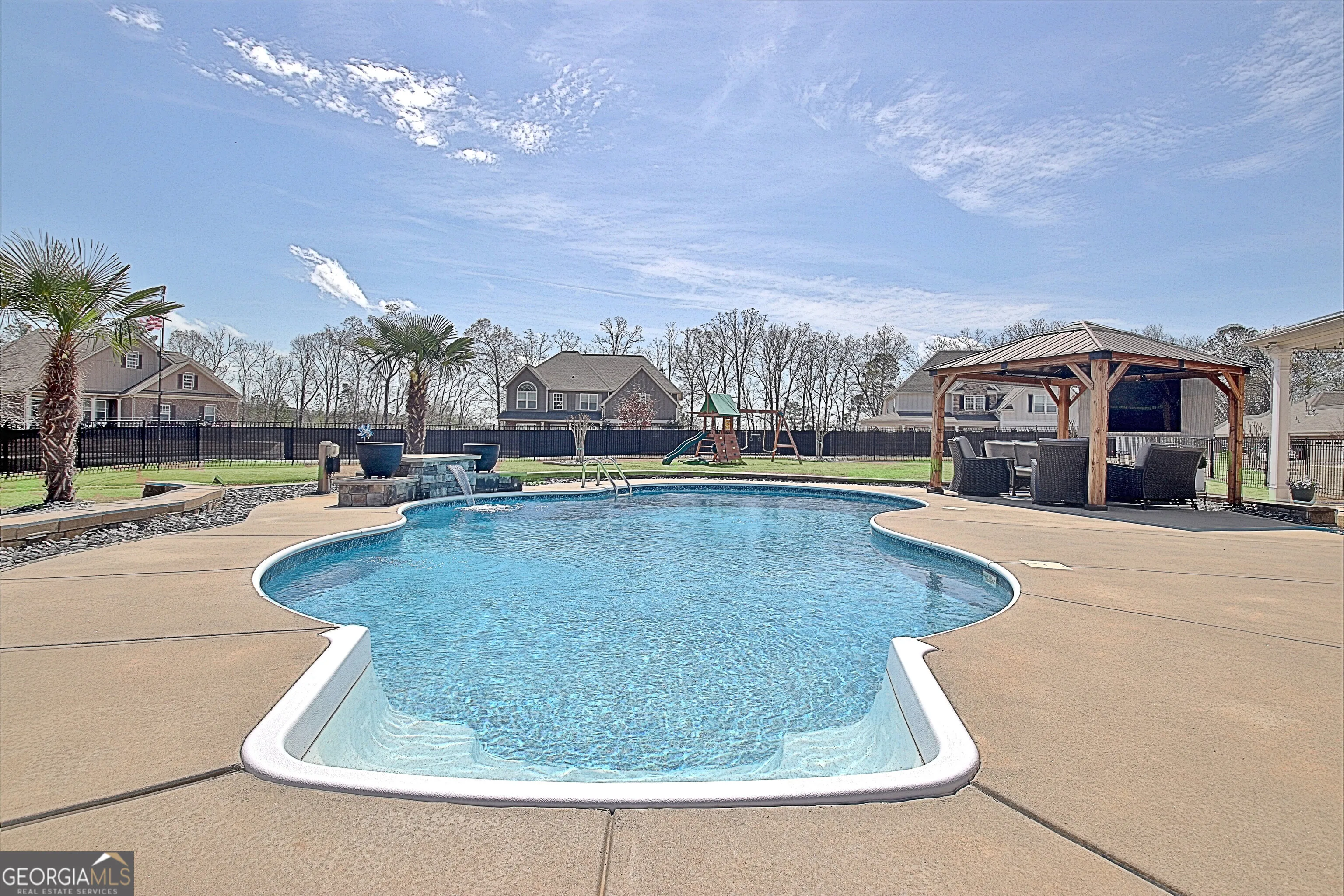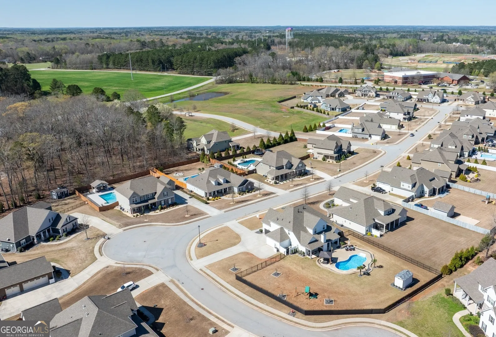 Welcome to this stunning home in sought-after Senoia, where charm, space, and outdoor living come together beautifully. A welcoming covered front porch that wraps to the side sets the tone for this inviting property, while the side-entry three-car garage adds both convenience and curb appeal. Step inside to a dramatic two-story foyer that opens to a formal dining room on the left, perfect for hosting gatherings and special occasions. The spacious family room features a stacked-stone gas fireplace, creating a warm and cozy centerpiece for everyday living. The kitchen offers plenty of room to cook and gather, complete with a bright breakfast area overlooking the backyard. The primary suite on the main level provides comfort and privacy, while upstairs you’ll find four additional bedrooms and a huge vaulted bonus/rec room, ideal for a playroom, media room, or flexible living space. Outdoor living is truly exceptional. Enjoy relaxing on the covered back porch overlooking the in-ground saltwater pool, complete with a stone waterfall feature. The pool’s pump and liner are just three years old, and the heater is two years old, offering peace of mind for years to come. A gazebo with power adds the perfect shaded retreat for entertaining or unwinding poolside. The beautifully maintained corner lot showcases upgraded landscaping, supported by a six-zone irrigation system covering the front, back, and side yards. Gutter drains have been designed to flow naturally away from the home, adding to the thoughtful details throughout the property. This incredible Senoia home offers the perfect combination of elegant indoor living and resort-style outdoor amenities-a must-see for anyone looking for space, comfort, and style.