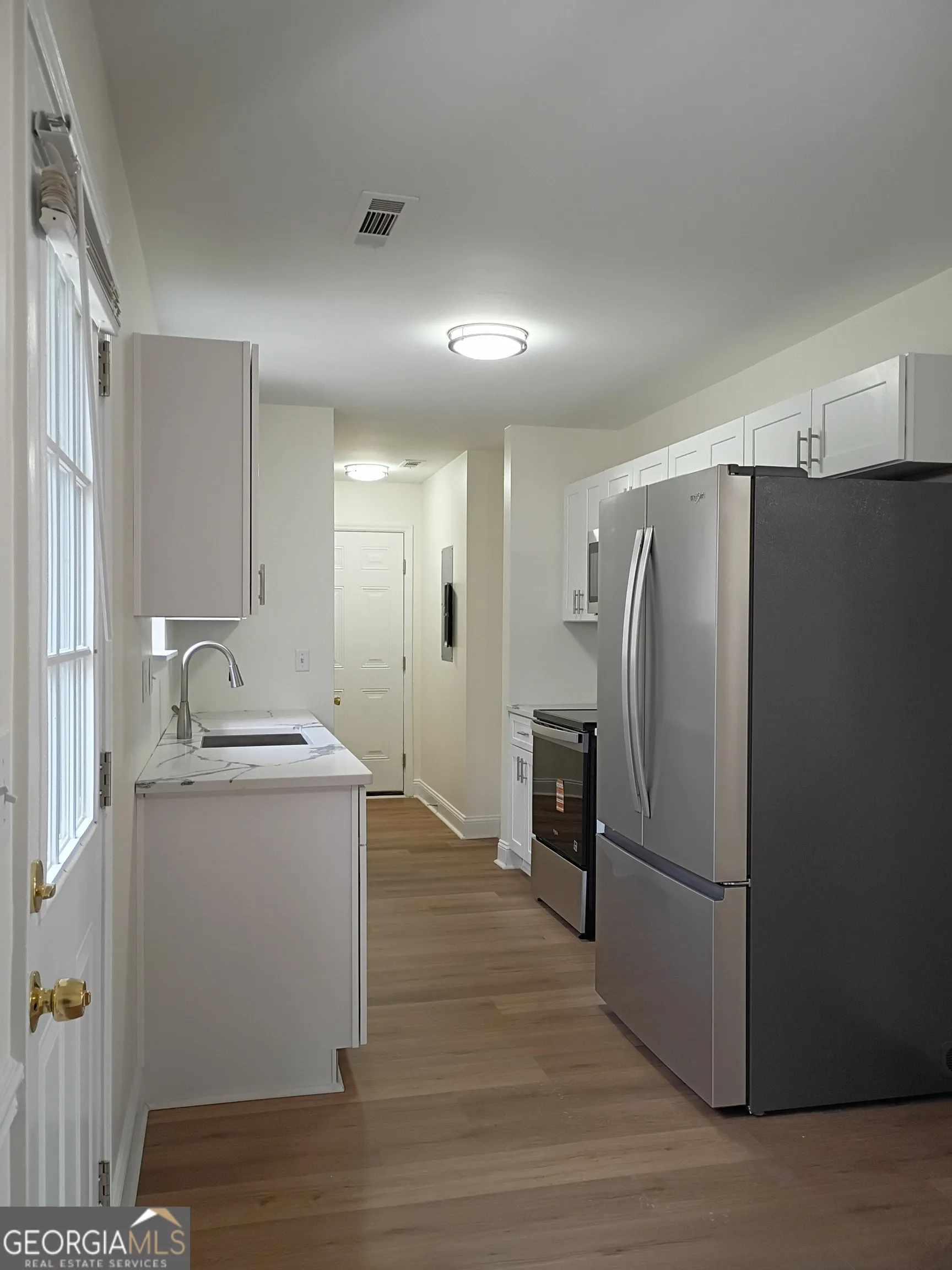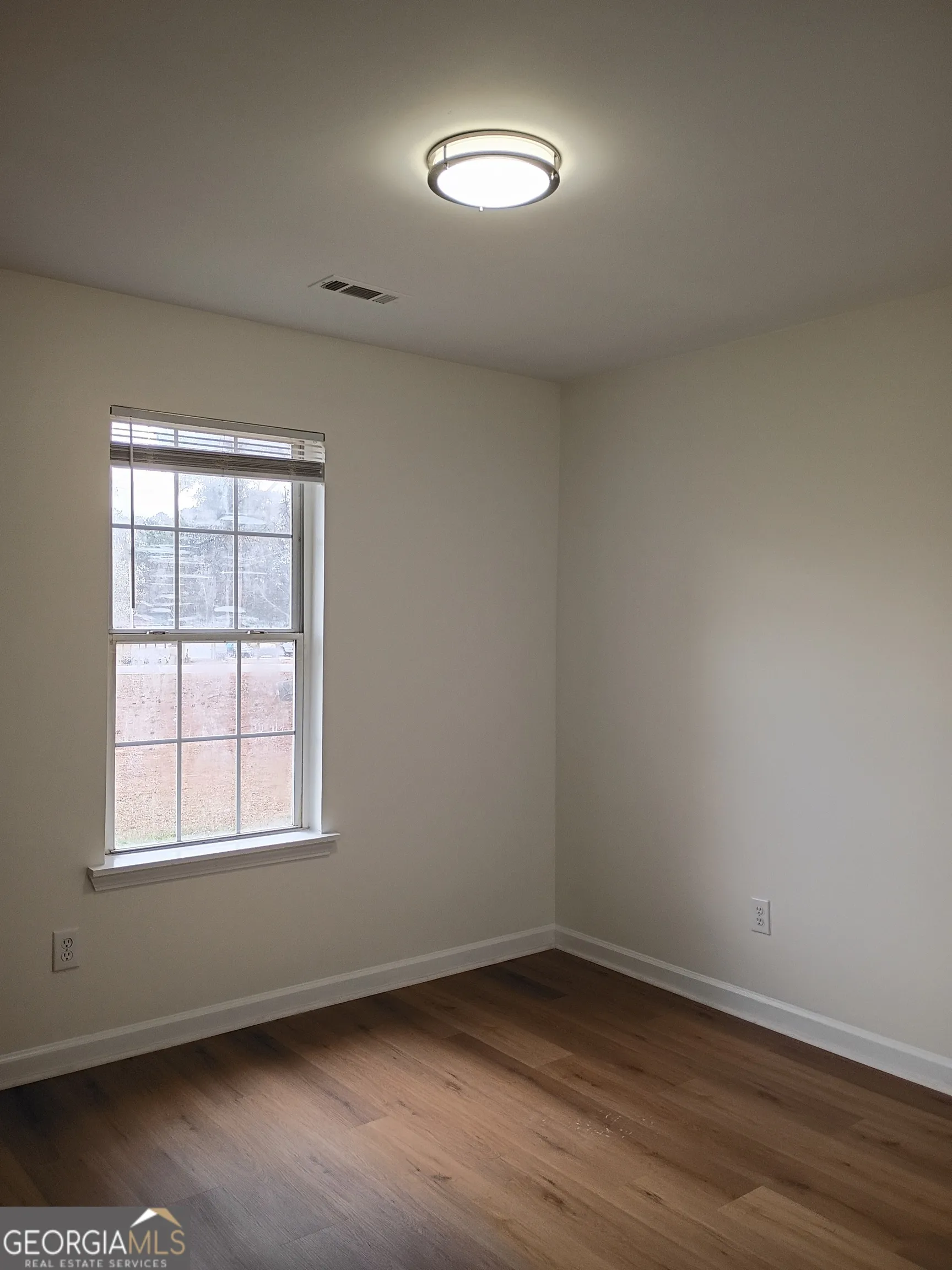 Be the first to enjoy this renovated ranch in Senoia! All walls and ceilings have fresh paint, and nearly all the flooring is new. Lots of natural light in every room. The living room has a vaulted ceiling, and leads to a dining space, which has a door to the huge wood-lined back yard. The kitchen has brand new appliances, and new quartz countertops, with a window at the sink overlooking the serene back yard. The kitchen connects to the laundry space, which has a door to the driveway. One side of the living room leads to the master suite with a large walk-in shower. The other side of the living room has a short hallway with two big closets, and leads to a full bathroom and two bedrooms. Both bedrooms have large closets.