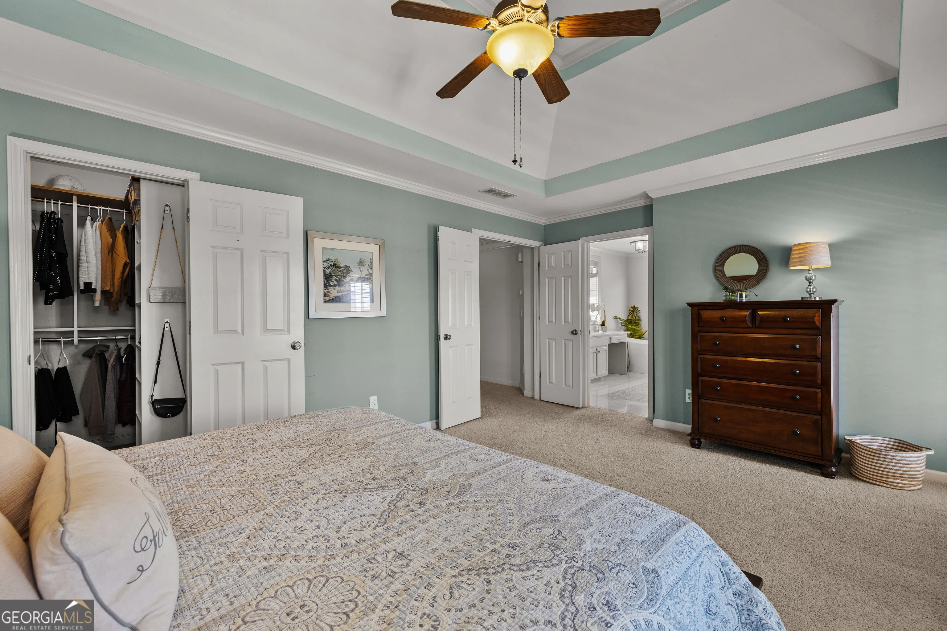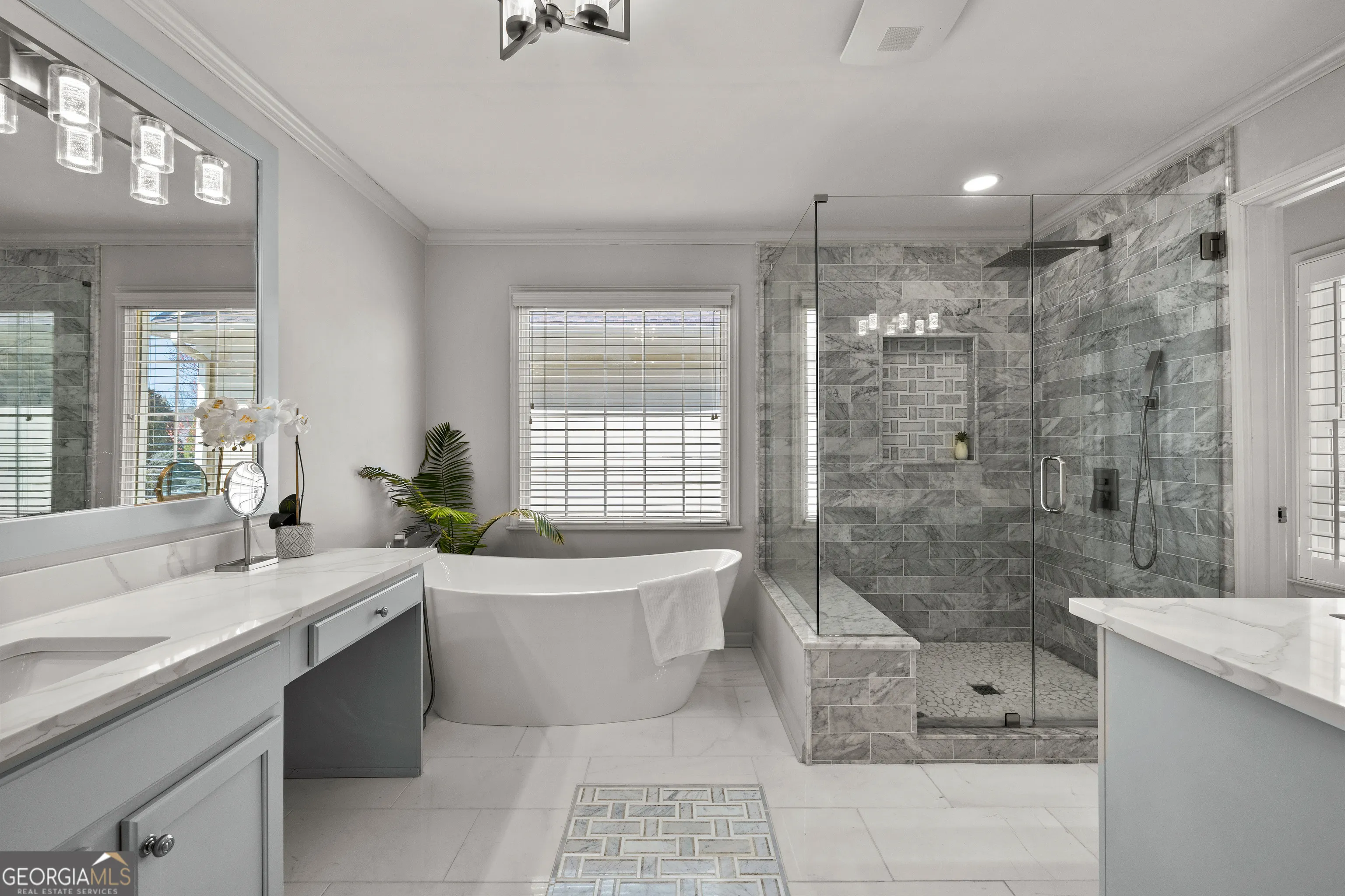 TIMELESS SOUTHERN CLASSIC WITH THE LATEST MODERN UPDATES in Peachtree City’s desirable CENTENNIAL neighborhood! Two-story stacked porches welcome you into this breathtaking beauty overlooking the Village Green. Truly “move-in ready” you will enjoy over 4,600 square feet including a FULL FINISHED BASEMENT, OVERSIZED SEPARATE BONUS/OFFICE & GOLF CART GARAGE! The heart of this home is the remodeled “open concept social kitchen” with quartz island and new appliances. Bright, cozy and relaxing is the family room ambience with a stone fireplace and built-ins. Separate dining room with a butler’s pantry and the inviting living room make for an entertainer’s dream home. The upper level includes the spacious primary suite with a walkout directly onto the upper level porch. Additionally, the primary has two walk-in closets and a recently remodeled “spa-like” sanctuary en suite. Relax in the free standing soaking tub or huge glass enclosed shower. Guest bedroom has its own upgraded full bath while the other two bedrooms share an updated bathroom. Laundry room with additional cabinetry is conveniently located adjacent to the bedrooms. Terrace level is a fully finished basement with 10′ ceilings including an entertainment area with built-in cabinetry, gym/office, additional finished room could be used as a bedroom/craft room, bar area/wine storage with built-in beverage cooler, finished storage space with built-in cabinetry as well as a separate golf cart garage. Relax away the hours and enjoy the sunshine on the newly-built back deck. Need a private space for work? Nothing compares to the separate finished bonus/office retreat with beamed ceiling and its own heat/air. Additional features to note are the custom plantation shutters throughout, NEW ROOF and custom closets. Two car garage with EV charger and additional storage space. Located in the top-rated MCINTOSH HIGH school district and “amenity rich” Centennial with its Olympic size waterslide pool, clubhouse, playground and tennis courts. Jump on your golf cart for a short ride to all the shopping and restaurants! Ideally located in North Peachtree City, this home allows for quick access to I-85, Atlanta and the International airport while maintaining its quiet community vibe! Don’t miss this one!