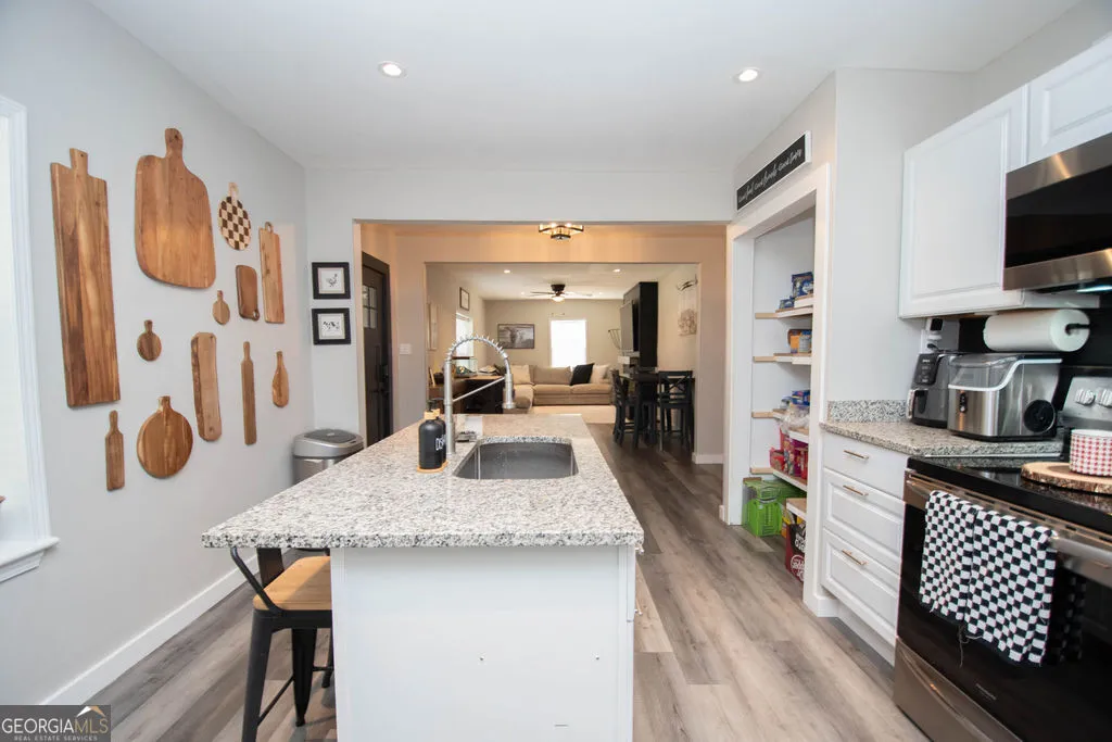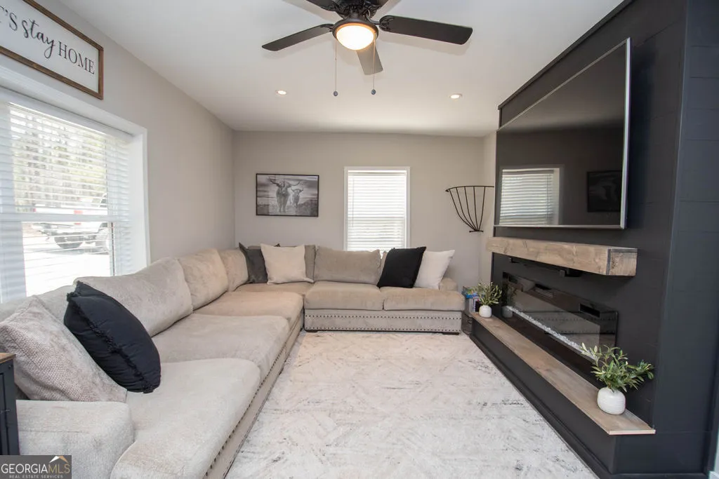 ***JUST REDUCED $6000!!! PRICED TO SELL!! Move in ready!! Unique, Fully Renovated Modern Ranch on .7 Acres Near Downtown Newnan!!! Welcome home to this one-of-a-kind modern ranch, perfectly situated on a spacious 0.7-acre lot and conveniently located just minutes from historic downtown Newnan, Sharpsburg, and I-85. This beautifully renovated 3-bedroom, 2-bath home blends contemporary design with handcrafted details throughout. Step inside to an open and inviting floor plan featuring spacious rooms, smooth ceilings, and new LVP flooring throughout the main living areas, along with new carpet in the bedrooms. The heart of the home is the modern kitchen, complete with white cabinetry, granite countertops, a large island, open pantry and ample prep and storage space, making it ideal for both everyday living and entertaining. The private extra-large owner’s suite is a true retreat, showcasing a custom handmade barn door, handcrafted wooden corner shelving, and a walk-in closet with custom wood rods and shelving. The inviting master bath features double vanities, a soaking tub and beautiful walk-in tile shower and stylish finishes. The split-bedroom floor plan provides privacy, with two generously sized secondary bedrooms, each offering spacious closets with custom-built organizers. One bedroom also features a custom wood accent wall, adding warmth and character. The spacious hall bath includes a tub/shower combination and modern touches. The open living room serves as the centerpiece of the home, highlighted by a custom-built media wall with a handcrafted mantle and a 50-inch electric fireplace insert, creating a cozy and stylish gathering space. Additional interior features include custom neutral wallpaper, industrial pipe shelving for added storage, all located in the large laundry room with convenient access to the backyard. The home’s exterior is equally impressive with cinder block construction, a rock and stucco facade, decorative rain chains, and a covered front porch supported by beautiful cedar posts, it’s the perfect place to relax and enjoy the peaceful surroundings! An outbuilding provides additional storage, and the home is total electric for efficiency. With its modern upgrades, handcrafted wood details, and unbeatable location, this truly unique Newnan property offers the perfect combination of style, comfort, and convenience. Super convenient to downtown Newnan, shopping, dining and I-85.