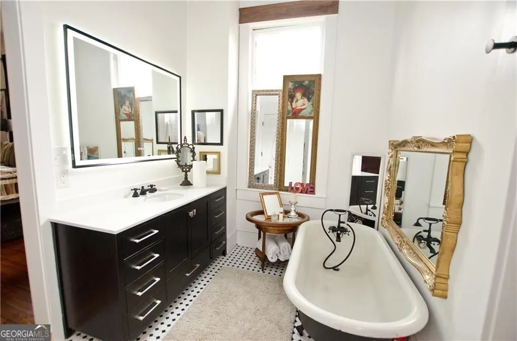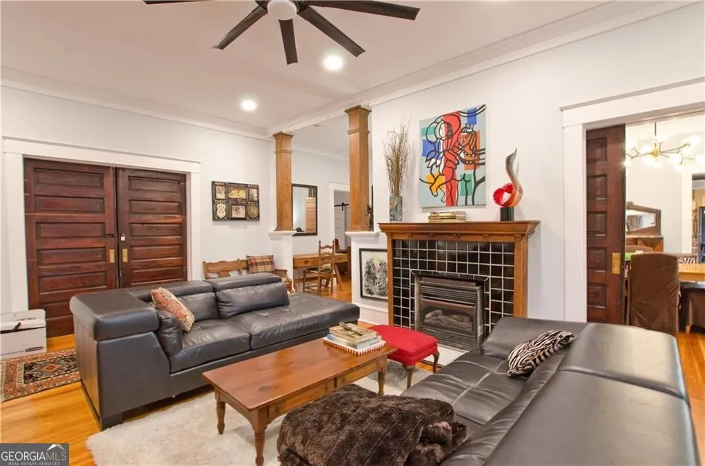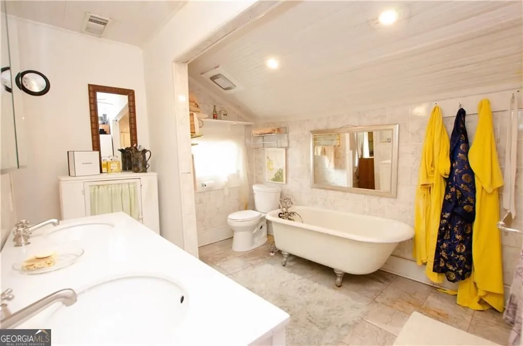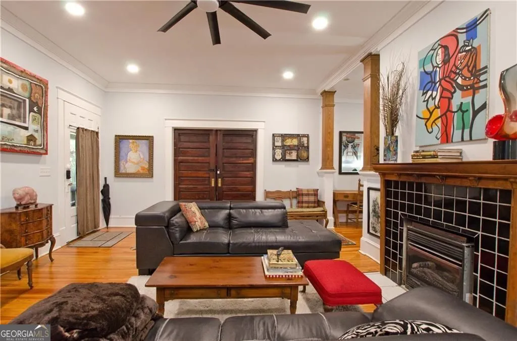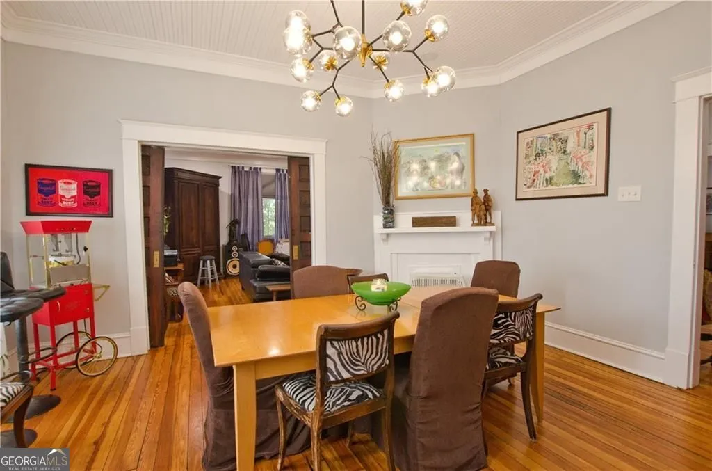 Beautiful Craftsman home built in 1937 and originally part of the Hogan Farm from which Hogansville was named. The first floor features original hardwood floors throughout, pocket doors, a living area with fireplace that opens to the dining room with fireplace and seats 10+. Kitchen features an island, gas cooktop, stainless steel appliances. The first floor has 2 side entrances and doors are original. In addition, the first floor features, a bar, wide center hallway, 2 large bedrooms and full bath, additional library, glassed in back porch which opens out to the deck and lovely gardens, laundry room with sink. A back staircase leads to the second floor which features hardwood floors, Main bedroom and an additional bedroom, beautiful bath, 2 offices, sitting area, large master walk in closet, storage area. The glassed-in back porch has large windows that look out on the beautiful deck, patio, and one of the original Hogan barns now used as a covered gathering area, potting shed, storage, gardens and lovely iron custom gates. The gardens feature Camellias, an herb garden, hydrangeas, roses. The property sits on 1+/- acres. The crawl space was encapsulated in 2023, new roof in 2021, all electrical was redone in 2023, plumbing in first floor bath redone in 2024, new insulation in 2024. 45 minutes to Hartsfield Airport, 1 hour to Atlanta and Columbus and minuets to LaGrange. Property would make a great bed and breakfast as is zoned Res/Commercial.