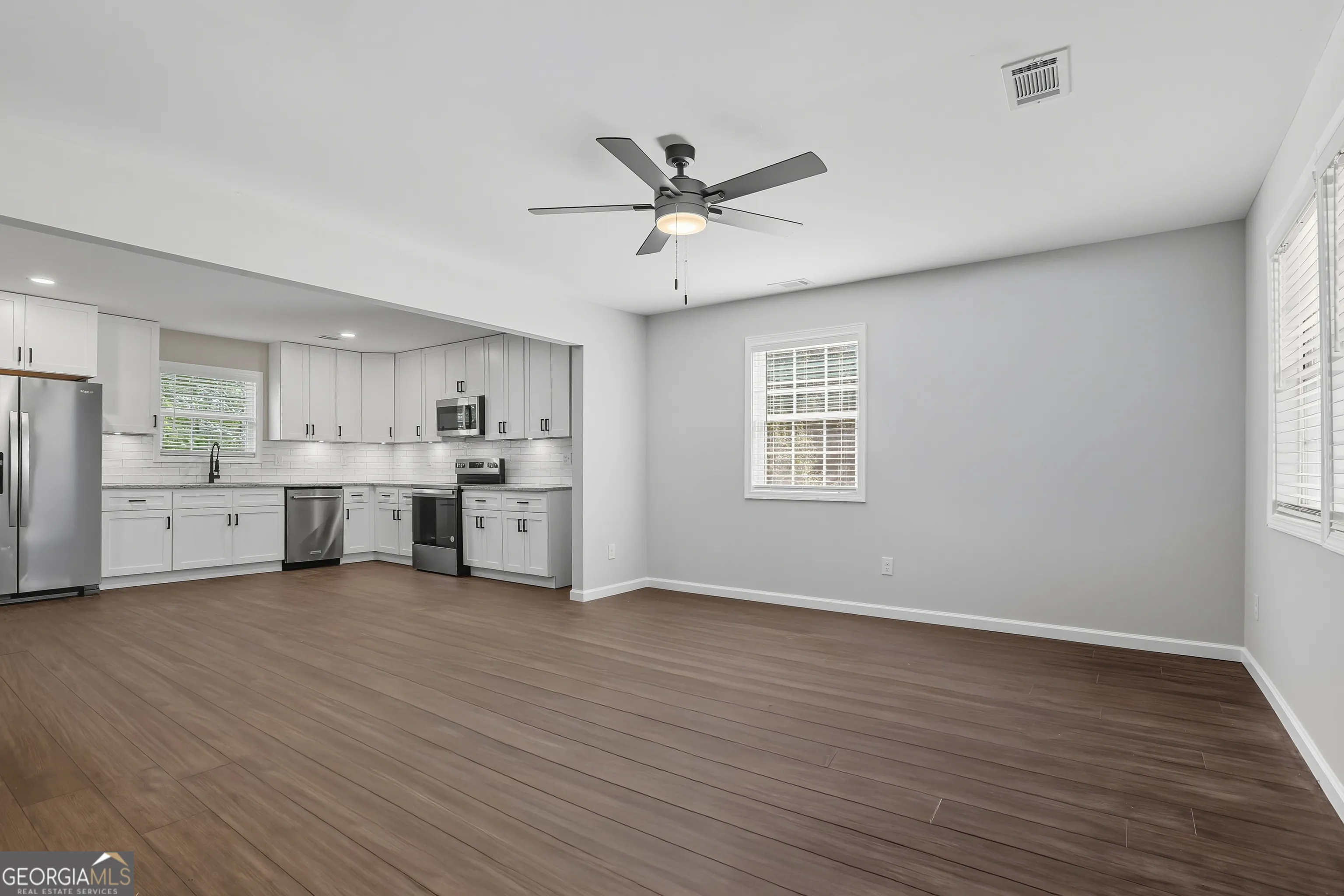 Spacious and functional, this lovely ranch home with country front porch has been fully renovated from top to bottom & down to the studs. Step onto the front porch which is all stained and has modern styled railing, 2 ceiling fans and space for plenty of outdoor furniture for outdoor living. Enter inside to a lovely open floor plan where the living room, kitchen and dining area together allow family gathering to be enjoyed. Kitchen has all new shaker styled cabinets, and new stainless appliances: dishwaher, smoothtop electric range, above range microwave and a side-by-side refrigerator. From the kitchen, the backdoor leads to a deck with same stain and modern railing as the front porch. Perfect spot for grilling. Beautiful rich colored LVP is throughout the home; light neutral wall colors and beautiful white trim, recessed lighting and under cabinet lighting in the kitchen; all new doors and black door hardware throughout; bathrooms have decorator chosen vanities, mirrors and lights. Hall bath with towel stacker & trendy shelving. New windows and 2″ faux wood blinds throughout, as well. All-electric home has new HVAC & water heater, new roof & all new electrical & plumbing. New well pump & septic was cleaned & inspected. Move-in ready. A must see in beautiful rural setting.