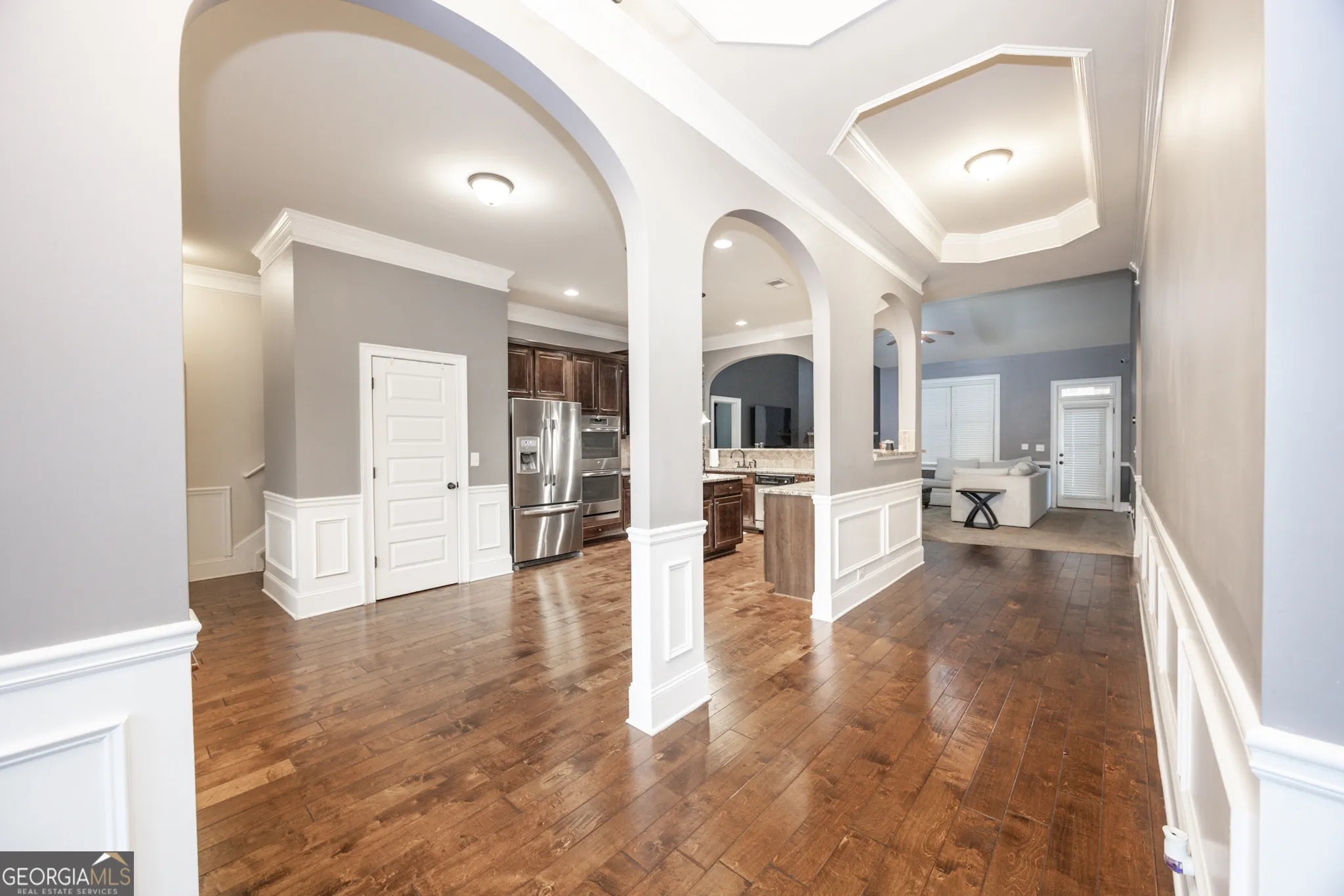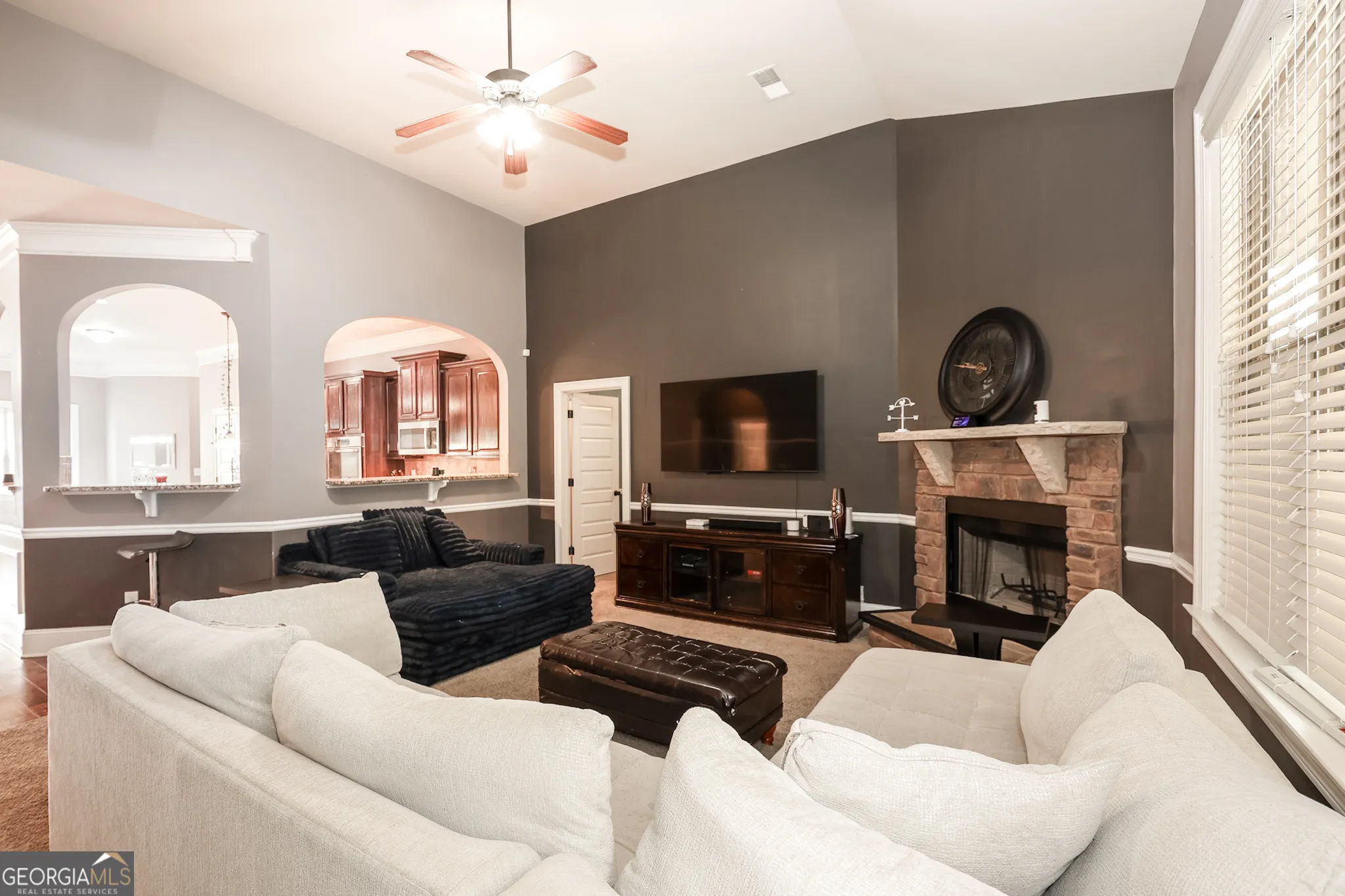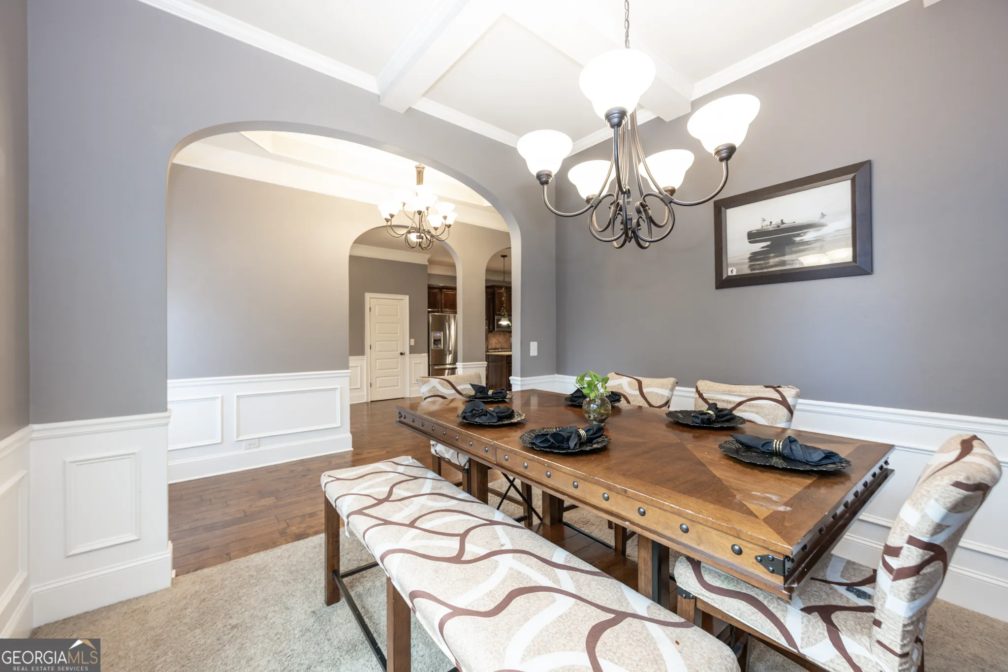 Located in the convenient Legends subdivision and within the highly sought-after Whitewater School District, this beautifully maintained home offers a blend of comfort, style, and convenience-just minutes from the popular South Fayetteville shopping and dining area. There are thoughtful architectural details that make this home stand out, including elegant archways, beautiful trimwork, and a foyer hallway featuring impressive ceiling insets. The formal dining room showcases a stunning coffered ceiling, creating the perfect setting for gatherings. The spacious kitchen is designed for both everyday living and entertaining, featuring hardwood flooring, stainless steel appliances including double ovens, a gas cooktop, microwave, center prep island, pantry, tiled backsplash, and richly stained wood cabinetry. A sunny breakfast area gets the morning sun and the kitchen views open seamlessly to the family room, allowing for easy conversation and connection. The family room comfortably accommodates large-scale furnishings and is anchored by a beautiful stone fireplace, creating a warm and inviting focal point. The main level includes the primary suite, a generous retreat with a crown ceiling and two walk-in closets. The primary bathroom features double vanities with stained wood cabinetry, a relaxing soaking tub, and a separate tiled shower. Two additional sizable secondary bedrooms are also located on the main level and share a full bathroom. Convenience continues with a mudroom entry from the garage and a separate laundry room. Upstairs, a private bedroom with a full bathroom provides the ideal space for guests, a teen suite, or a home office. Outdoor living is just as enjoyable with a screened-in back porch overlooking the fully fenced backyard-perfect for relaxing or entertaining. Solar panels have also been installed to help reduce monthly energy costs. With its spacious layout and prime location close to shopping, dining, and top-rated schools, this home offers exceptional value in one of Fayette County’s most desirable areas.
