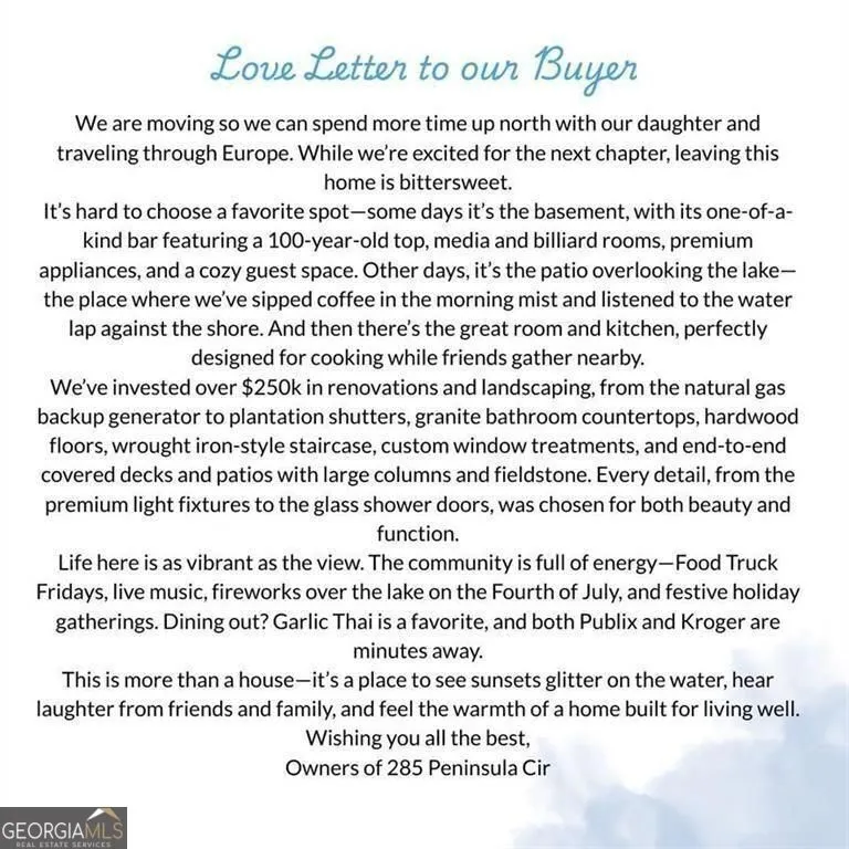 || MILLION-DOLLAR LAKE VIEWS || ALL 4 BEDROOMS, INCLUDING THE MASTER, ARE UPSTAIRS FOR EASY FLOW || || OVER $250K IN HIGH-END UPDATES || || 2024 GAF ROOF W/ 50-YR WARRANTY || || FULLY RENOVATED BASEMENT || || WHOLE-HOME NATURAL GAS GENERATOR || || 2025 LIFETIME POLYASPARTIC GARAGE FLOOR || || LAKESIDE DECK & PATIO || || 3-CAR GARAGE || || SMART HVAC SYSTEMS ON ALL LEVELS || || TOP-RATED PUBLIC SCHOOLS || || 30 MIN TO ATLANTA INT’L AIRPORT || ** What You’ll See ** From the moment you enter, your eyes are drawn to PANORAMIC LAKE VIEWS FROM EVERY ROOM. The home feels like a PRIVATE RETREAT, with PLANTATION SHUTTERS, PREMIUM FIXTURES, and WOOD-LOOK TILE AND HARDWOODS THROUGHOUT. The COVERED DECK and STONE PATIO with OVERSIZED COLUMNS frame the water’s edge, while the ENGINEERED NO-MAINTENANCE DOCK completes the view. ** What You’ll Hear ** You’ll hear serenity-gentle waves, birdsong, and the quiet hum of the WATERPROOF DECK FANS as you relax outdoors. Inside, the MEDIA ROOM and BILLIARD ROOM come alive with sound, perfect for entertaining or unwinding. Even during storms, the WHOLE-HOUSE GENERATOR keeps everything peaceful and uninterrupted. ** What You’ll Feel ** This home feels thoughtful and luxurious-every inch reflects QUALITY CRAFTSMANSHIP, from the 100-YEAR-OLD BAR TOP to the PREMIUM APPLIANCES and CUSTOM TILE WORK. Whether enjoying the climate-controlled comfort of the SMART HVAC SYSTEMS or sipping a drink on the SHADED DECK, the atmosphere is effortless and relaxing. ** What You’ll Experience ** You’ll experience life at its best-SUNSETS OVER THE LAKE, weekend gatherings at the ONE-OF-A-KIND BAR, movie nights in the MEDIA ROOM, and quiet mornings on the DOCK OR PORCH. With TOP SCHOOLS, quick access to the AIRPORT, and UNMATCHED DESIGN AND DETAIL, this is more than a home-it’s a destination.