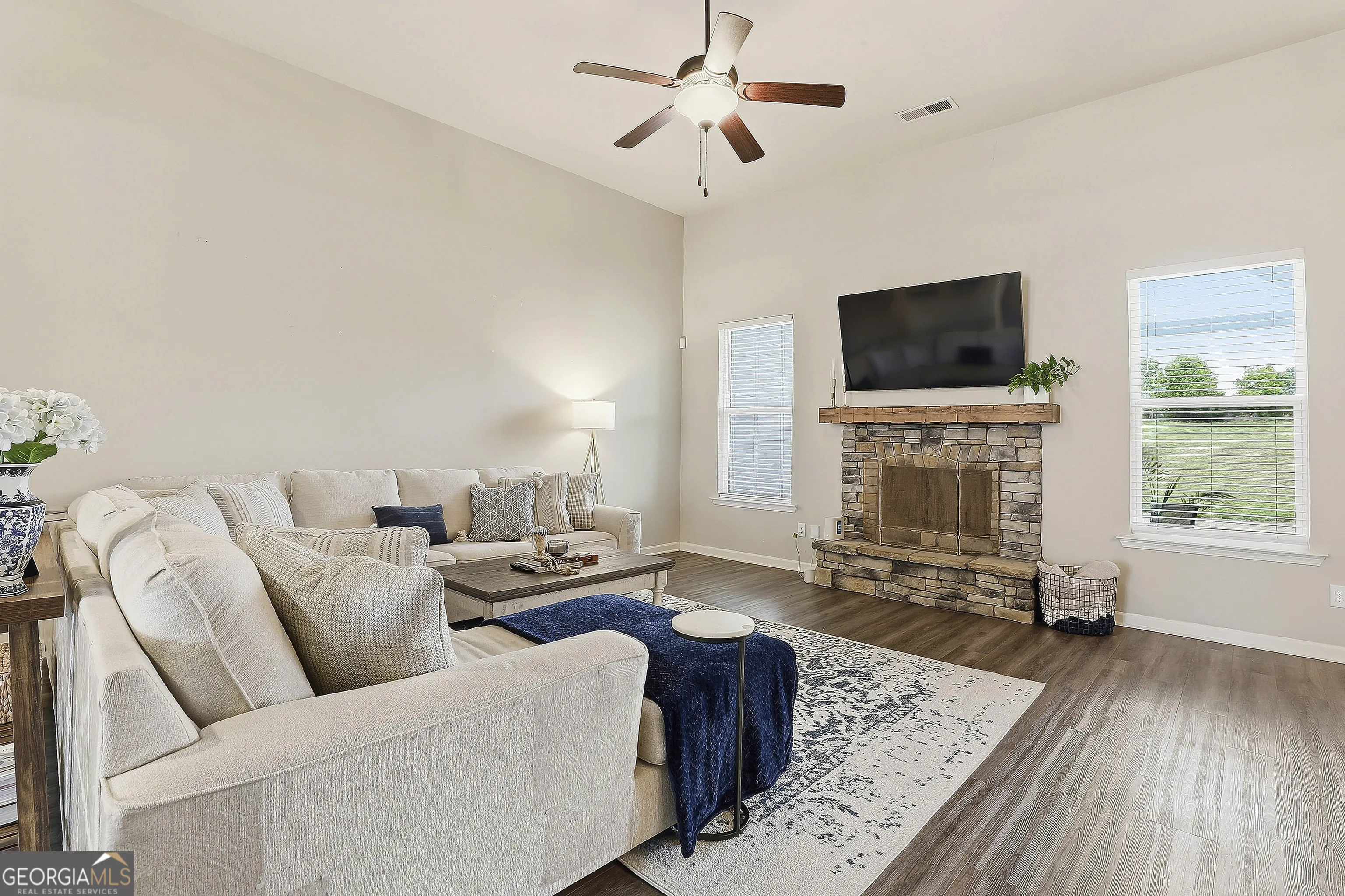Welcome home to this like-new ranch in sought-after Senoia! Perfectly situated on a level acre+ lot, this beautifully designed 4-bedroom, 3 full bath, and 1 half bath home offers the ideal blend of space, comfort, and functionality. Step inside to an open, light-filled split-bedroom floor plan featuring a dedicated office and a formal dining room-perfect for both everyday living and entertaining. The spacious family room with a cozy fireplace flows seamlessly into the kitchen and breakfast area, creating a warm and inviting central gathering space. The kitchen is a chef’s dream, complete with stone countertops, stainless steel appliances, a separate cooktop, wall oven and microwave combo, and a convenient pantry. The private primary suite is tucked away on one side of the home and boasts a luxurious en-suite bath with a soaking tub, double vanity, tiled shower, and a roomy closet. On the opposite side, you’ll find two additional bedrooms and a full bath, offering comfort and privacy for family or guests. Just off the garage entry, you’ll appreciate the functional laundry room and access to the upper level, where a fourth bedroom and full bath provide the perfect space for a guest suite, teen retreat, or bonus living area. Enjoy peaceful outdoor living on the covered back patio with plenty of room to relax, play, or entertain on your expansive lot. This move-in ready home combines modern finishes with a thoughtful layout-don’t miss your opportunity to make it yours!