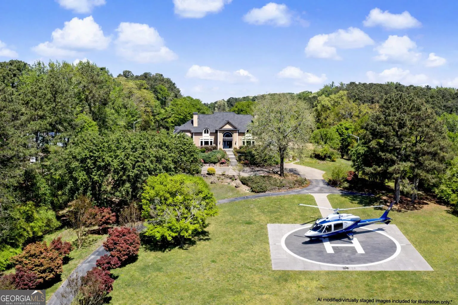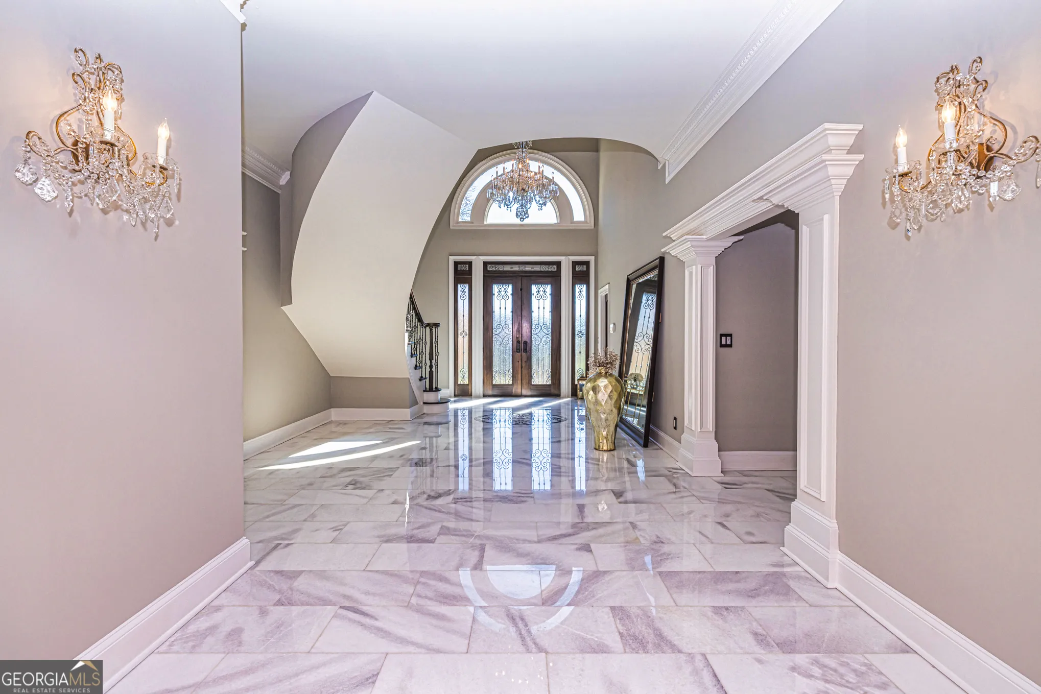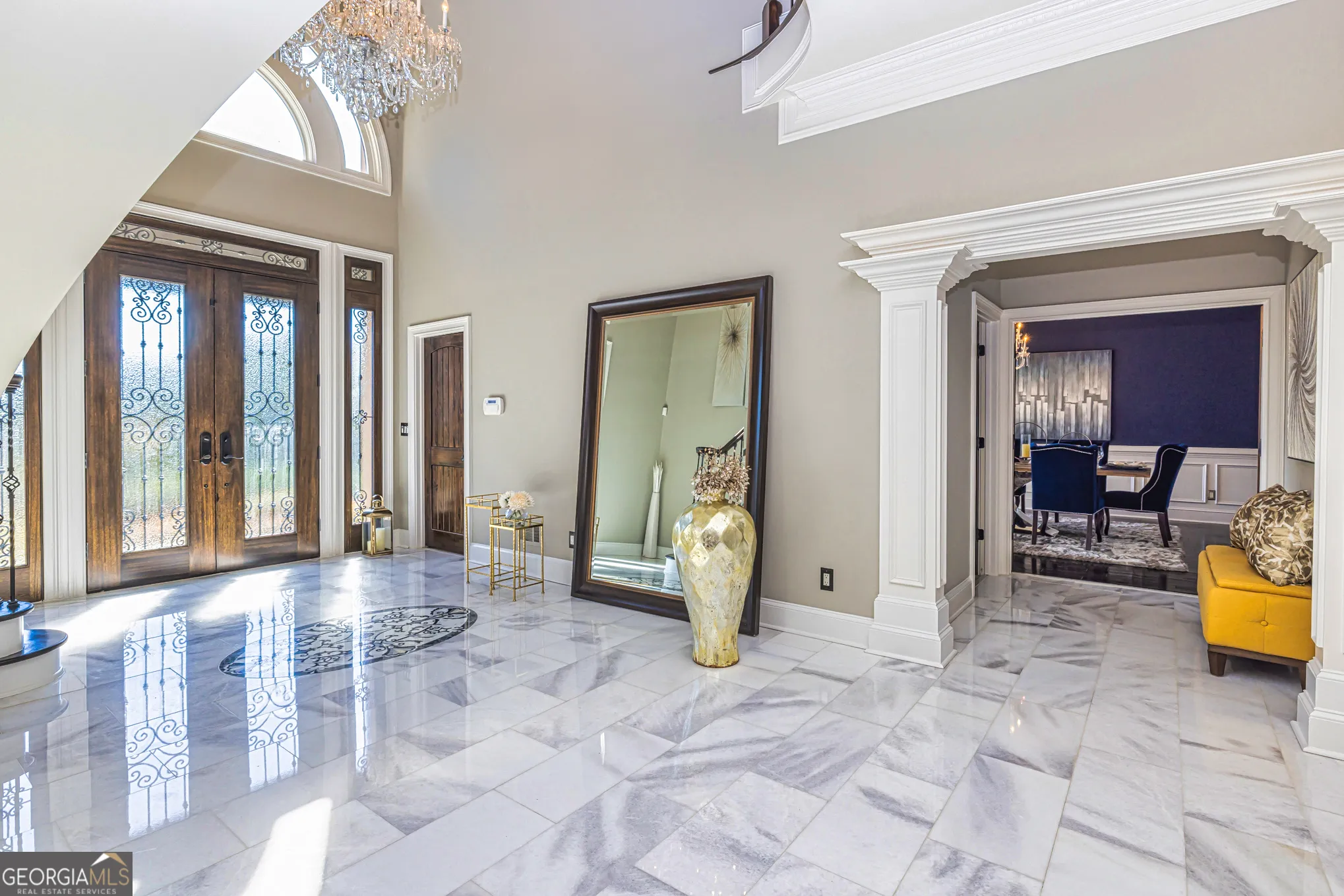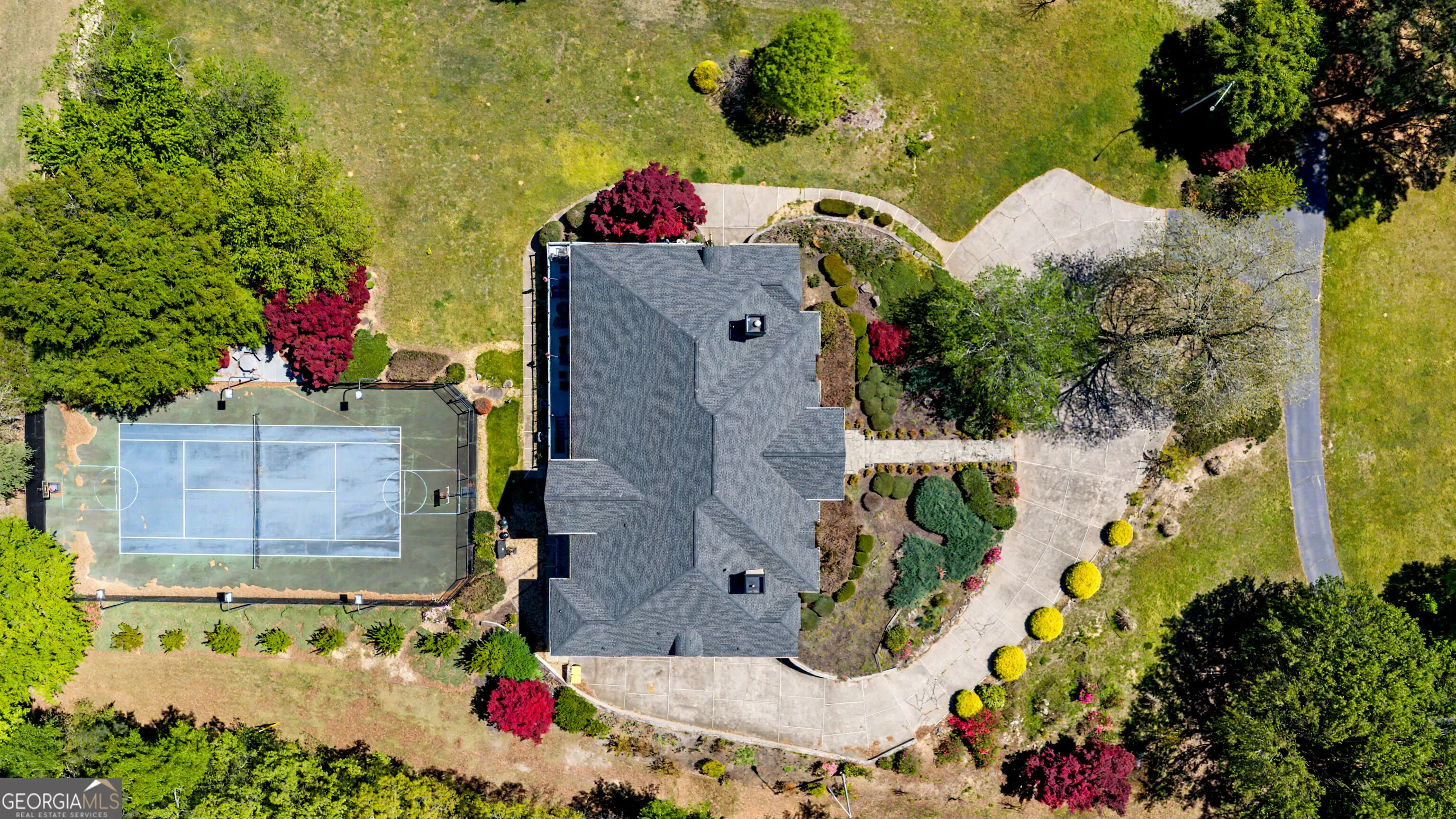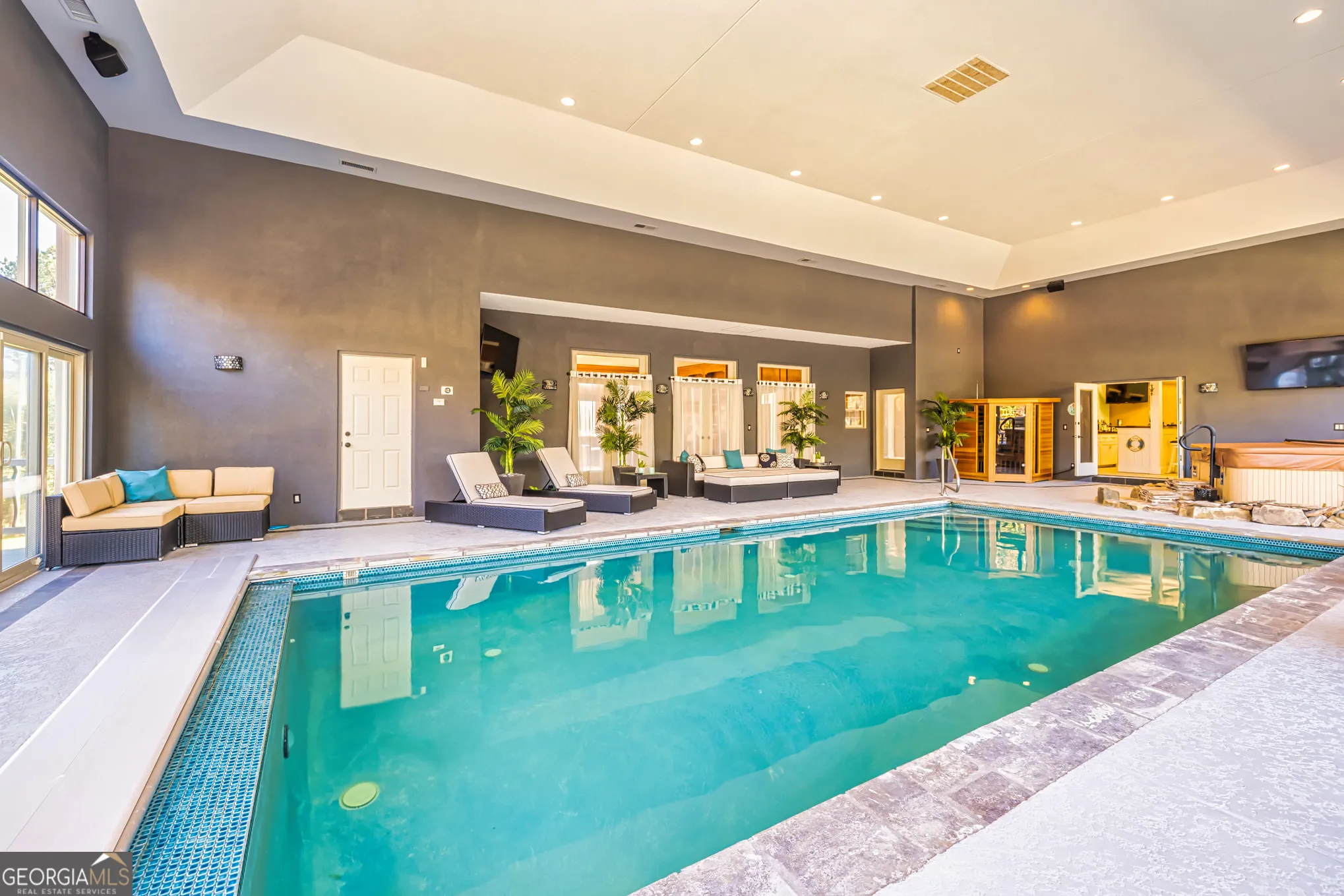This European estate is located on 4.77+/- gated acres in Tyrone, Georgia, and has undergone meticulous renovation by skilled craftsmen to present a residence suitable for both sophisticated entertaining and comfortable day-to-day living. The driveway is bordered by mature trees, with professionally landscaped gardens enhancing the property’s visual appeal. Double solid wood doors introduce a marble foyer featuring a curved staircase and a crystal chandelier. Adjacent to the foyer, the right hallway leads into a wood-paneled living room with a fireplace, custom bookcase, wet bar, and triple French glass doors. A guest bedroom and bathroom are situated conveniently nearby. To the left of the foyer, the hallway provides access to a China room, a formal dining room with a crystal chandelier, and a chef’s kitchen that includes an oversized island, breakfast area, snack bar, walk-in pantry, utility space, and a glass-door elevator. The rear hallway from the kitchen connects to the primary suite, a secondary staircase, the terrace level, and a half bath. The primary suite features a tray ceiling and bay window overlooking the rear grounds. The en-suite bathroom offers a garden tub, a private toilet closet with bidet, a steam shower, and dual custom closets. An adjoining wood-paneled office equipped with custom bookcases is accessible from the suite. A central four-seasons lanai, climate-controlled for year-round use, contains an indoor swimming pool, hot tub, sauna, full bar, wine closet, and a full bath and changing room with a steam shower. Upstairs, there are three separate bedroom suites, each with built-in cabinetry, window seating, and ample closet space. Additional features include elevator access, two sitting areas, and significant storage. The lower level provides extensive recreational amenities, including a tavern-style bar, full bath with shower, home theater, game room with vintage arcade games, and a regulation 10-pin bowling alley. Outside, a full sport court for tennis, pickleball, or basketball sits perfectly surrounded by lush gardens and a koi pond. The property offers privacy while remaining within convenient driving distance of Atlanta International Airport, Peachtree City, Trilith Studios, as well as various entertainment venues, restaurants, and shopping centers.