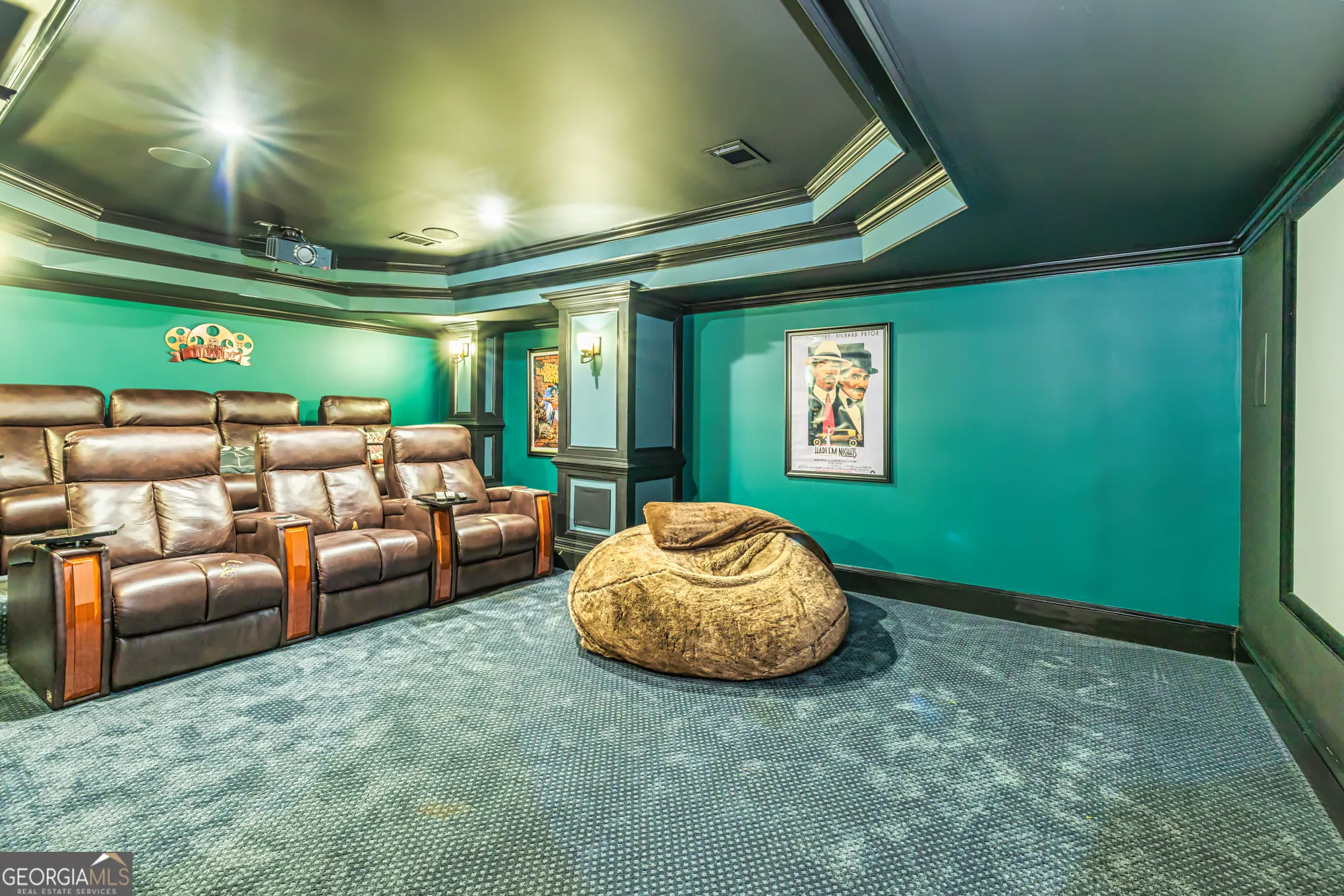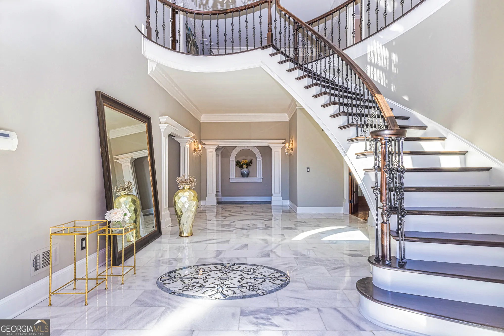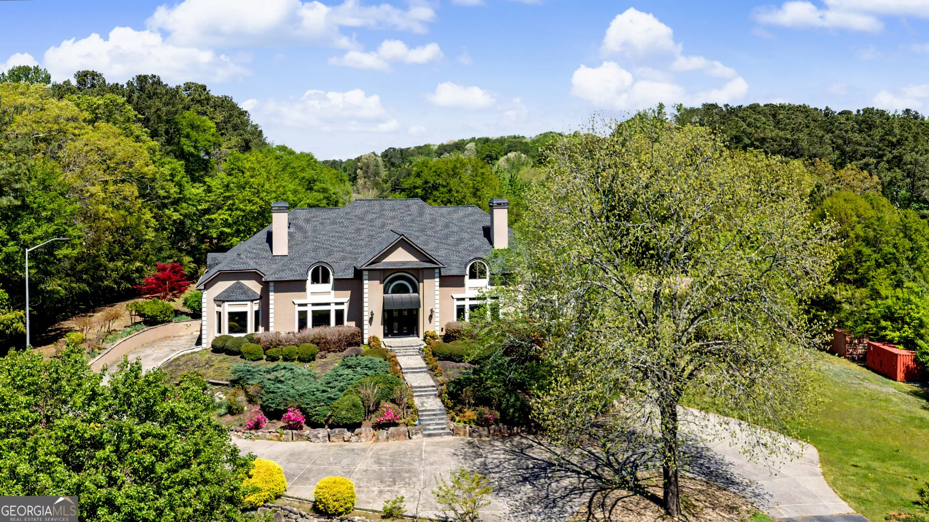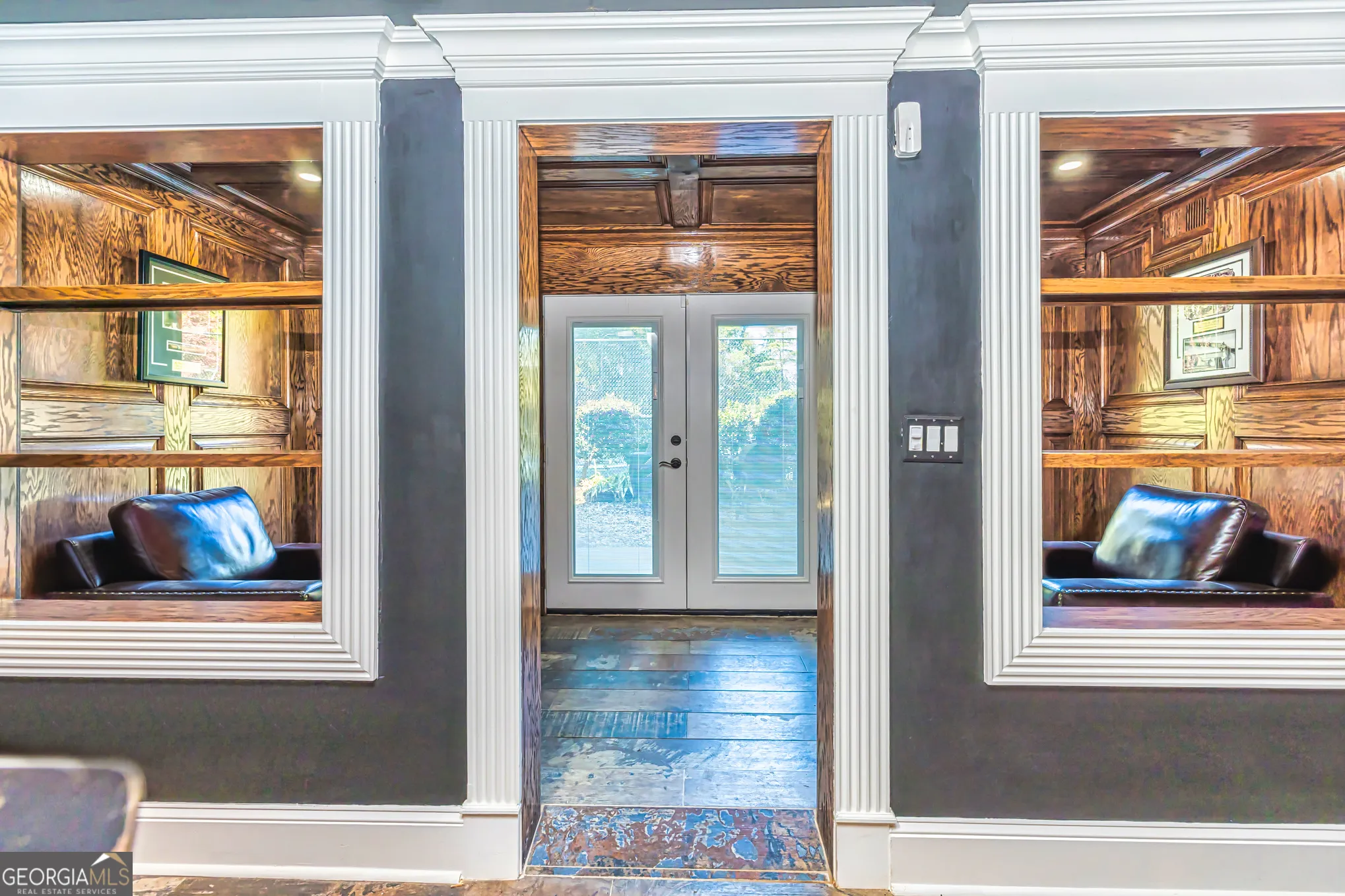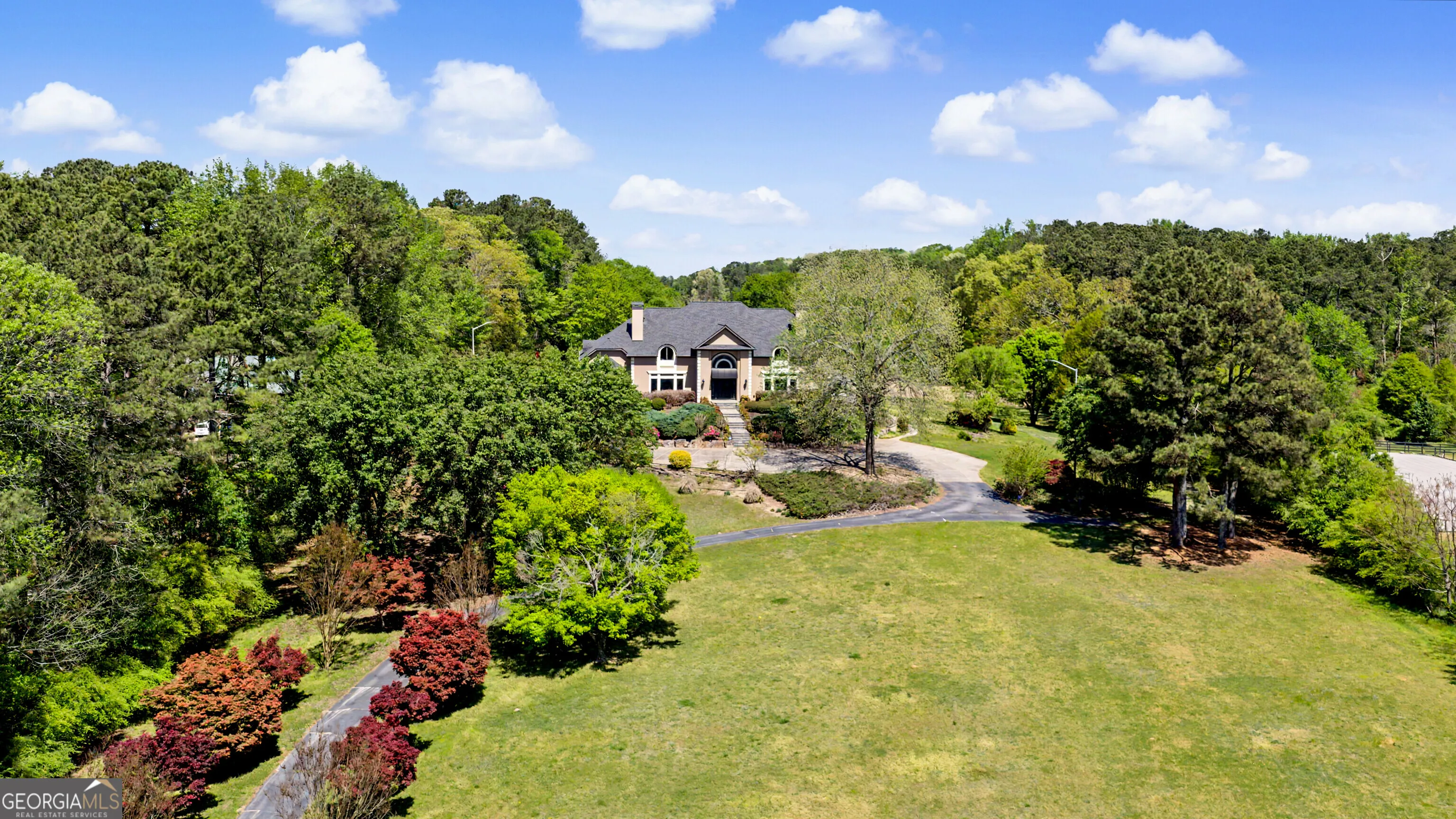 This European estate is located on 4.77+/- gated acres in Tyrone, Georgia, and has undergone meticulous renovation by skilled craftsmen to present a residence suitable for both sophisticated entertaining and comfortable day-to-day living. The driveway is bordered by mature trees, with professionally landscaped gardens enhancing the property’s visual appeal. Double solid wood doors introduce a marble foyer featuring a curved staircase and a crystal chandelier. Adjacent to the foyer, the right hallway leads into a wood-paneled living room with a fireplace, custom bookcase, wet bar, and triple French glass doors. A guest bedroom and bathroom are situated conveniently nearby. To the left of the foyer, the hallway provides access to a China room, a formal dining room with a crystal chandelier, and a chef’s kitchen that includes an oversized island, breakfast area, snack bar, walk-in pantry, utility space, and a glass-door elevator. The rear hallway from the kitchen connects to the primary suite, a secondary staircase, the terrace level, and a half bath. The primary suite features a tray ceiling and bay window overlooking the rear grounds. The en-suite bathroom offers a garden tub, a private toilet closet with bidet, a steam shower, and dual custom closets. An adjoining wood-paneled office equipped with custom bookcases is accessible from the suite. A central four-seasons lanai, climate-controlled for year-round use, contains an indoor swimming pool, hot tub, sauna, full bar, wine closet, and a full bath and changing room with a steam shower. Upstairs, there are three separate bedroom suites, each with built-in cabinetry, window seating, and ample closet space. Additional features include elevator access, two sitting areas, and significant storage. The lower level provides extensive recreational amenities, including a tavern-style bar, full bath with shower, home theater, game room with vintage arcade games, and a regulation 10-pin bowling alley. Outside, a full sport court for tennis, pickleball, or basketball sits perfectly surrounded by lush gardens and a koi pond. The property offers privacy while remaining within convenient driving distance of Atlanta International Airport, Peachtree City, Trilith Studios, as well as various entertainment venues, restaurants, and shopping centers.