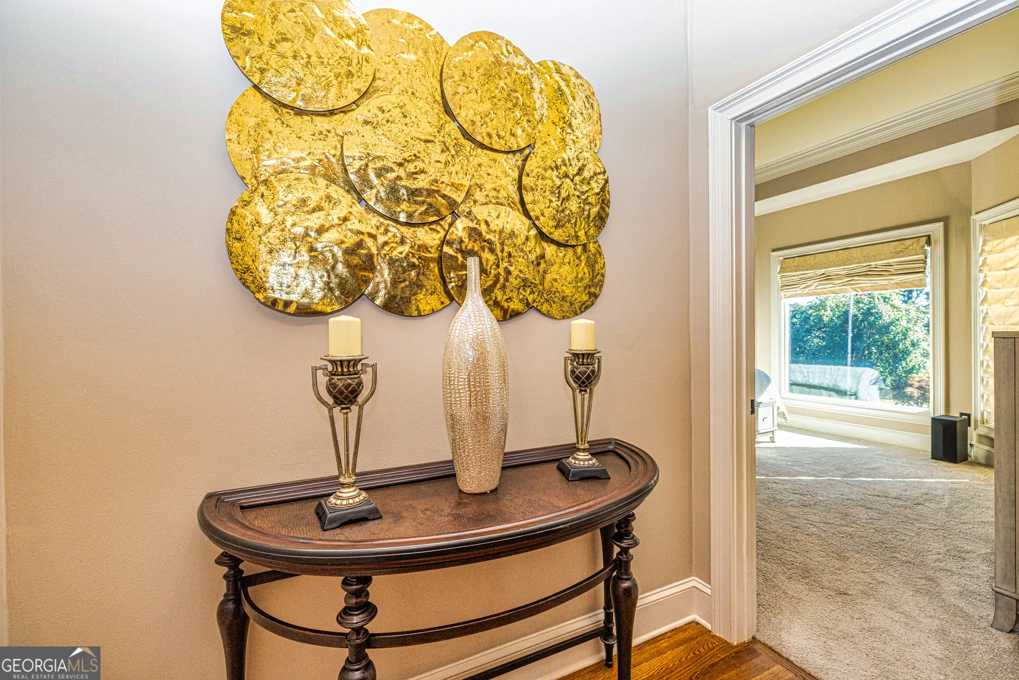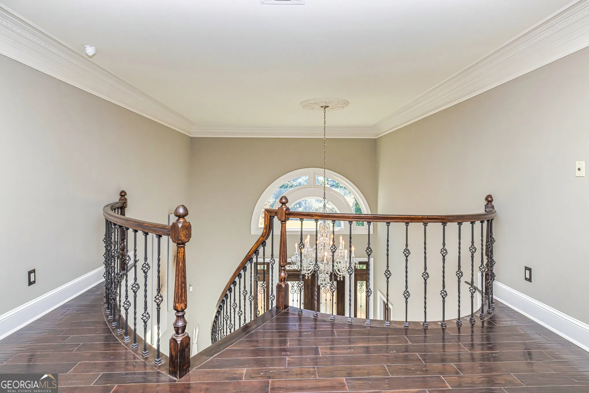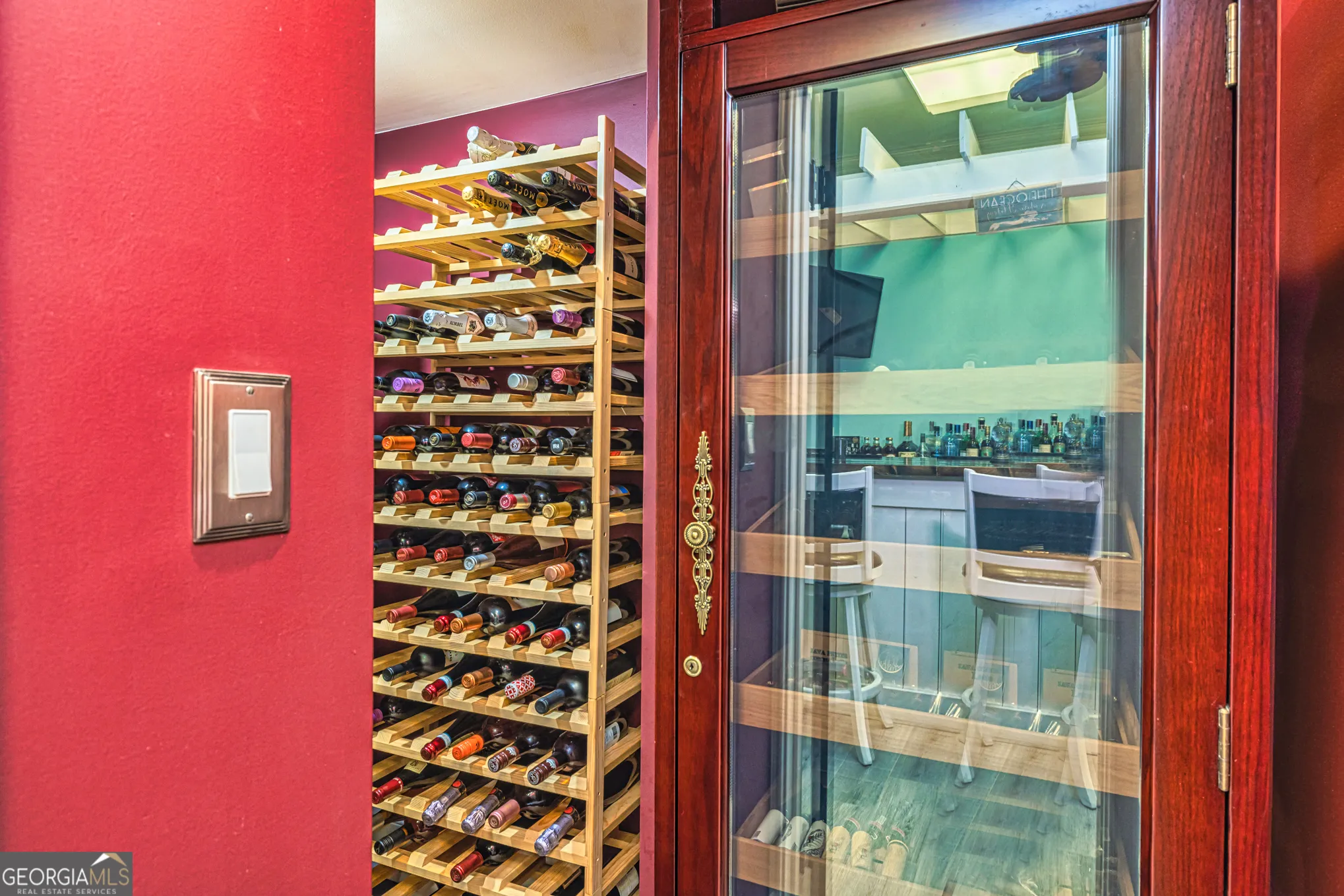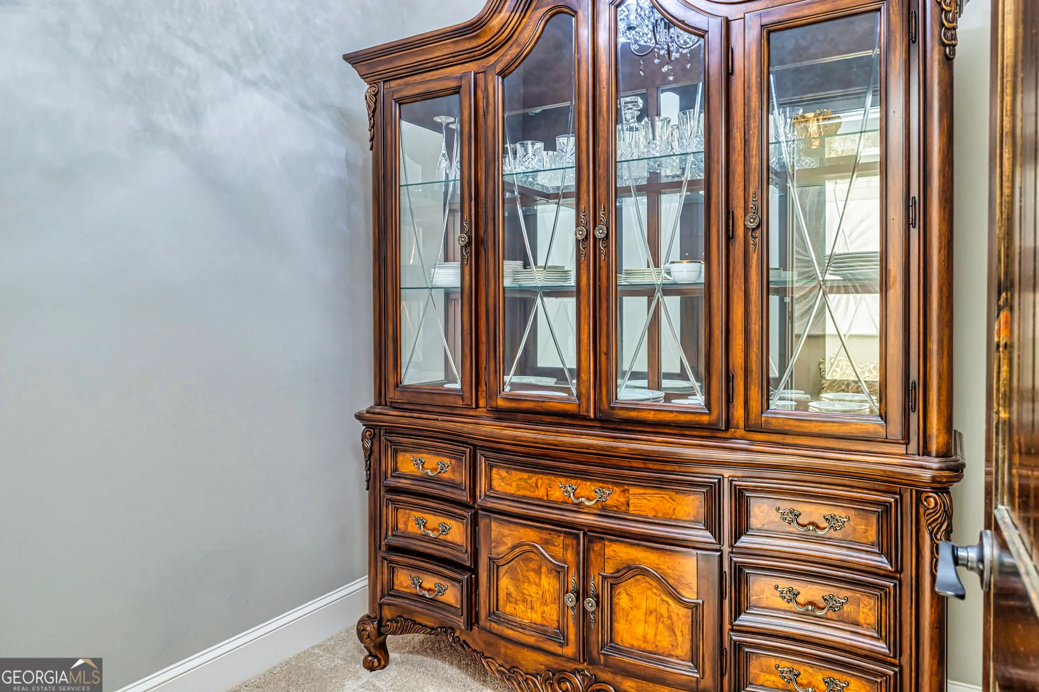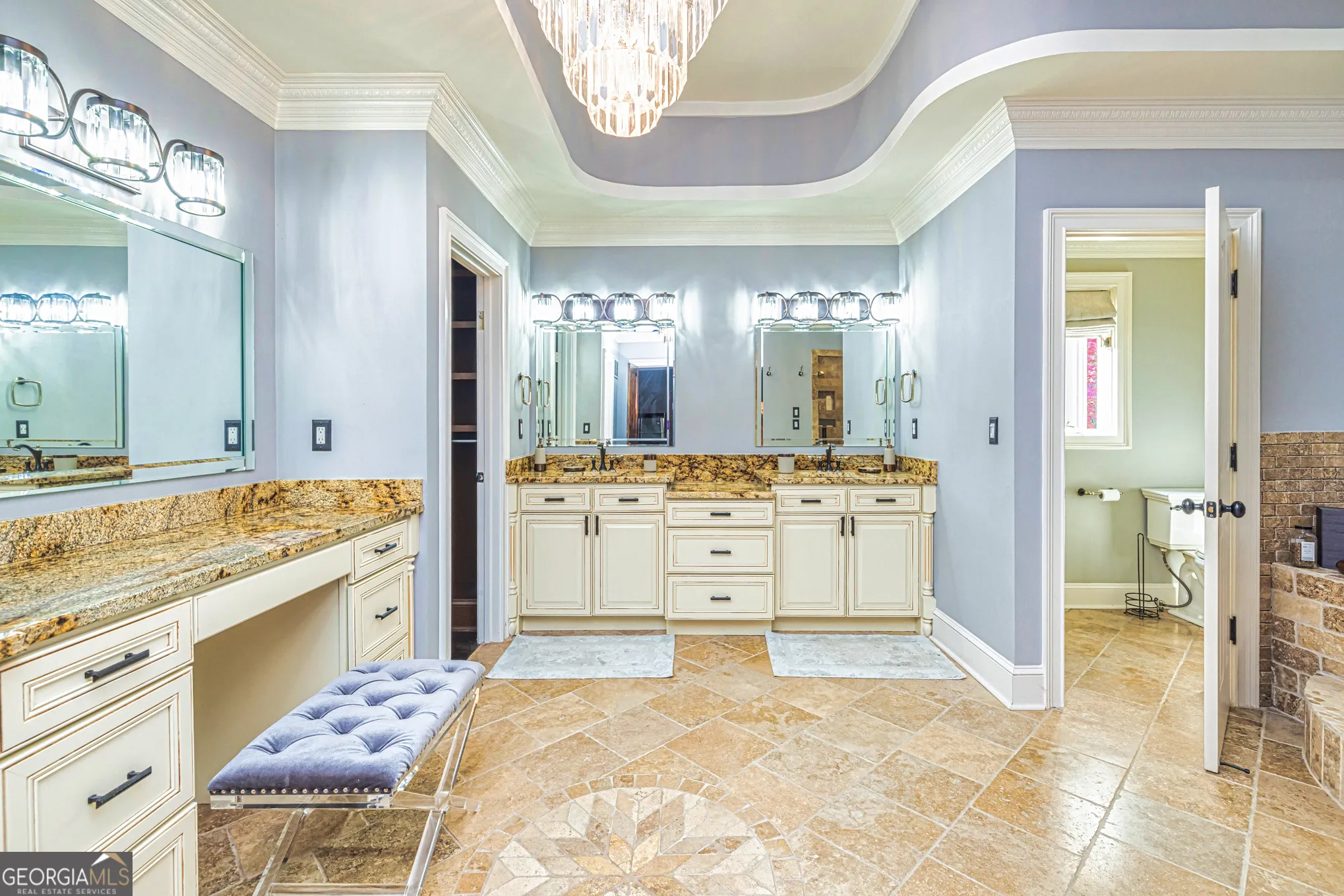This European estate is located on 4.77+/- gated acres in Tyrone, Georgia, and has undergone meticulous renovation by skilled craftsmen to present a residence suitable for both sophisticated entertaining and comfortable day-to-day living. The driveway is bordered by mature trees, with professionally landscaped gardens enhancing the property’s visual appeal. Double solid wood doors introduce a marble foyer featuring a curved staircase and a crystal chandelier. Adjacent to the foyer, the right hallway leads into a wood-paneled living room with a fireplace, custom bookcase, wet bar, and triple French glass doors. A guest bedroom and bathroom are situated conveniently nearby. To the left of the foyer, the hallway provides access to a China room, a formal dining room with a crystal chandelier, and a chef’s kitchen that includes an oversized island, breakfast area, snack bar, walk-in pantry, utility space, and a glass-door elevator. The rear hallway from the kitchen connects to the primary suite, a secondary staircase, the terrace level, and a half bath. The primary suite features a tray ceiling and bay window overlooking the rear grounds. The en-suite bathroom offers a garden tub, a private toilet closet with bidet, a steam shower, and dual custom closets. An adjoining wood-paneled office equipped with custom bookcases is accessible from the suite. A central four-seasons lanai, climate-controlled for year-round use, contains an indoor swimming pool, hot tub, sauna, full bar, wine closet, and a full bath and changing room with a steam shower. Upstairs, there are three separate bedroom suites, each with built-in cabinetry, window seating, and ample closet space. Additional features include elevator access, two sitting areas, and significant storage. The lower level provides extensive recreational amenities, including a tavern-style bar, full bath with shower, home theater, game room with vintage arcade games, and a regulation 10-pin bowling alley. Outside, a full sport court for tennis, pickleball, or basketball sits perfectly surrounded by lush gardens and a koi pond. The property offers privacy while remaining within convenient driving distance of Atlanta International Airport, Peachtree City, Trilith Studios, as well as various entertainment venues, restaurants, and shopping centers.