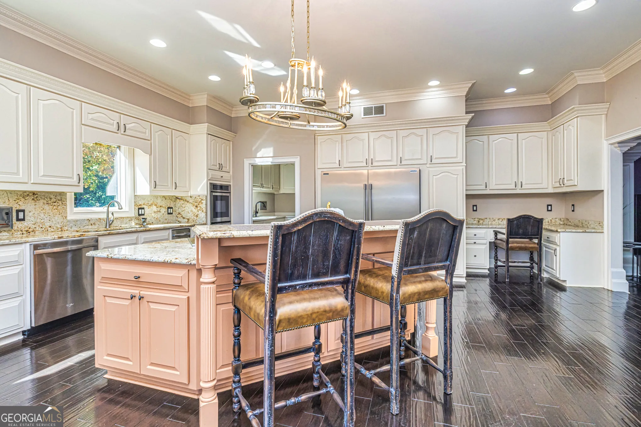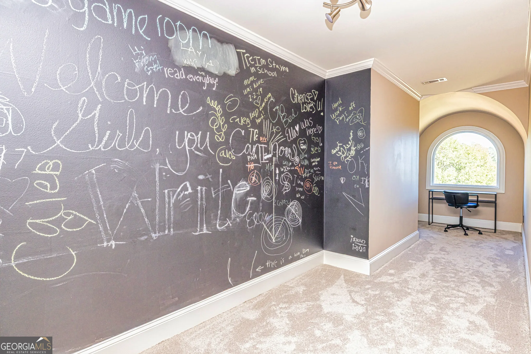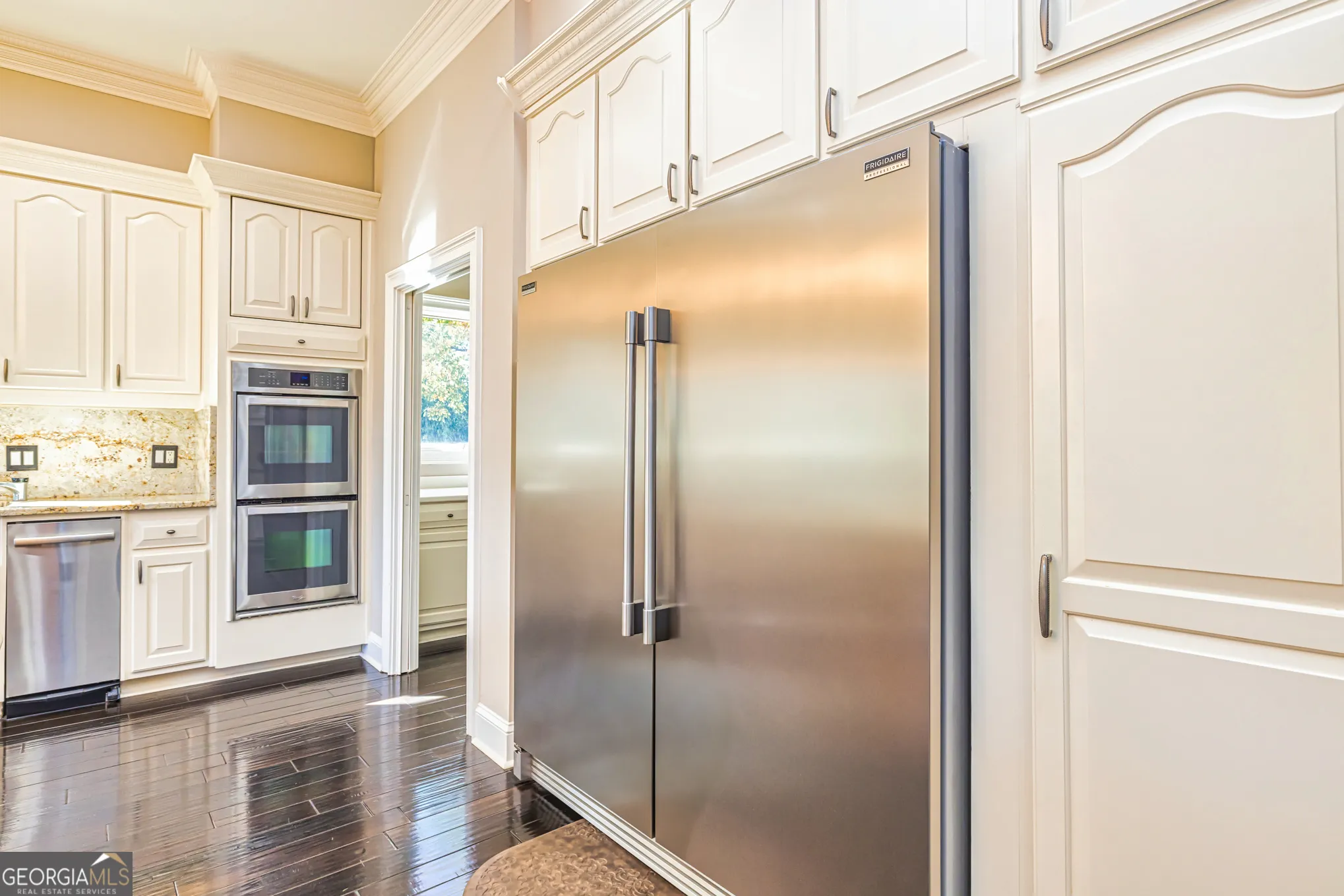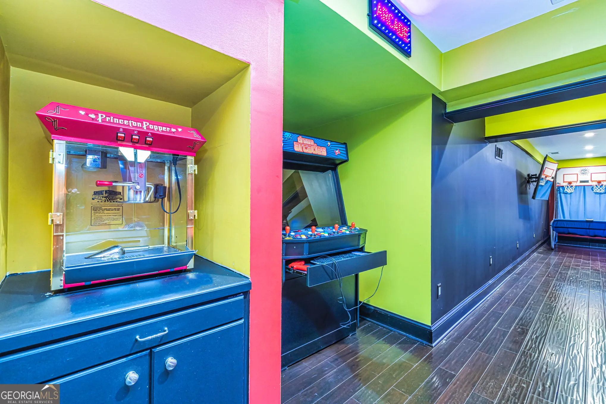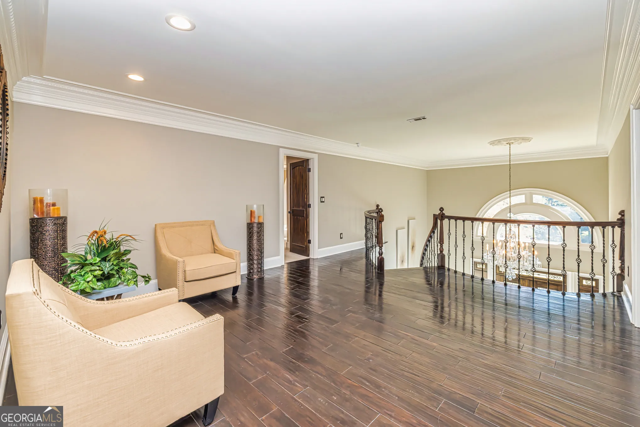 This European estate is located on 4.77+/- gated acres in Tyrone, Georgia, and has undergone meticulous renovation by skilled craftsmen to present a residence suitable for both sophisticated entertaining and comfortable day-to-day living. The driveway is bordered by mature trees, with professionally landscaped gardens enhancing the property’s visual appeal. Double solid wood doors introduce a marble foyer featuring a curved staircase and a crystal chandelier. Adjacent to the foyer, the right hallway leads into a wood-paneled living room with a fireplace, custom bookcase, wet bar, and triple French glass doors. A guest bedroom and bathroom are situated conveniently nearby. To the left of the foyer, the hallway provides access to a China room, a formal dining room with a crystal chandelier, and a chef’s kitchen that includes an oversized island, breakfast area, snack bar, walk-in pantry, utility space, and a glass-door elevator. The rear hallway from the kitchen connects to the primary suite, a secondary staircase, the terrace level, and a half bath. The primary suite features a tray ceiling and bay window overlooking the rear grounds. The en-suite bathroom offers a garden tub, a private toilet closet with bidet, a steam shower, and dual custom closets. An adjoining wood-paneled office equipped with custom bookcases is accessible from the suite. A central four-seasons lanai, climate-controlled for year-round use, contains an indoor swimming pool, hot tub, sauna, full bar, wine closet, and a full bath and changing room with a steam shower. Upstairs, there are three separate bedroom suites, each with built-in cabinetry, window seating, and ample closet space. Additional features include elevator access, two sitting areas, and significant storage. The lower level provides extensive recreational amenities, including a tavern-style bar, full bath with shower, home theater, game room with vintage arcade games, and a regulation 10-pin bowling alley. Outside, a full sport court for tennis, pickleball, or basketball sits perfectly surrounded by lush gardens and a koi pond. The property offers privacy while remaining within convenient driving distance of Atlanta International Airport, Peachtree City, Trilith Studios, as well as various entertainment venues, restaurants, and shopping centers.