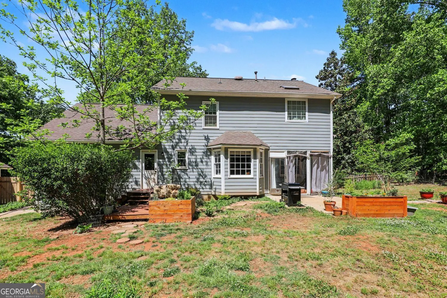 This charming traditional-style 4 bed/4 bath home at 215 Hampton Woods Drive offers a perfect blend of classic character and modern comfort in a quiet, family-friendly Fayetteville neighborhood. Situated on a lush, private lot, this property is a true sanctuary just minutes from the vibrant dining and shopping of downtown Fayetteville. A Gardener’s Delight The highlight of this property is the stunning outdoor space, meticulously designed for those with a green thumb. The expansive, wooded backyard is a private oasis featuring: Established Vegetable Garden: Multiple sturdy, raised garden beds ready for your seasonal harvests. Lush Floral Landscape: A variety of vibrant flowers and ornamental plants that provide color and fragrance throughout the year. Wooded Privacy: Mature trees frame the property, offering a serene backdrop for your gardening projects or morning coffee. Exterior & Curb Appeal The home’s striking blue-gray siding and crisp white trim create an inviting first impression, enhanced by professional landscaping. Additional exterior features include: Private Detached Garage: A spacious two-car garage offering excellent storage, a hobby space, or workshop potential. Outdoor Living: A sun-drenched deck and patio area perfectly positioned to enjoy the view of your flourishing garden. Interior Highlights Inside, the home features a thoughtful layout designed for relaxation: Spacious Primary Suite: A peaceful retreat with large windows that invite the beauty of the gardens indoors. Spa-Like Primary Bath: Includes a deep soaking tub under a bright window, a separate glass-enclosed shower, and a generous double vanity with granite countertops and a dedicated makeup station. Location & Lifestyle Located in a quiet, established community, this home is perfect for those seeking a peaceful lifestyle with easy access to local parks, top-rated schools, and the historic charm of the Fayetteville square.