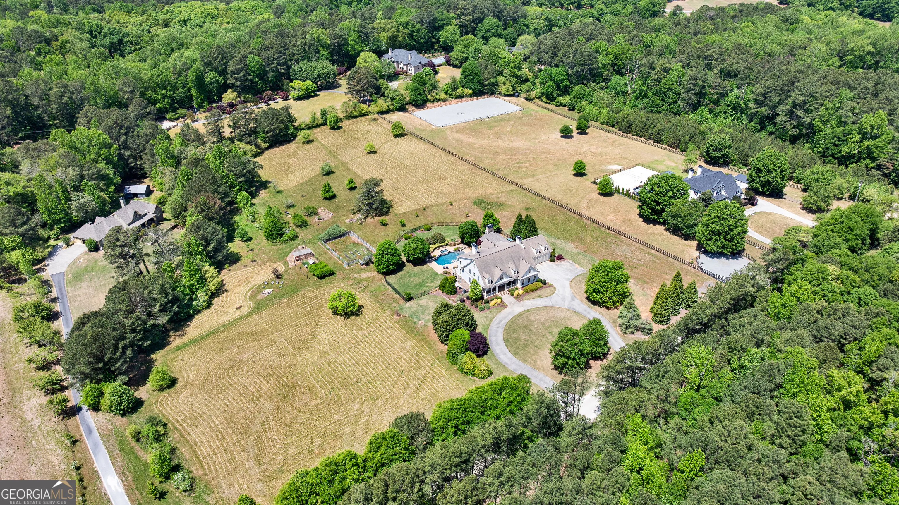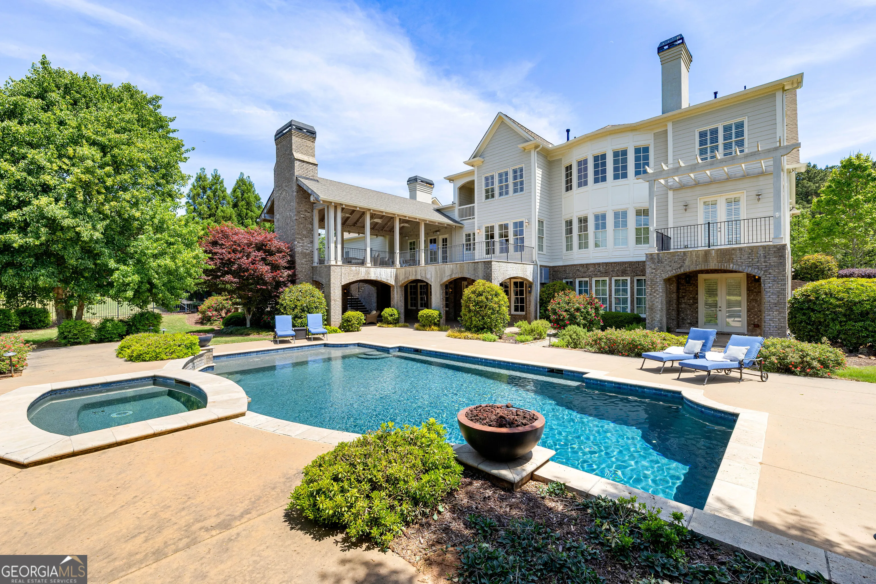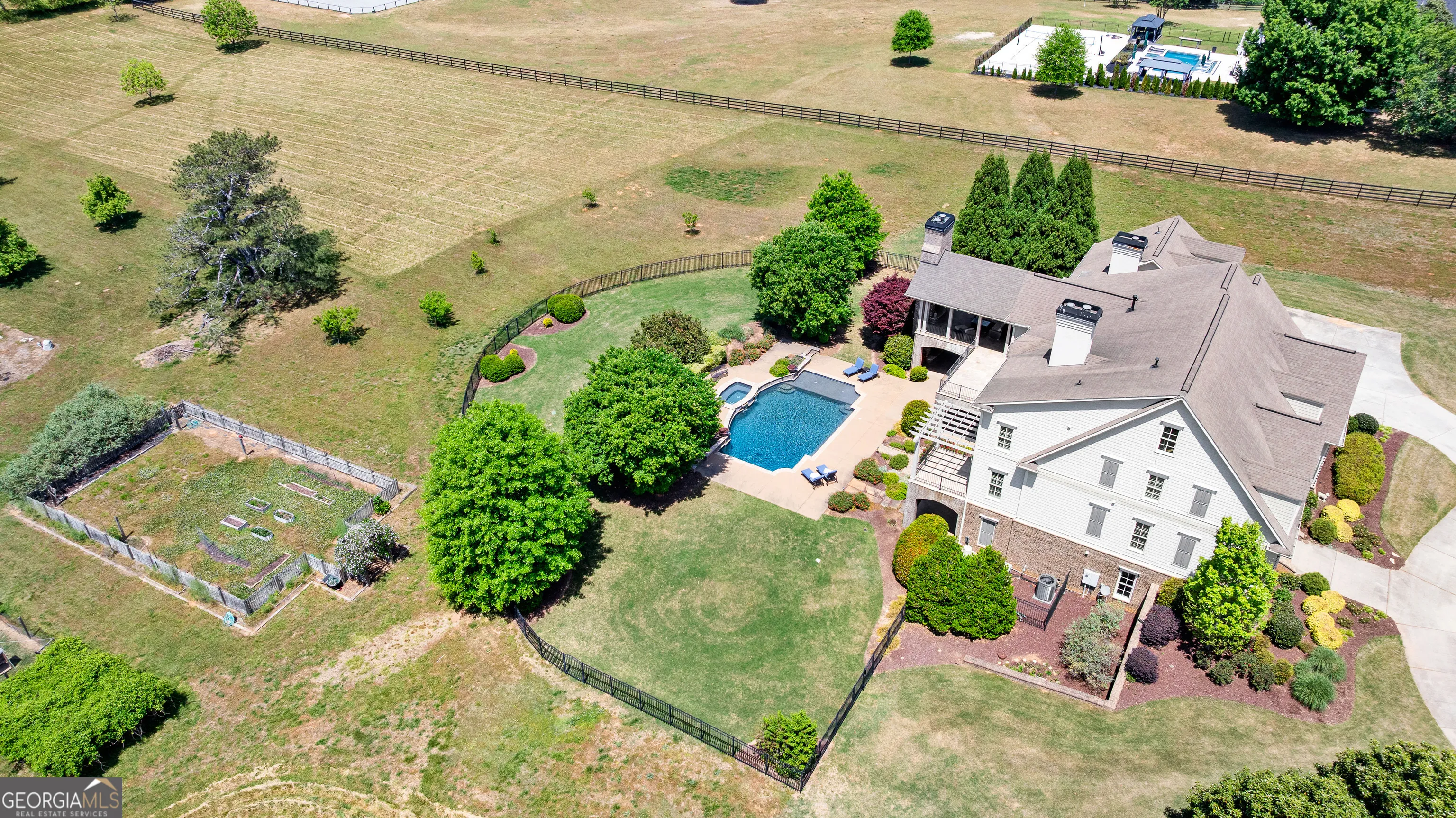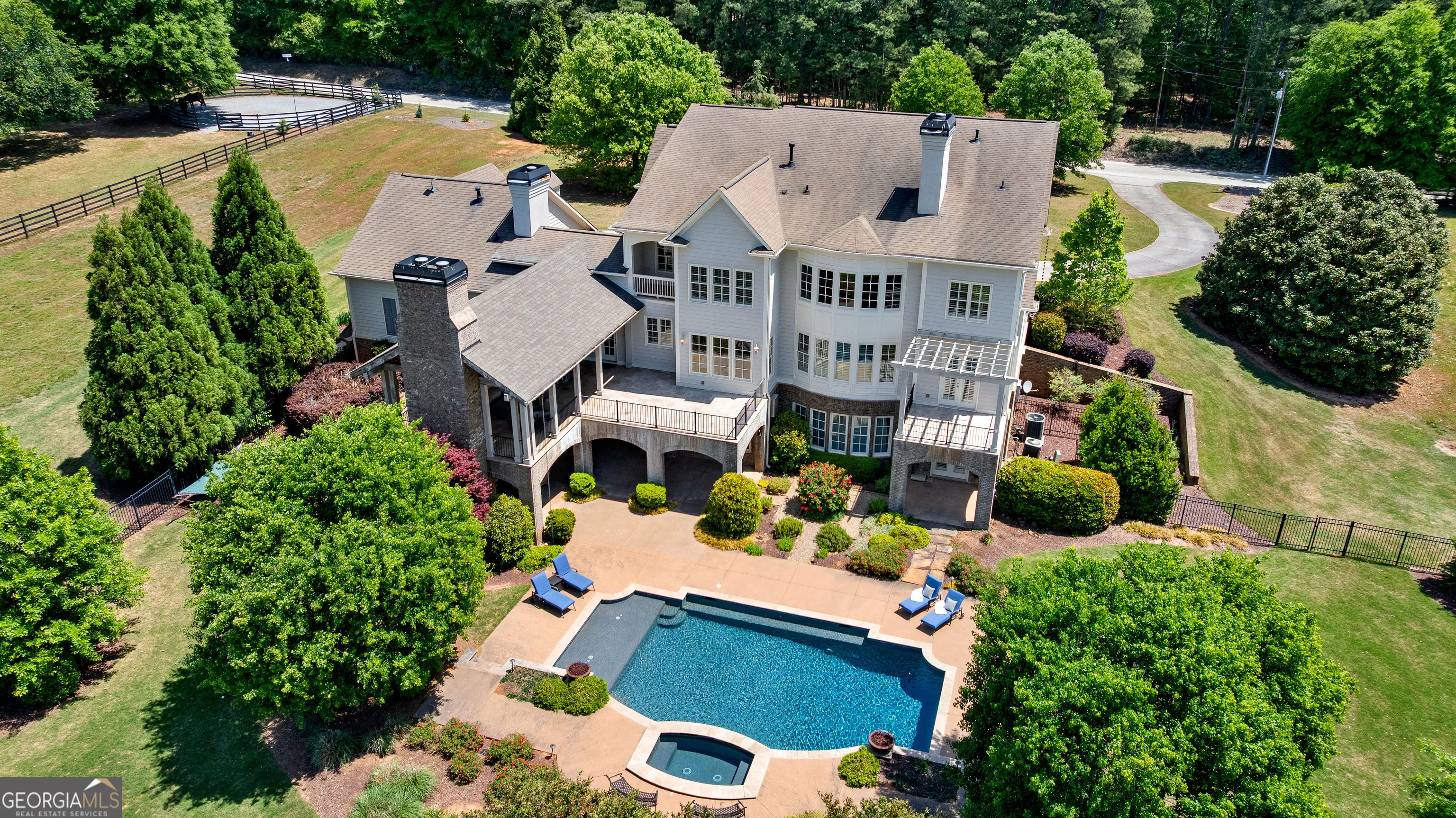 Set on five acres, this amazing custom estate is designed for elevated everyday living and unforgettable entertaining! This property checks every box with a gunite pebbletech pool & spa, three floors of living space includes: 7 bedrooms, 5 full baths, 2 half baths, 6 fireplaces, 3 laundry rooms, library, keeping room, theater room, billiard room, full bar and lounge! The perfect blend of luxury and function both inside and out. The main level features a two-story double door front entry to the grand staircase, hardwood floors, coffered ceilings, and a beautiful, well-appointed kitchen anchored by an oversized granite island with seating and built-in wine rack. Multiple gathering spaces including a keeping room offers functionality and sophistication with custom bookcases and a stone fireplace, and the main living room boasts floor-to-soaring ceiling windows with its own fireplace. The main level is complete with a library or dedicated office space, formal dining room with butler’s pantry, and tiled mudroom with open shelving pantry, standalone deep freezer and standalone refrigerator, custom drop zone, and direct access to all 4 car garages. The bedroom on main offers flexibility with a full bath, custom closet, and a private balcony. Beautiful hardwood flooring continues upstairs to the primary suite – a true retreat with a spacious sitting area, fireplace, private balcony overlooking the pool, whirlpool bath, separate tiled shower, dual vanities, and custom his & her closets with granite dresser and peninsula. Three generously sized secondary bedrooms, laundry room with storage, private loft area, and a rear staircase enhance comfort and flow to complete the upstairs. The finished terrace level is designed to impress, featuring a full theater room, lounge, billiards area, half bath, and a phenomenal custom granite bar complete with sink, dishwasher, dual mini refrigerators, ice machine, and a three-tap kegerator. Two terrace level bedrooms with a full bath, have direct pool access via french doors. Enjoy your private luxury resort with a backyard thoughtfully designed for year-round enjoyment featuring a two-story 20′ porch with a wood-burning fireplace patio and a separate covered and beamed deck with gas fireplace offering deep shade and no shortage of space to entertain. Layered outdoor experiences from the massive gunite pool with tanning ledge, hot tub, and waterfall features to the kitchen herb garden, charming brick archways and sitting areas, meticulous landscaping, and serene pastoral views from every angle. A generous 4 car garage with a oversized storage area provides an accommodating space for everyone’s vehicle and tools. This expansive 5 acre lot has no HOA and is a rare offering of privacy, scale, and lifestyle that stands alone!