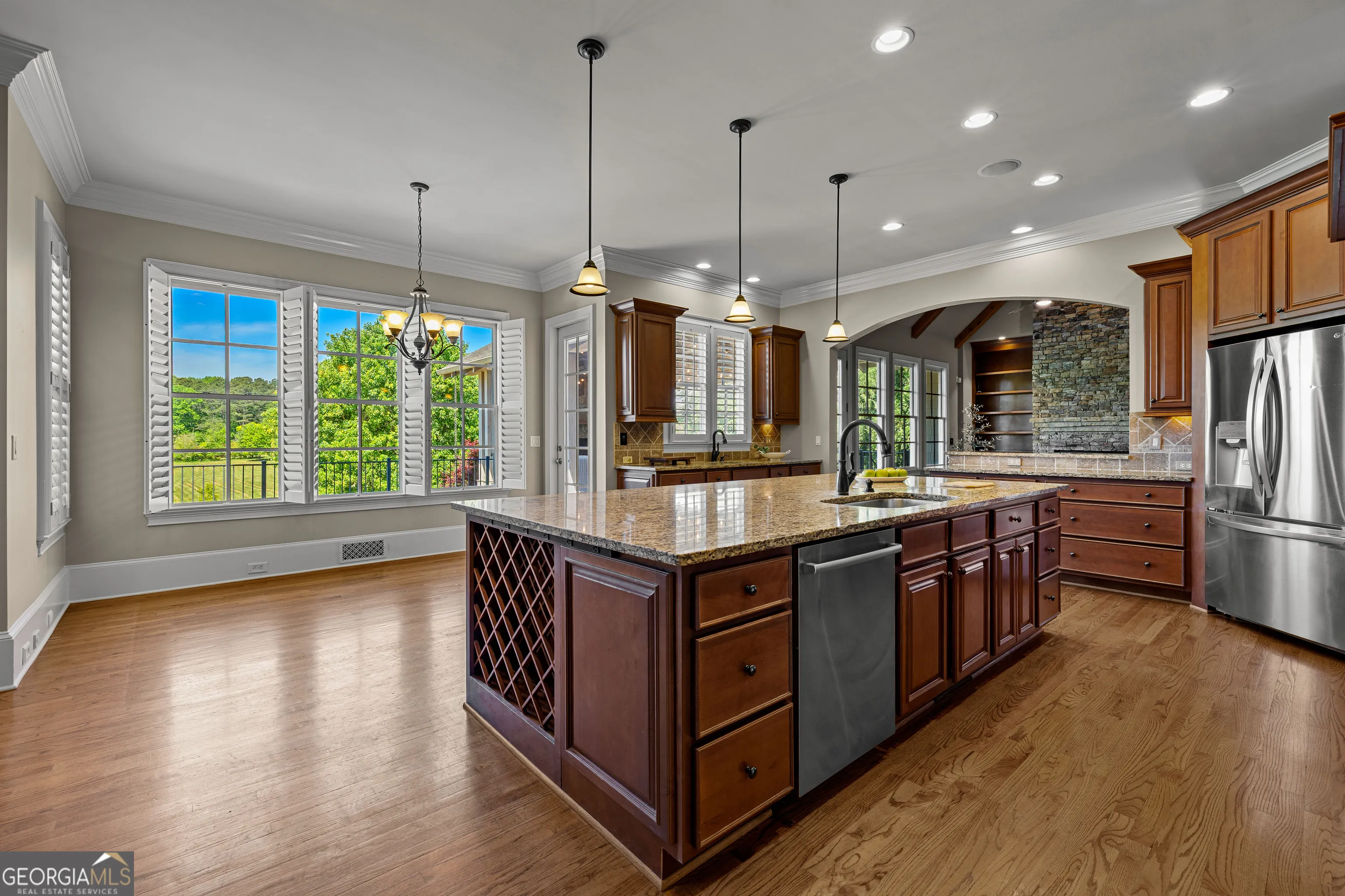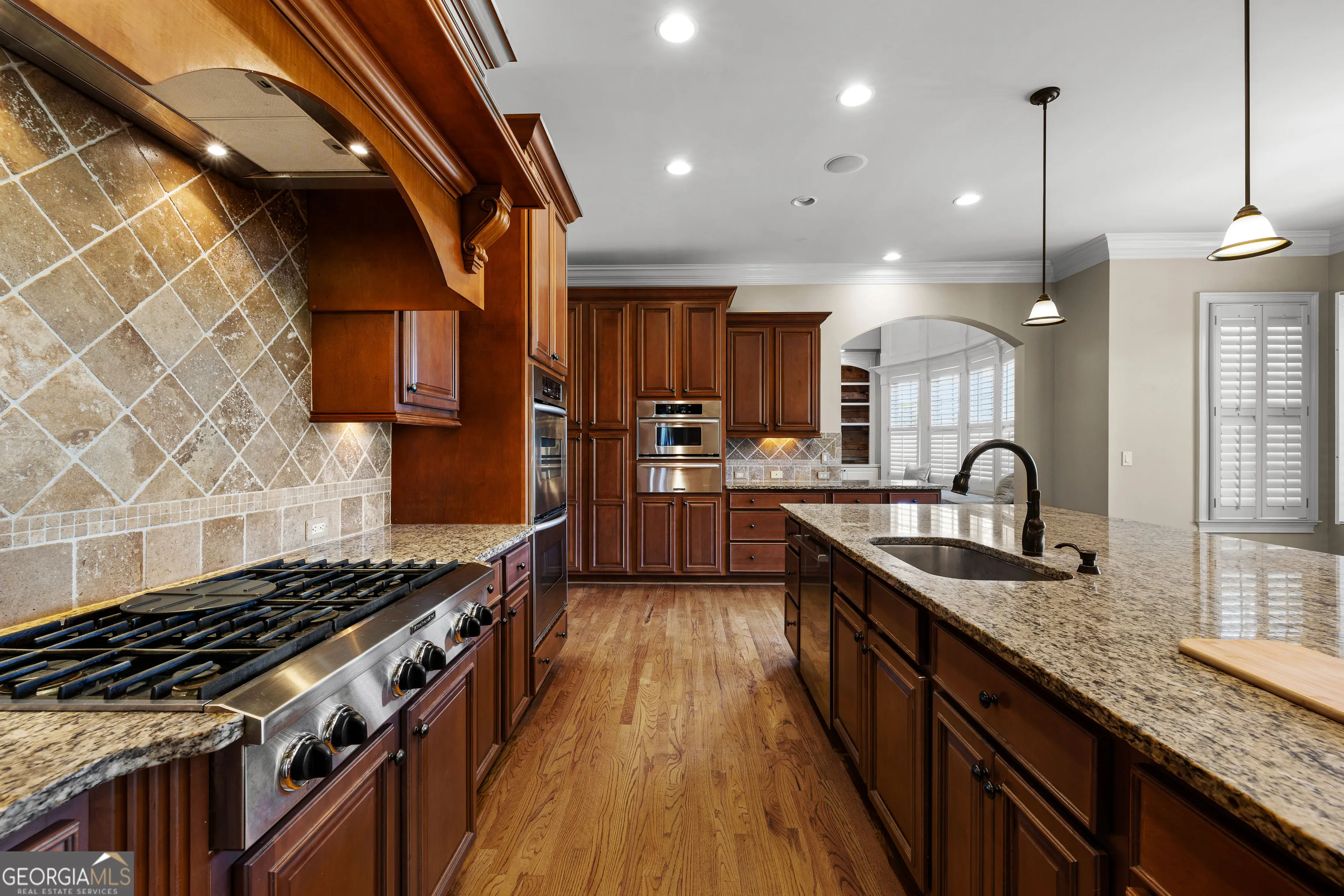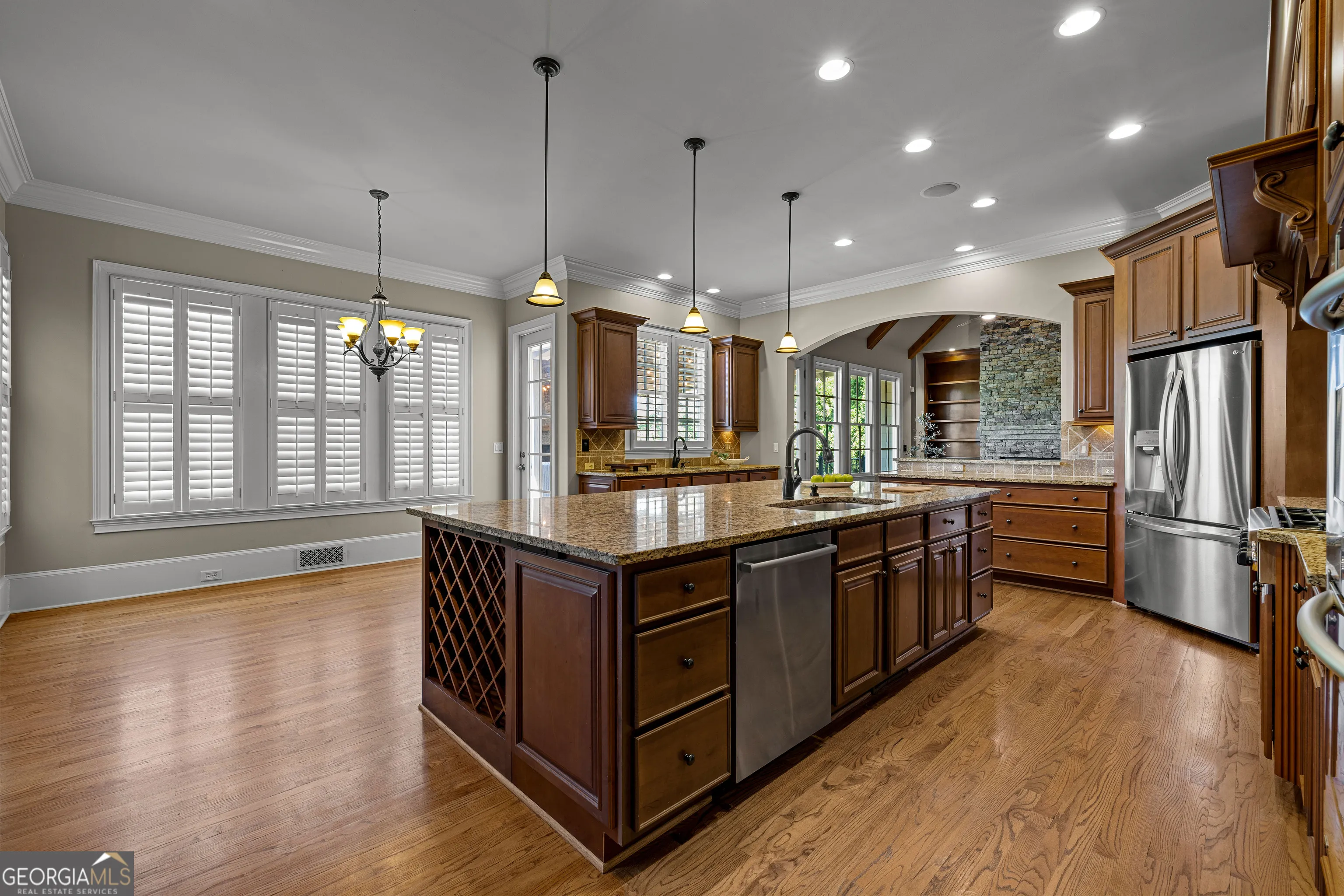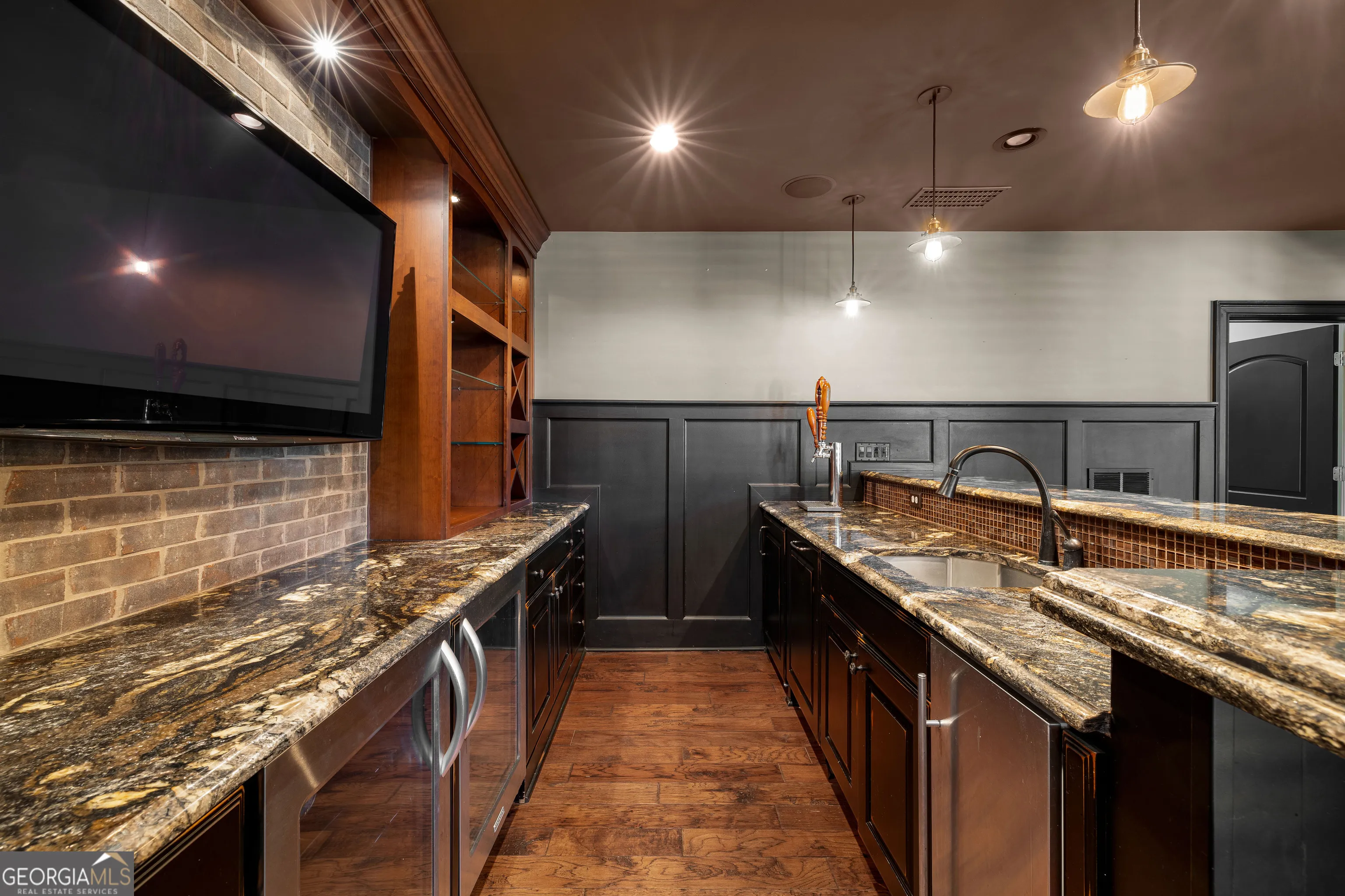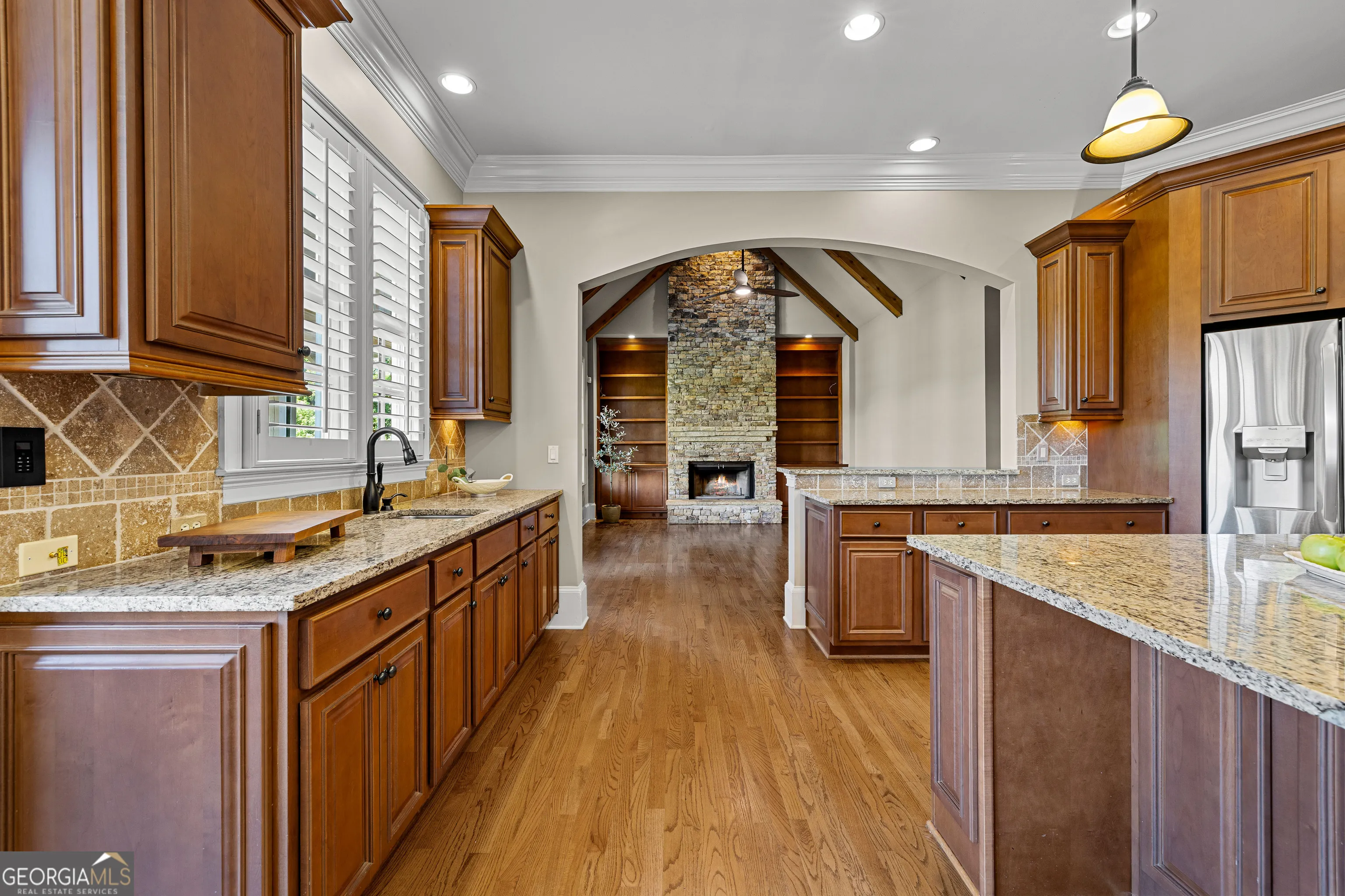 Set on five acres, this amazing custom estate is designed for elevated everyday living and unforgettable entertaining! This property checks every box with a gunite pebbletech pool & spa, three floors of living space includes: 7 bedrooms, 5 full baths, 2 half baths, 6 fireplaces, 3 laundry rooms, library, keeping room, theater room, billiard room, full bar and lounge! The perfect blend of luxury and function both inside and out. The main level features a two-story double door front entry to the grand staircase, hardwood floors, coffered ceilings, and a beautiful, well-appointed kitchen anchored by an oversized granite island with seating and built-in wine rack. Multiple gathering spaces including a keeping room offers functionality and sophistication with custom bookcases and a stone fireplace, and the main living room boasts floor-to-soaring ceiling windows with its own fireplace. The main level is complete with a library or dedicated office space, formal dining room with butler’s pantry, and tiled mudroom with open shelving pantry, standalone deep freezer and standalone refrigerator, custom drop zone, and direct access to all 4 car garages. The bedroom on main offers flexibility with a full bath, custom closet, and a private balcony. Beautiful hardwood flooring continues upstairs to the primary suite – a true retreat with a spacious sitting area, fireplace, private balcony overlooking the pool, whirlpool bath, separate tiled shower, dual vanities, and custom his & her closets with granite dresser and peninsula. Three generously sized secondary bedrooms, laundry room with storage, private loft area, and a rear staircase enhance comfort and flow to complete the upstairs. The finished terrace level is designed to impress, featuring a full theater room, lounge, billiards area, half bath, and a phenomenal custom granite bar complete with sink, dishwasher, dual mini refrigerators, ice machine, and a three-tap kegerator. Two terrace level bedrooms with a full bath, have direct pool access via french doors. Enjoy your private luxury resort with a backyard thoughtfully designed for year-round enjoyment featuring a two-story 20′ porch with a wood-burning fireplace patio and a separate covered and beamed deck with gas fireplace offering deep shade and no shortage of space to entertain. Layered outdoor experiences from the massive gunite pool with tanning ledge, hot tub, and waterfall features to the kitchen herb garden, charming brick archways and sitting areas, meticulous landscaping, and serene pastoral views from every angle. A generous 4 car garage with a oversized storage area provides an accommodating space for everyone’s vehicle and tools. This expansive 5 acre lot has no HOA and is a rare offering of privacy, scale, and lifestyle that stands alone!